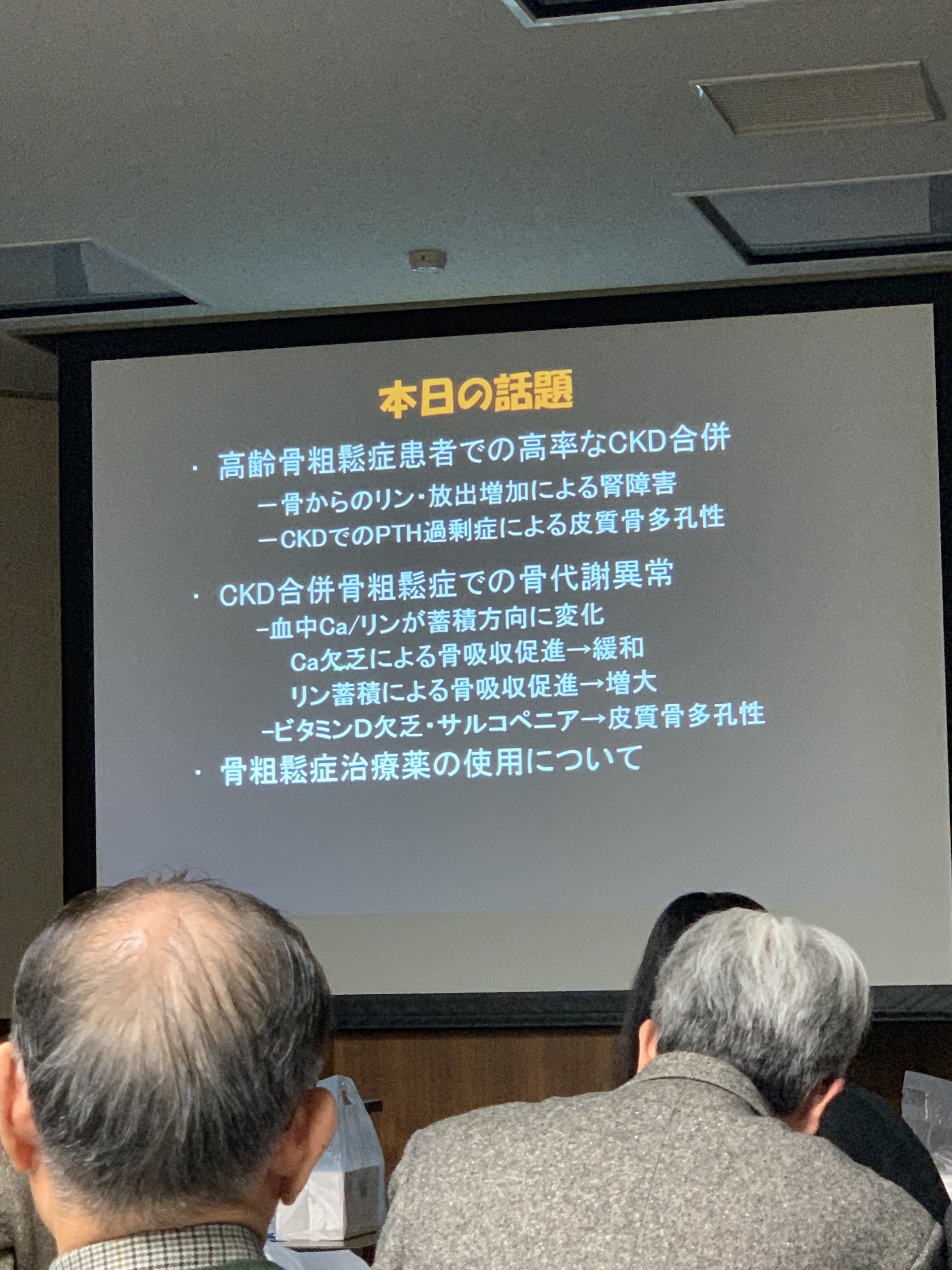 同日19:15より、鈴鹿市医師会会館2階にて、第6回鈴鹿市骨粗鬆症連携ネットワーク研究会に参加してきました。第一三共株式会社の骨粗鬆症治療薬プラリアとビスホスホネート製剤との骨密度増加効果の比較についての説明を受けました。また、三重大学大学院医学研究科口腔・顎顔面外科学教授新井直也先生を迎え「薬剤関連顎骨壊死ポジションペーパー2016の要点」の講演がありました。また特別講演に大阪市立大学大学医学研究科代謝内分泌病態内科学教授稲葉雅章先生の「CKD高率合併を考慮した高齢骨粗鬆症の治療戦略」の講演を聞きました。閉経後の女性は骨粗鬆症になるリスクが非常に高く骨粗鬆症治療薬の必要性があります。骨粗鬆症治療薬は血中に流れ出すカルシウムやリンを抑制する効果があり、腎機能が低下した患者さんの血管硬化を防ぐ作用につながるなど興味深い講演内容でした。