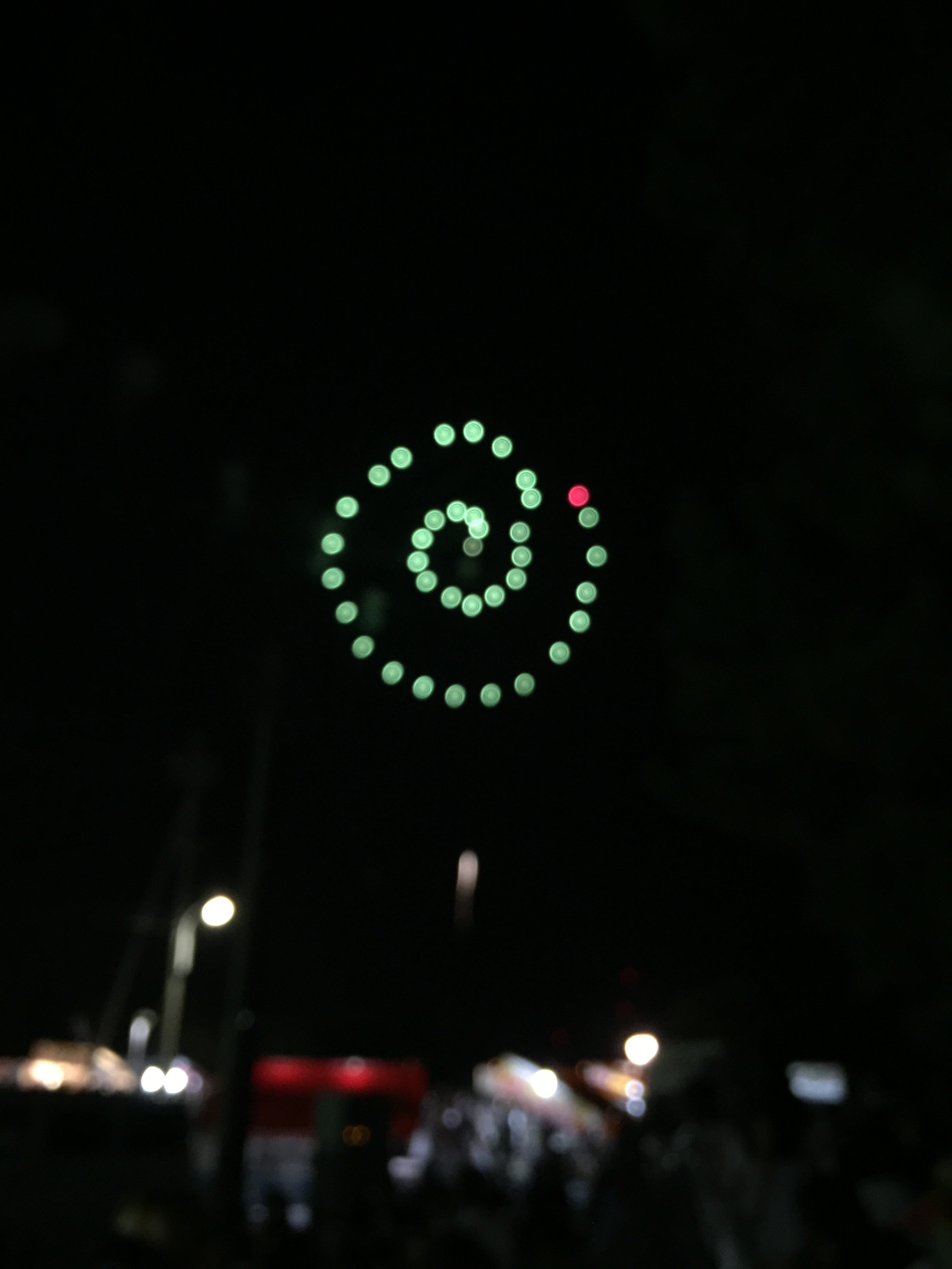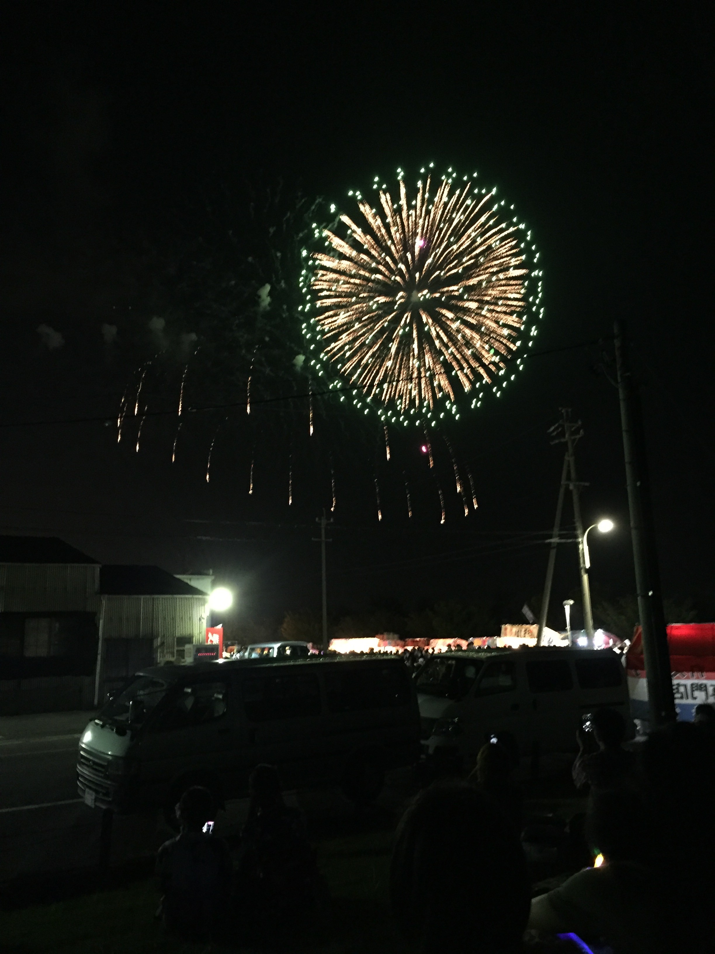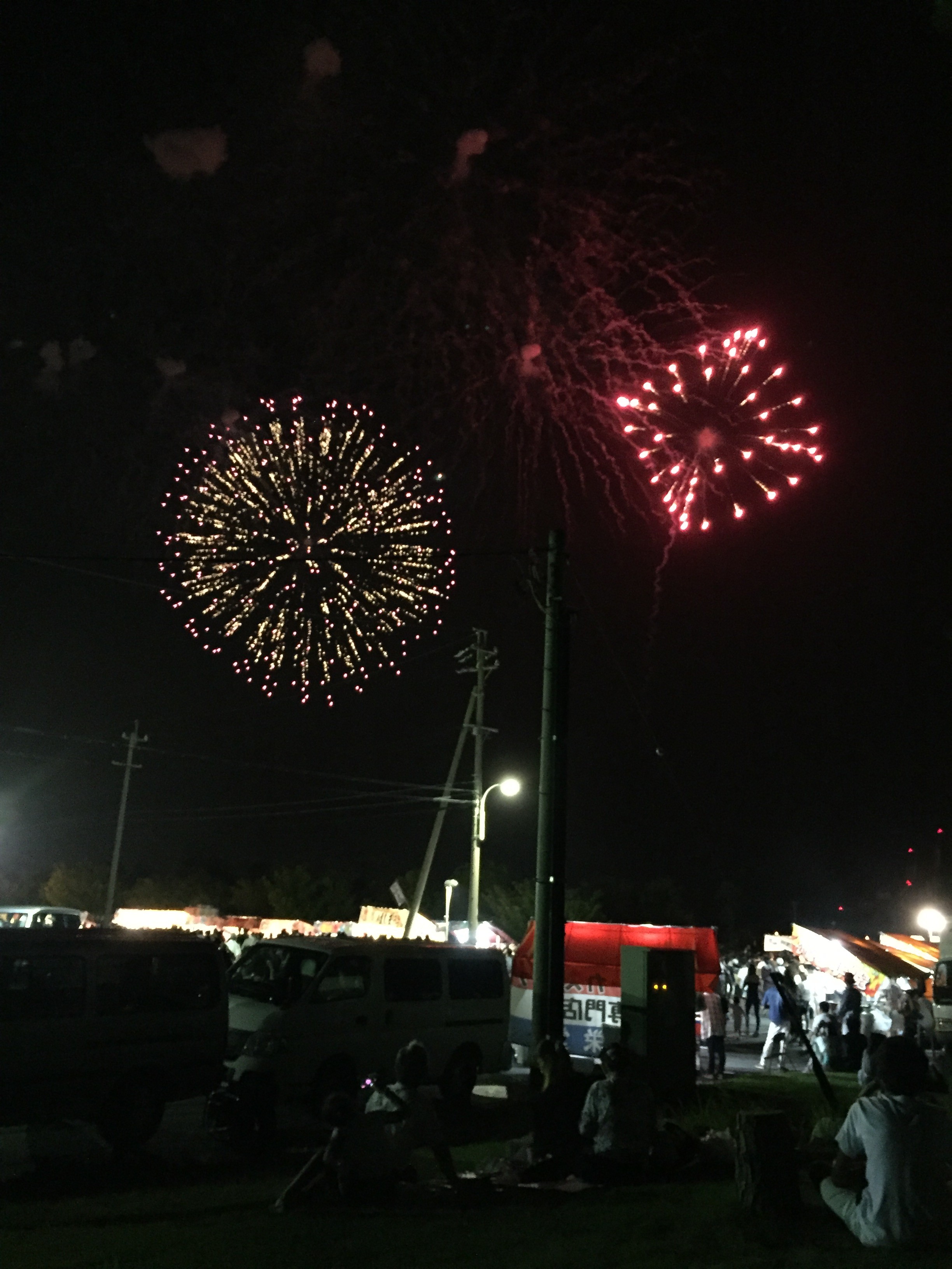 pm7:15打ち上げ始まりです。大音響と新作花火に大興奮です。中でも、蚊取線香の形、四角い形の花火はビックリでした。