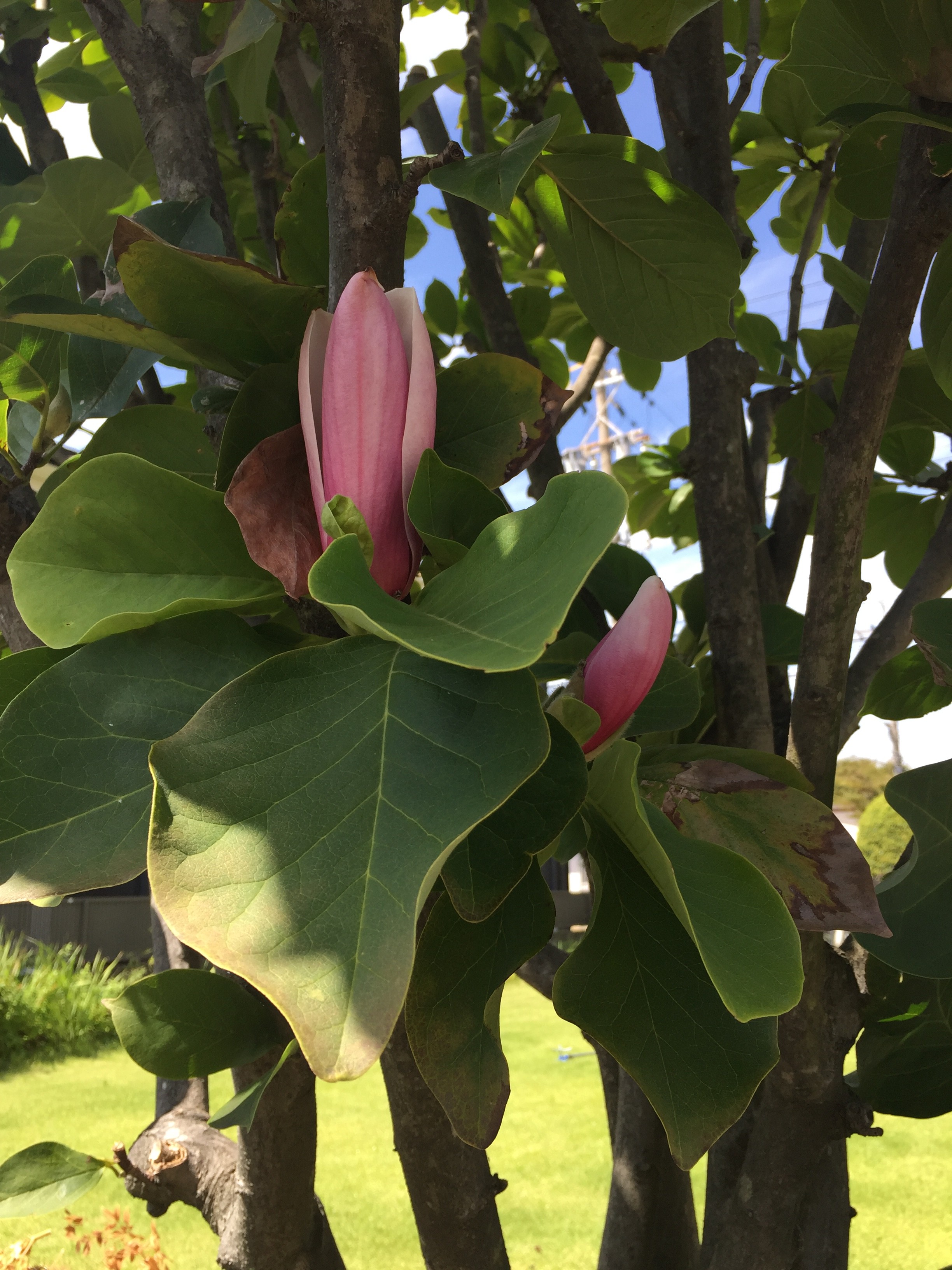 先日、高枝バサミで剪定したばかりの青深緑色の木蓮の木をふと見ると、鮮やかな濃いピンク色の花をブローチの様にアクセントとして咲かせているではありませんか。
