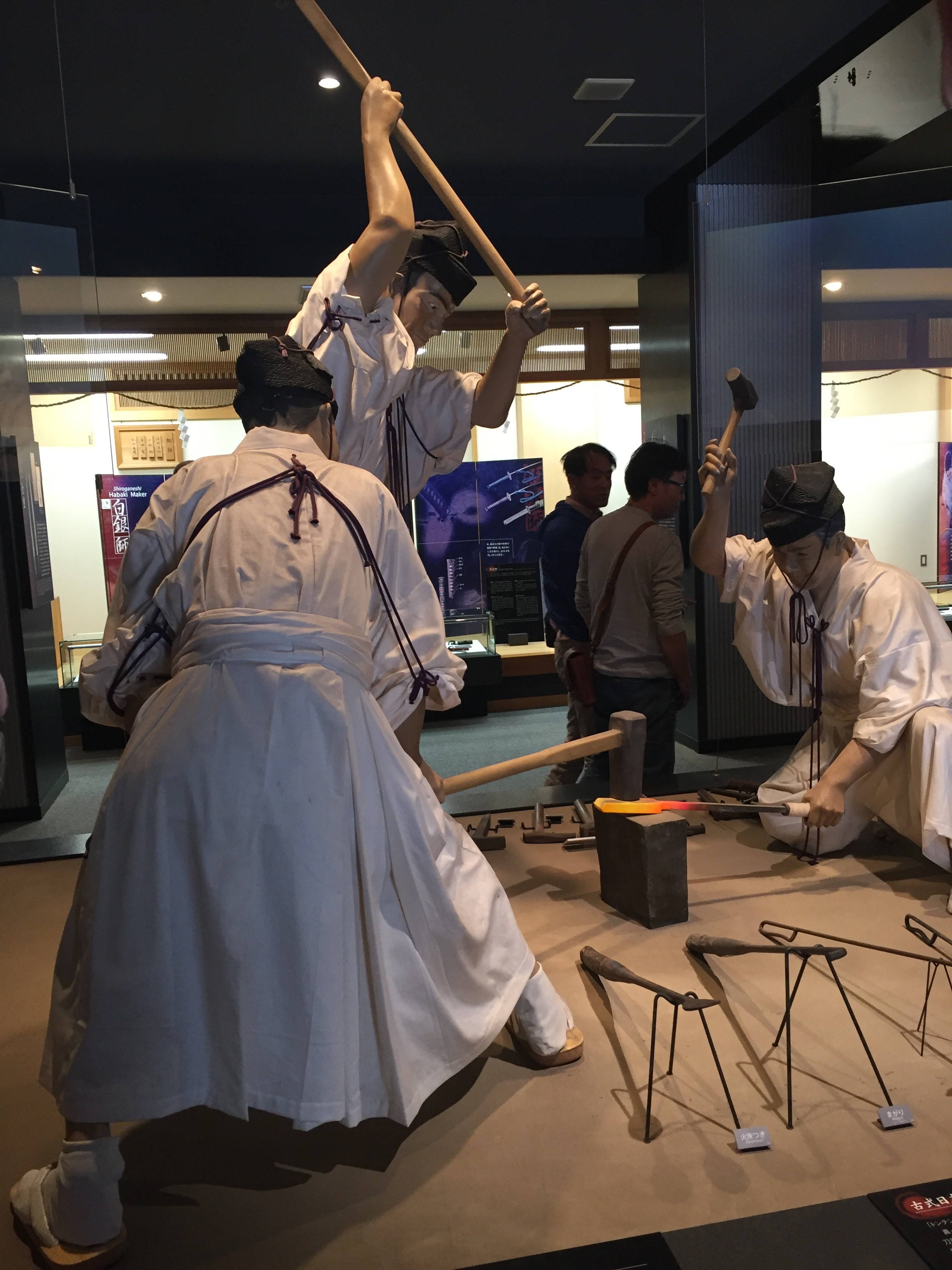 勉強会の後は旅行です。昼食を兼ねてお千代保稲荷さんへ行きました。50円でロウソクと揚げさんを買い、事業の繁栄を祈願しました。参道の土産物屋さんでは、煎餅🍘の割れがしや、たくあんの漬物を買いました。昼食は串カツで有名な玉屋さんに行きました。榮家は、串カツは西参道の「たき」で食べるのですが、金ピカで有名な店内の玉屋さんは初めてでした。トイレの中まで金ピカにはビックリし、豊臣秀吉になった気分になりました。次に行ったのは、関鍛治伝承館で刃物の歴史や、鍛治職人の技を見学しました。