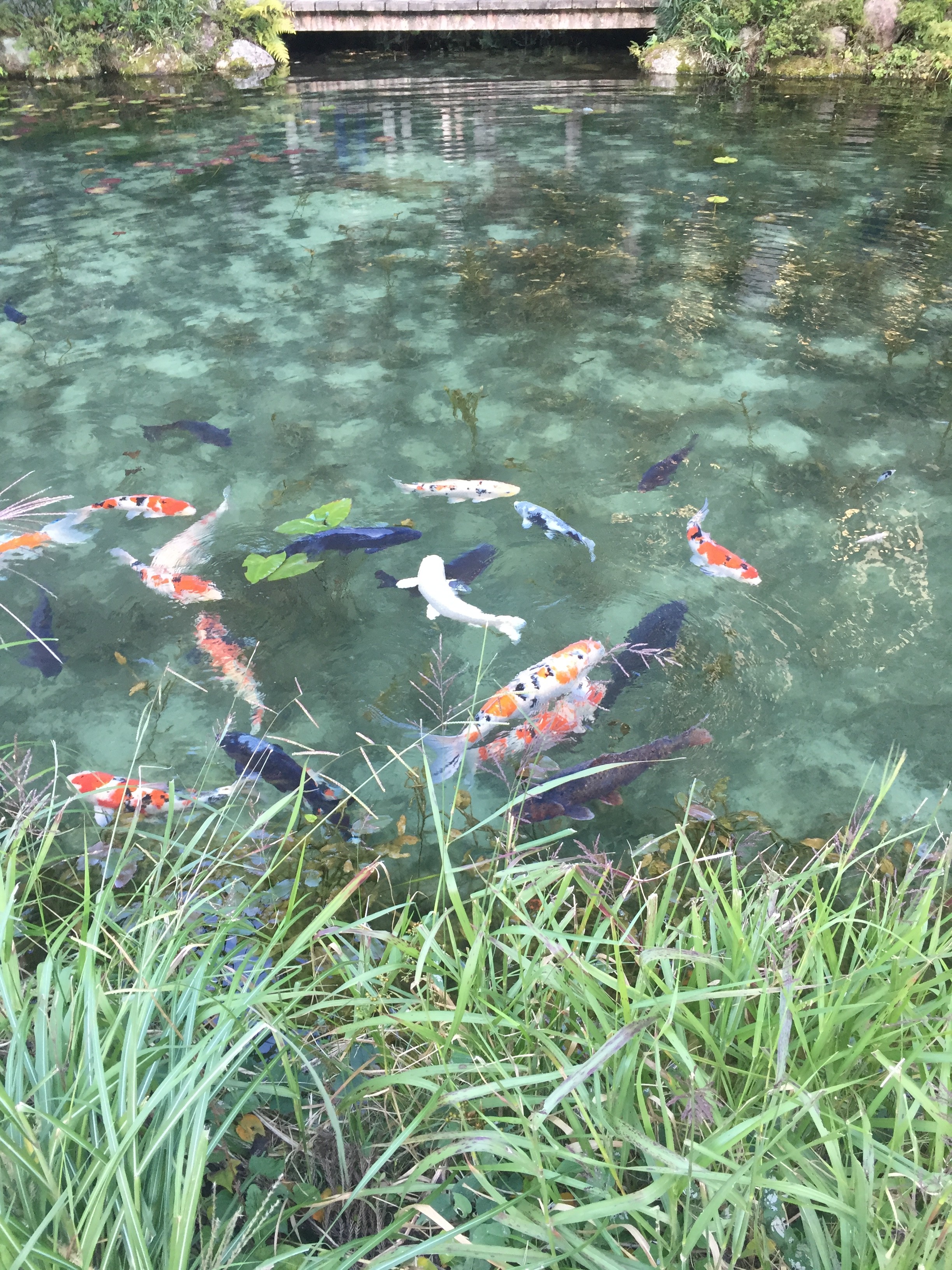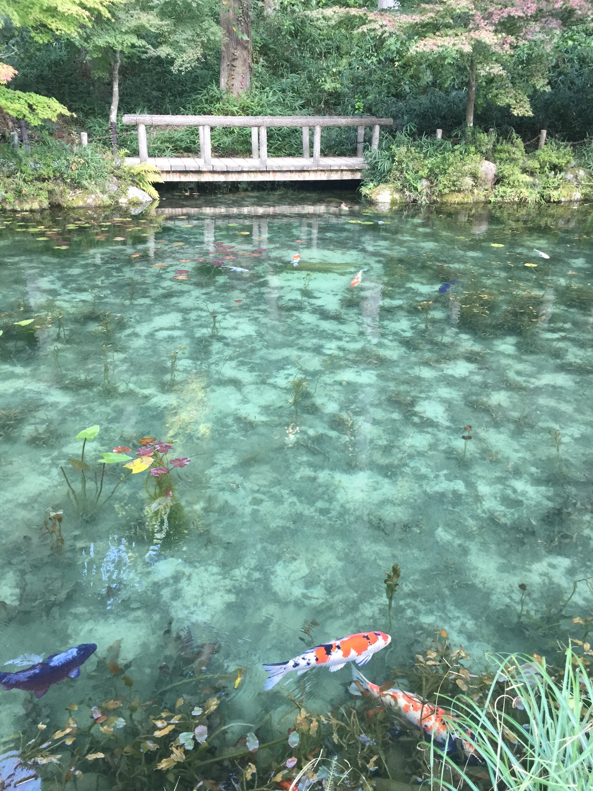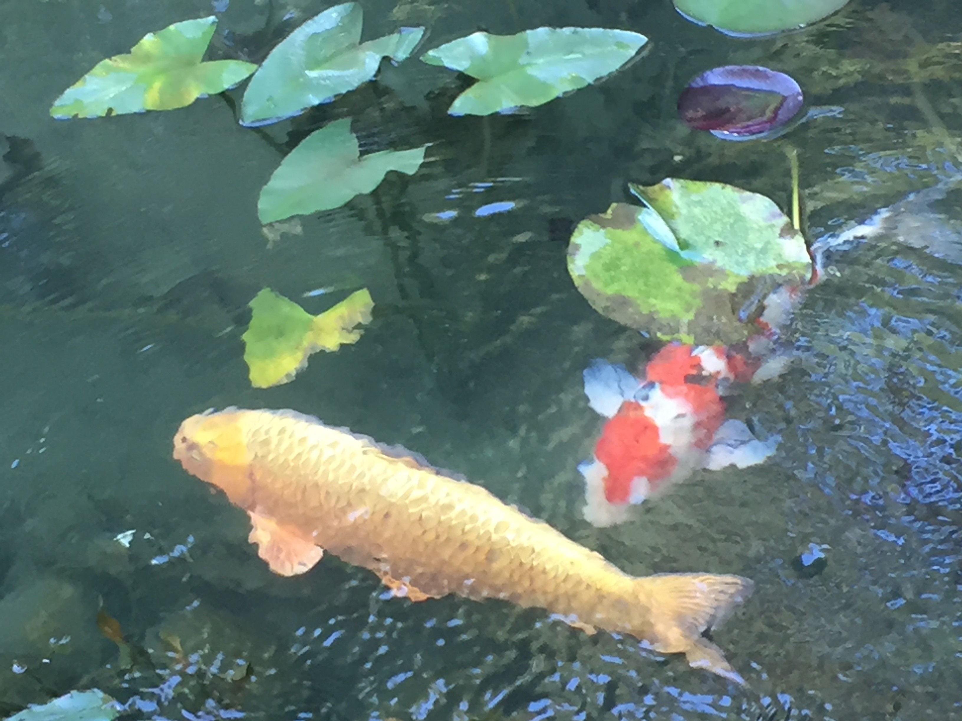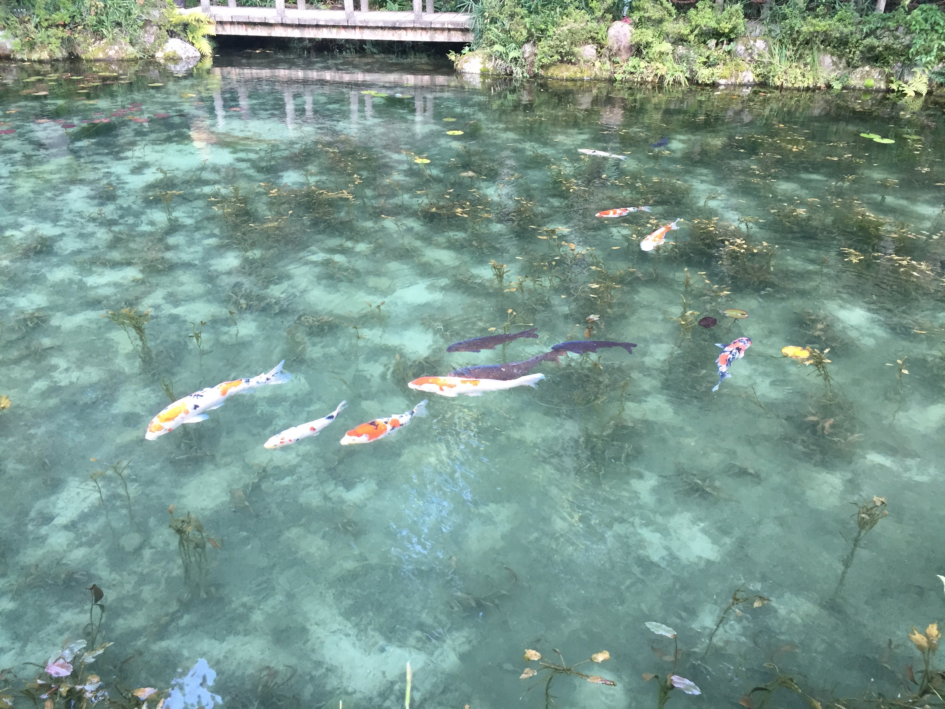 関市からバスで長良川沿いの国道を1時間位走って行くと、今話題の『モネの池』があります。透き通った山水の池に睡蓮の葉が浮かび、色鮮やかな錦鯉が優雅に泳いでいました。肉眼で見た時には、それほど感動するような池には思えませんでしたが、デジカメ📷で撮影すると、不思議な事にとても綺麗な絵🖼になります。面白くなって何枚もシャッターを押しました。