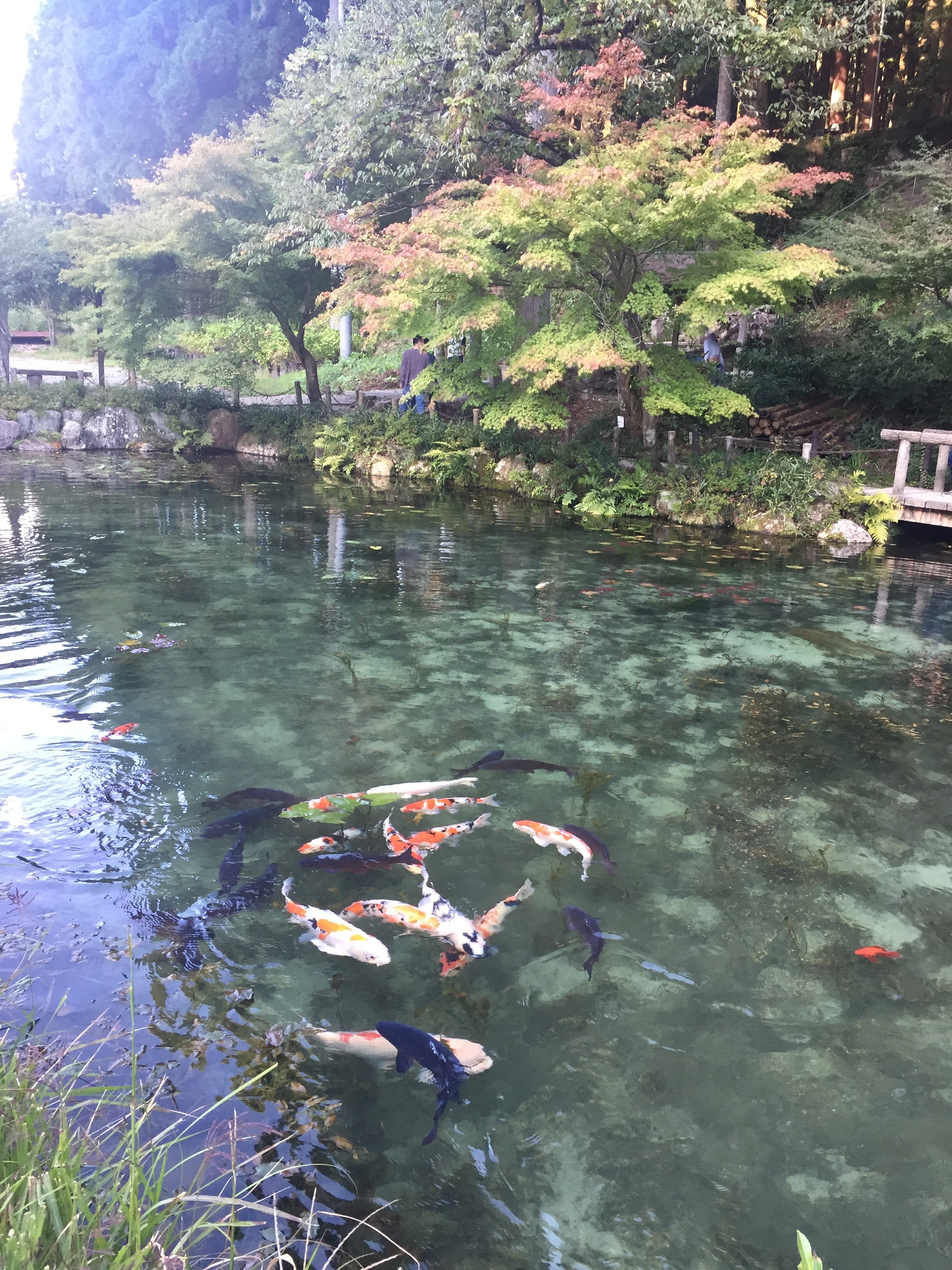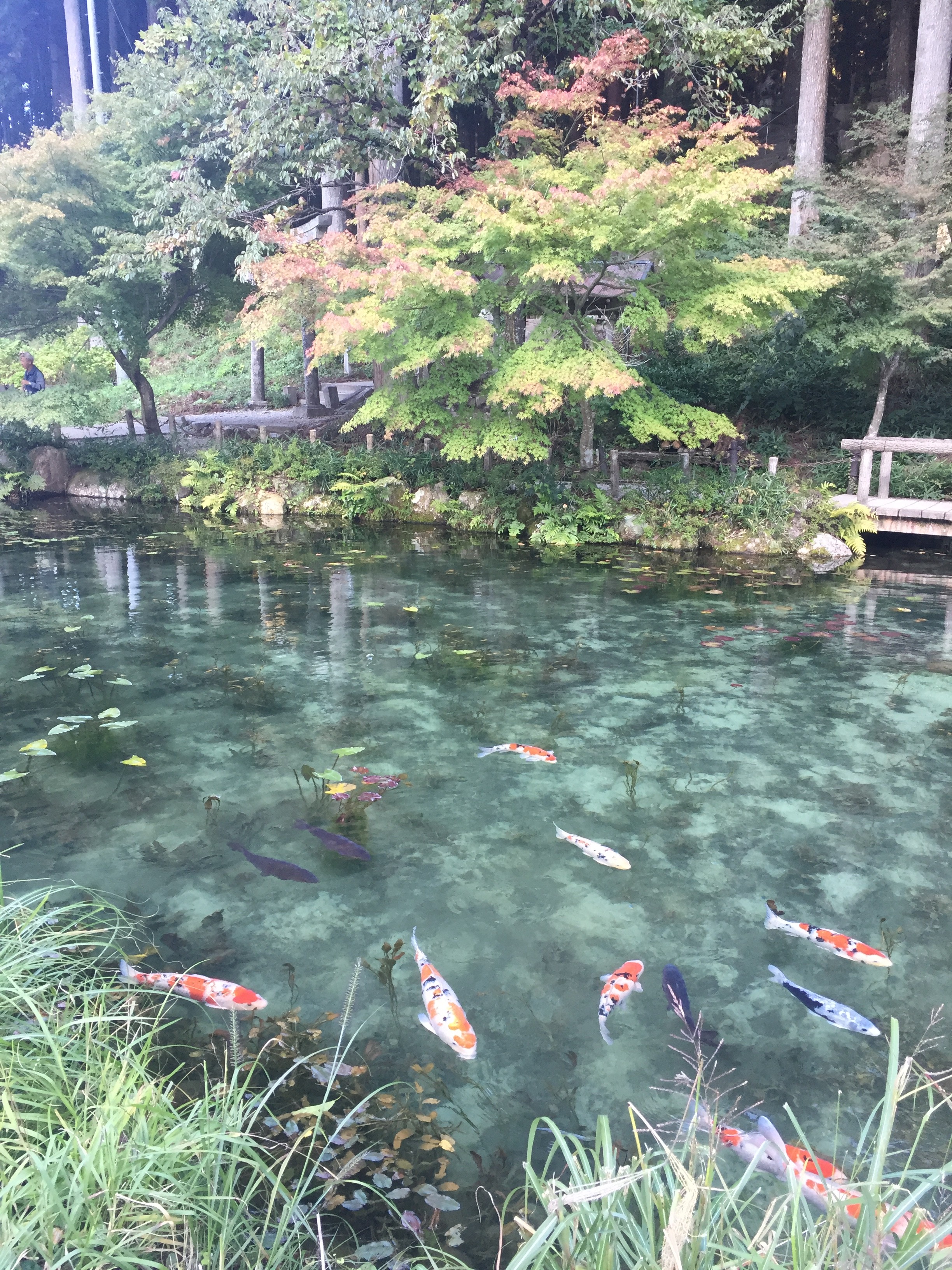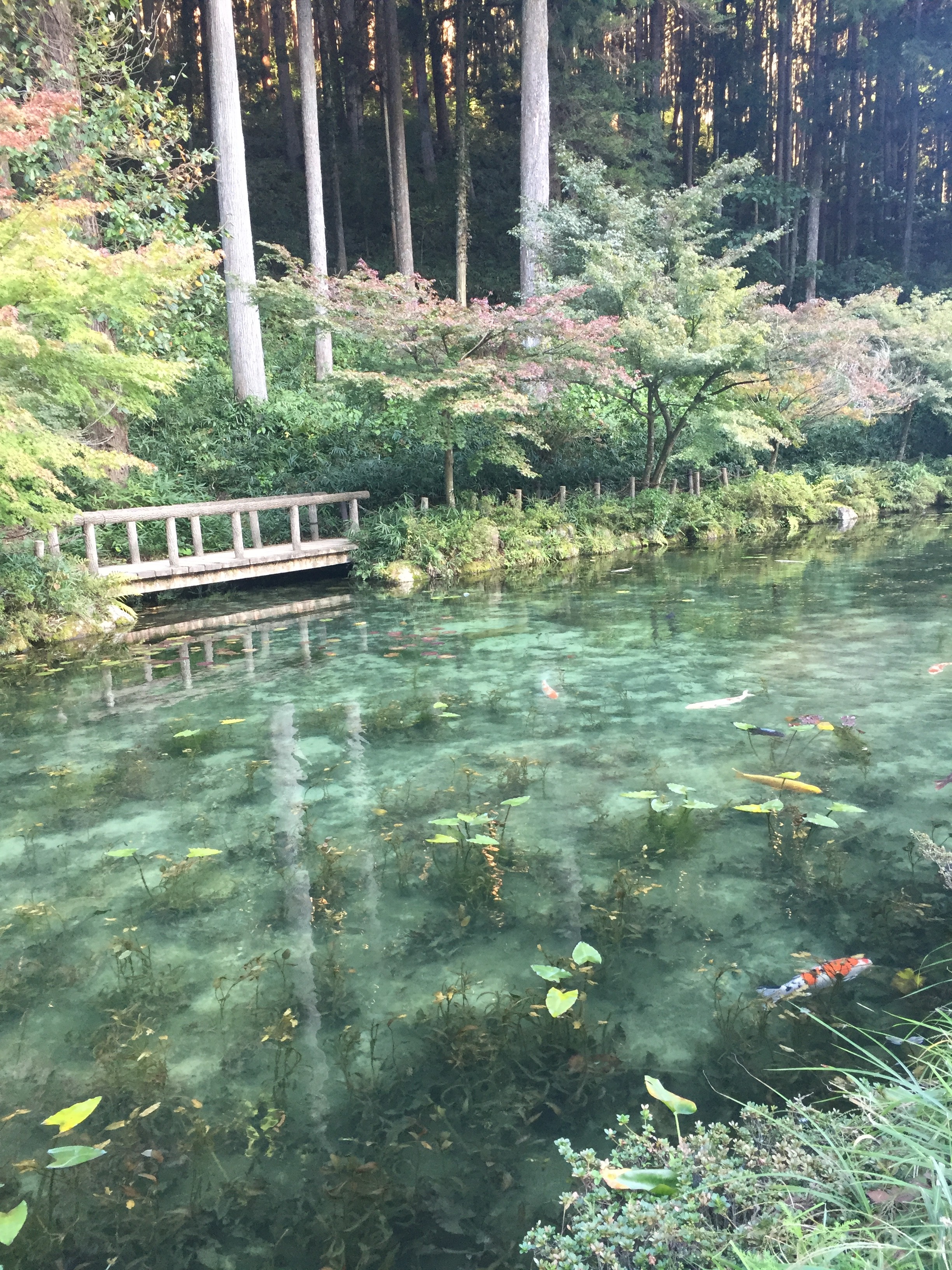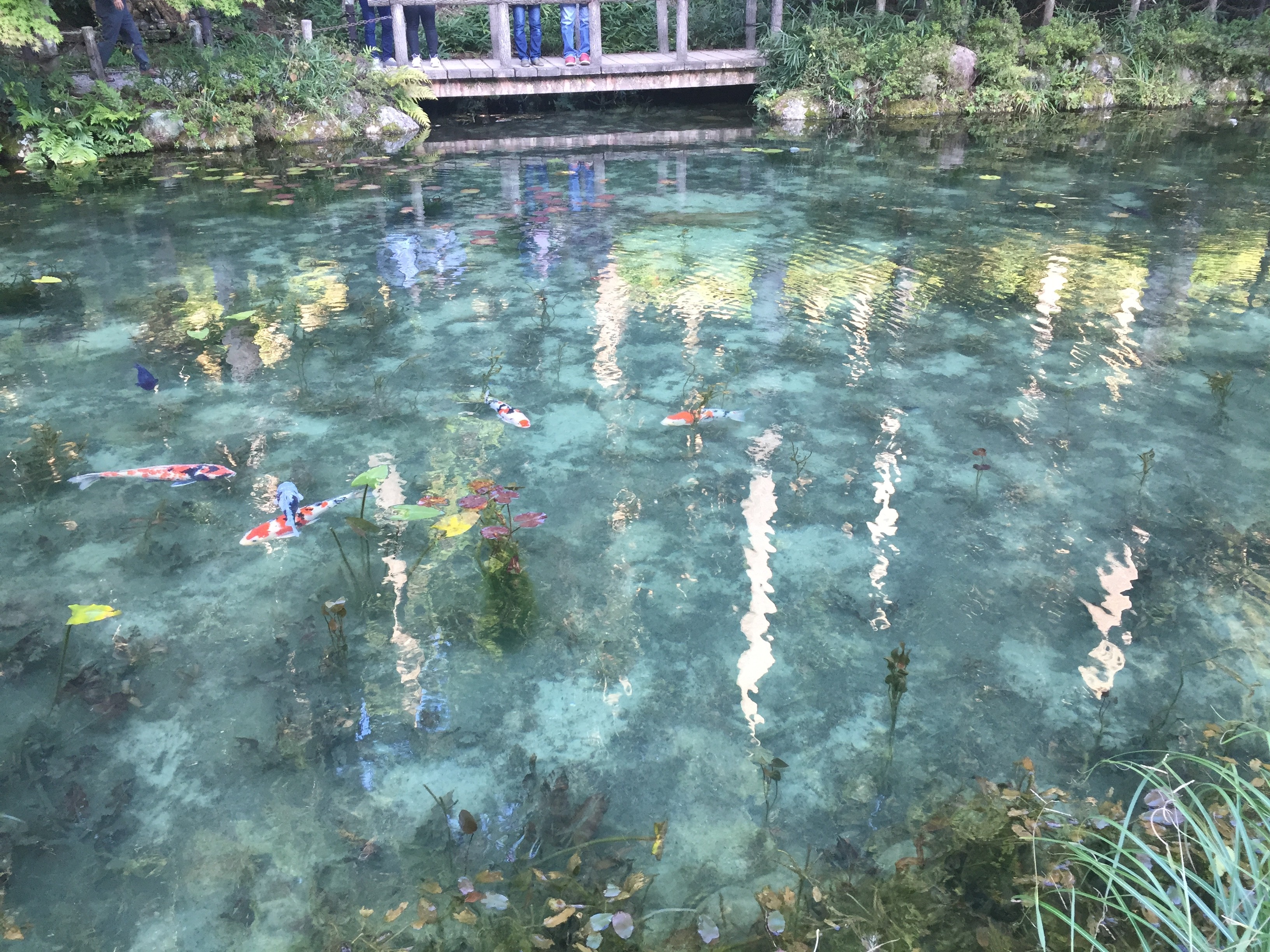 関市からバスで長良川沿いの国道を1時間位走って行くと、今話題の『モネの池』があります。透き通った山水の池に睡蓮の葉が浮かび、色鮮やかな錦鯉が優雅に泳いでいました。肉眼で見た時には、それほど感動するような池には思えませんでしたが、デジカメ📷で撮影すると、不思議な事にとても綺麗な絵🖼になります。面白くなって何枚もシャッターを押しました。