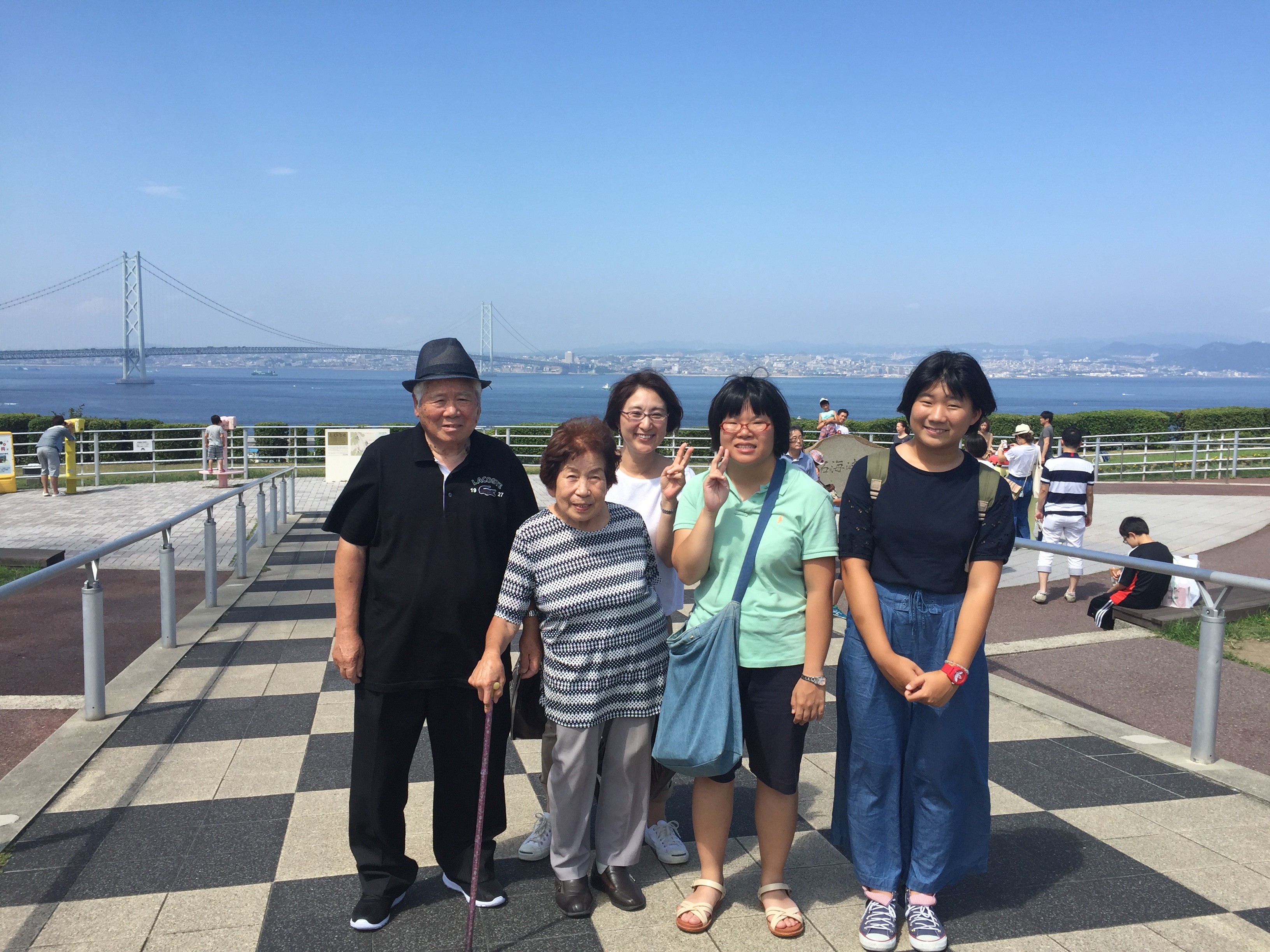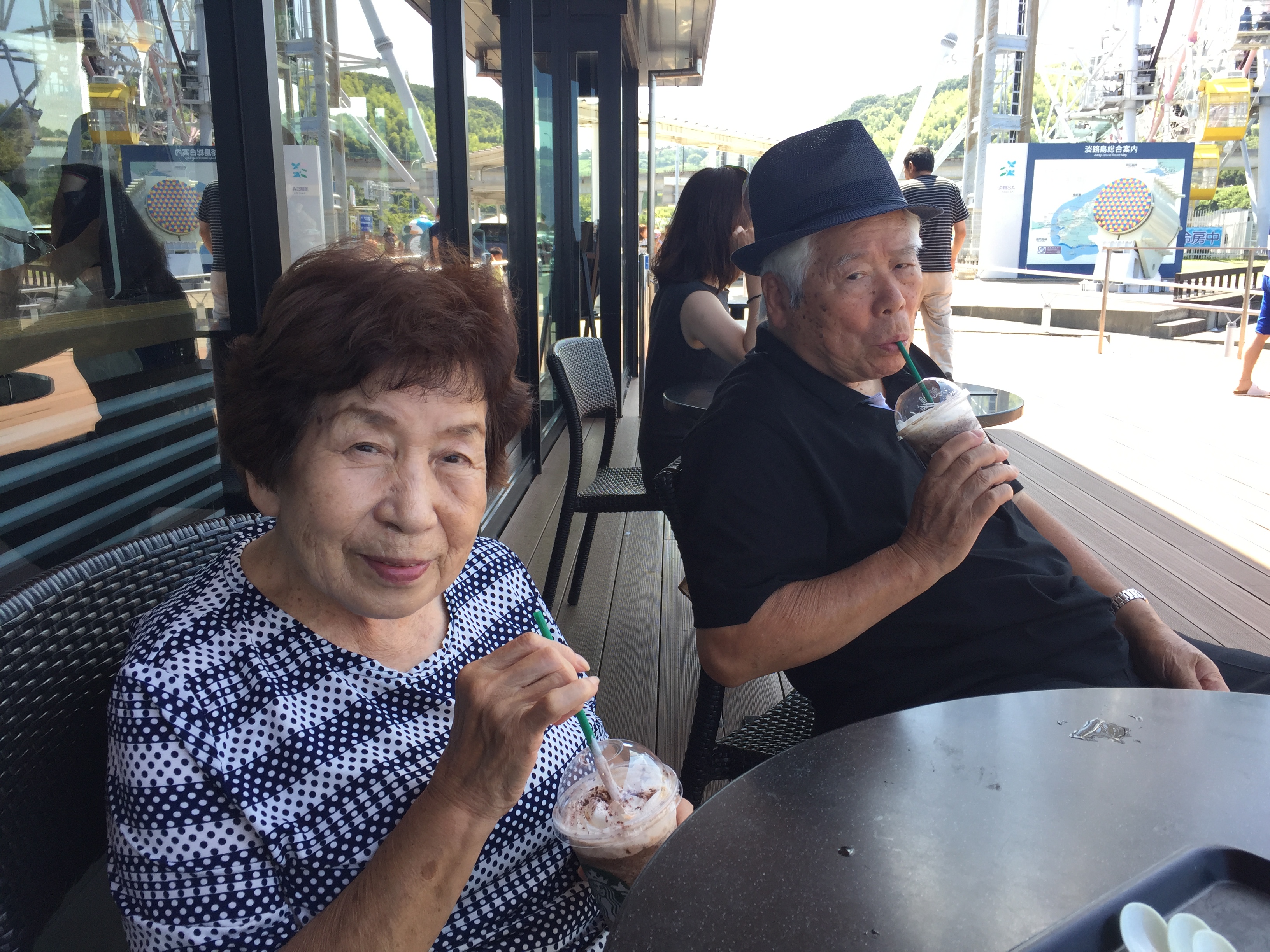渋滞の明石海峡大橋を渡り、淡路サービスエリアで休憩です。記念撮影をし、チョットリッチにスターバックスで、ダークモカチップフラペチーノを皆んなでワイワイ飲みました。80を超えた両親にとってはインパクトがあったみたいです。「こんな、美味しいのたべた事ないなぁ。このプラスチックの蓋は外すの?いくらしたん?高かったんちがうん。なんて言う飲み物?」「490円!」「えっ!カツ屋のカツ丼食べれるやん。」とても楽しそうでした。