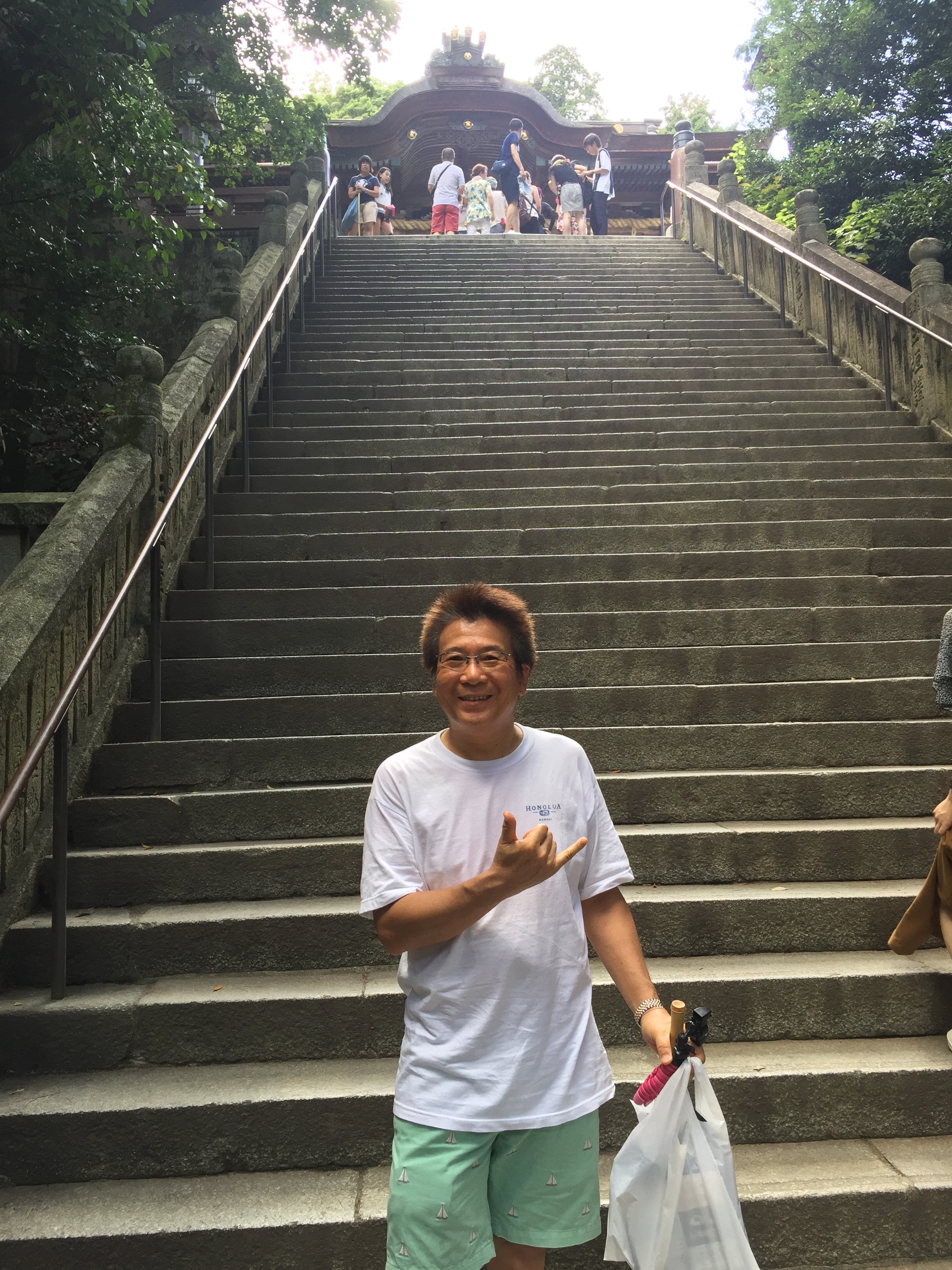 次の目的地は、金毘羅さんです。高松から1時間半くらい車🚗を走らせて金毘羅さんに向かいました。そこで気がついたのが香川の山は、日本昔話を出てくる様なおむすび🍙の形をしている山が多い事です。当然、車中は♪坊や〜良い子だネンネしな♪の大合唱からの、「むかーし むかーしの ことじゃった。おじいさんは👴〜」と適当な昔話を創り盛り上がったそうな。再び、ハワイアンをBGMにしておにぎり山🍙を傍らに見ながら田舎道を走りました。