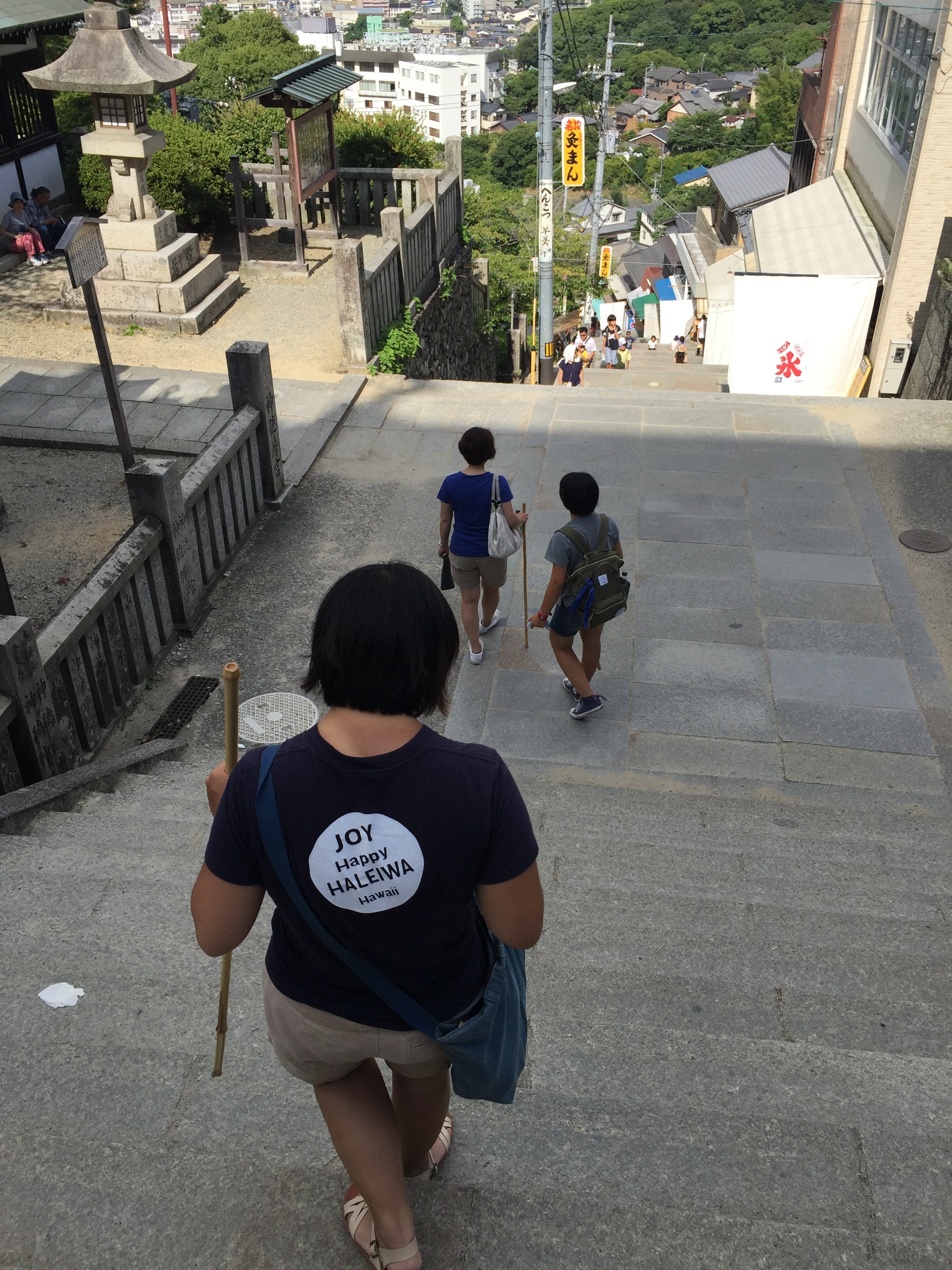 金毘羅さんに到着です。市営駐車場のおじさんに「これを持っていきなされ。」と親切に竹の杖を貸してくれました。これから登る石段の厳しさを示唆して。pm1:30天候は晴れ☀️焼け付く様な暑さ。金刀比羅宮さんの石段を登るには過酷な条件です。でも折角来たのだから、みんな頑張ろうと決意しました。ファイト!一発!全ての石段を登るには1368段!絶対に制覇するぞ!ロッキーのテーマが頭の中で流れてきました。