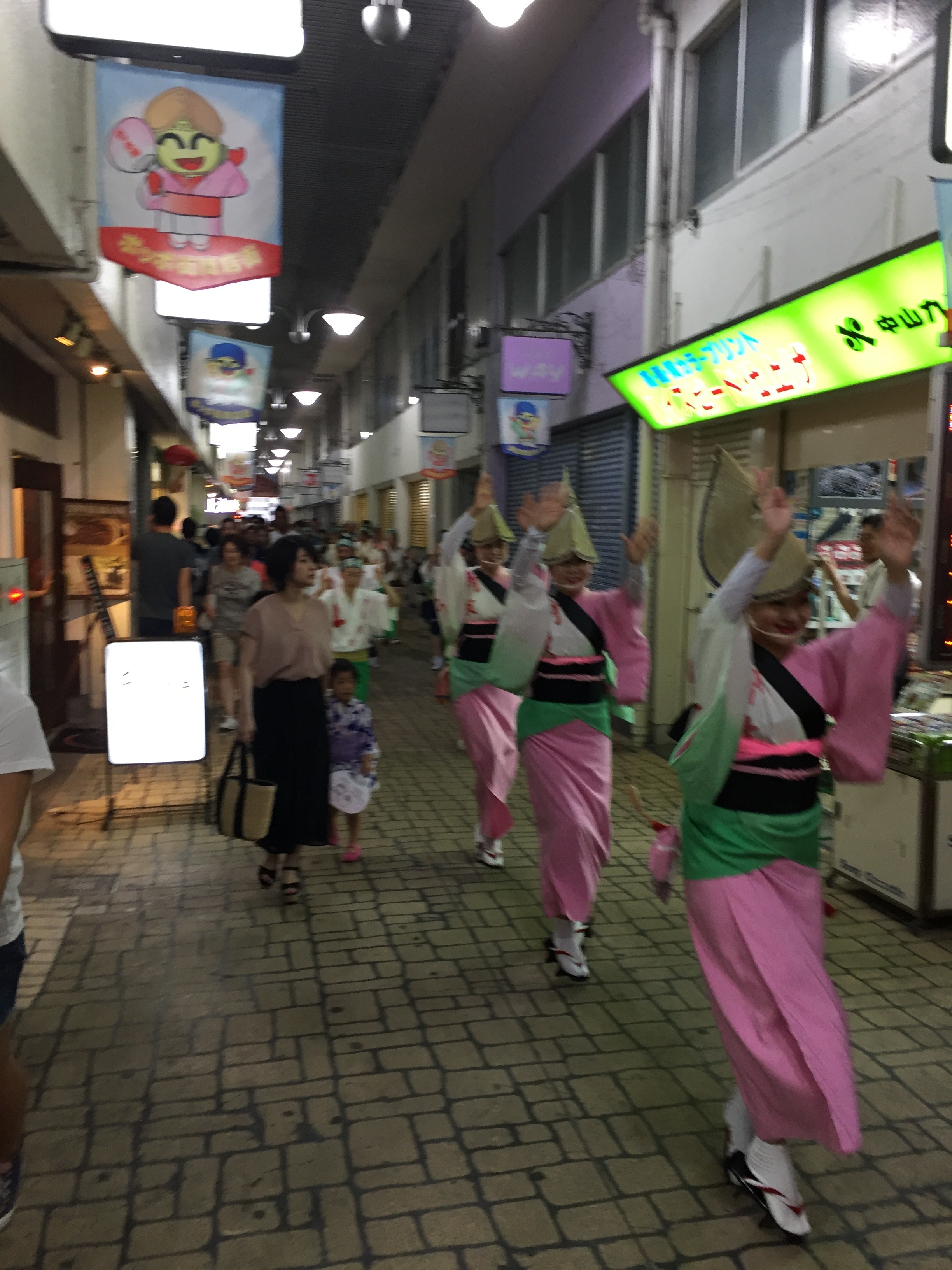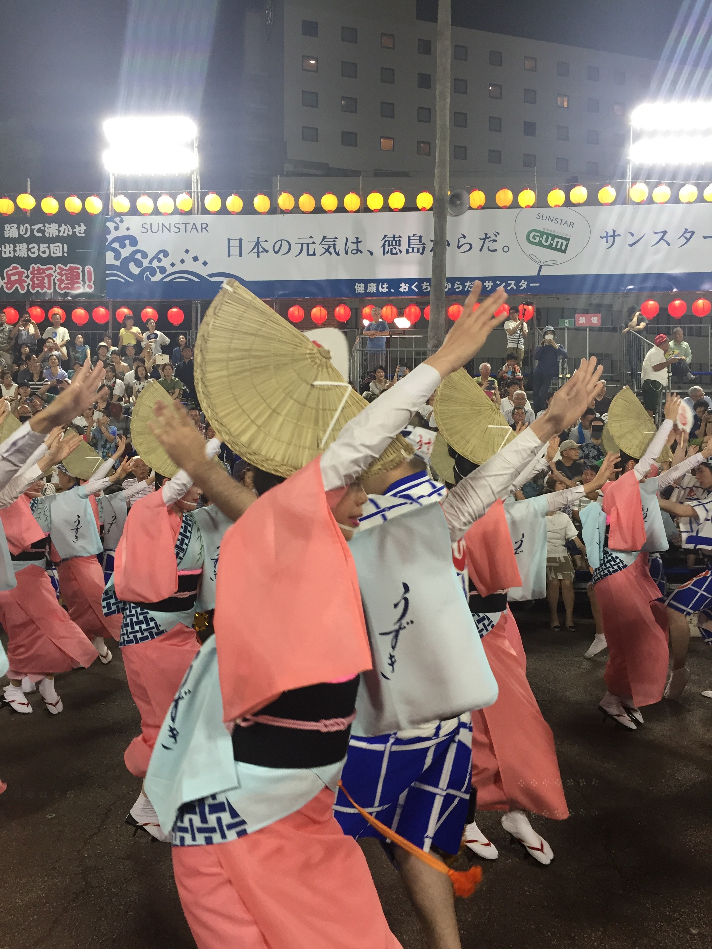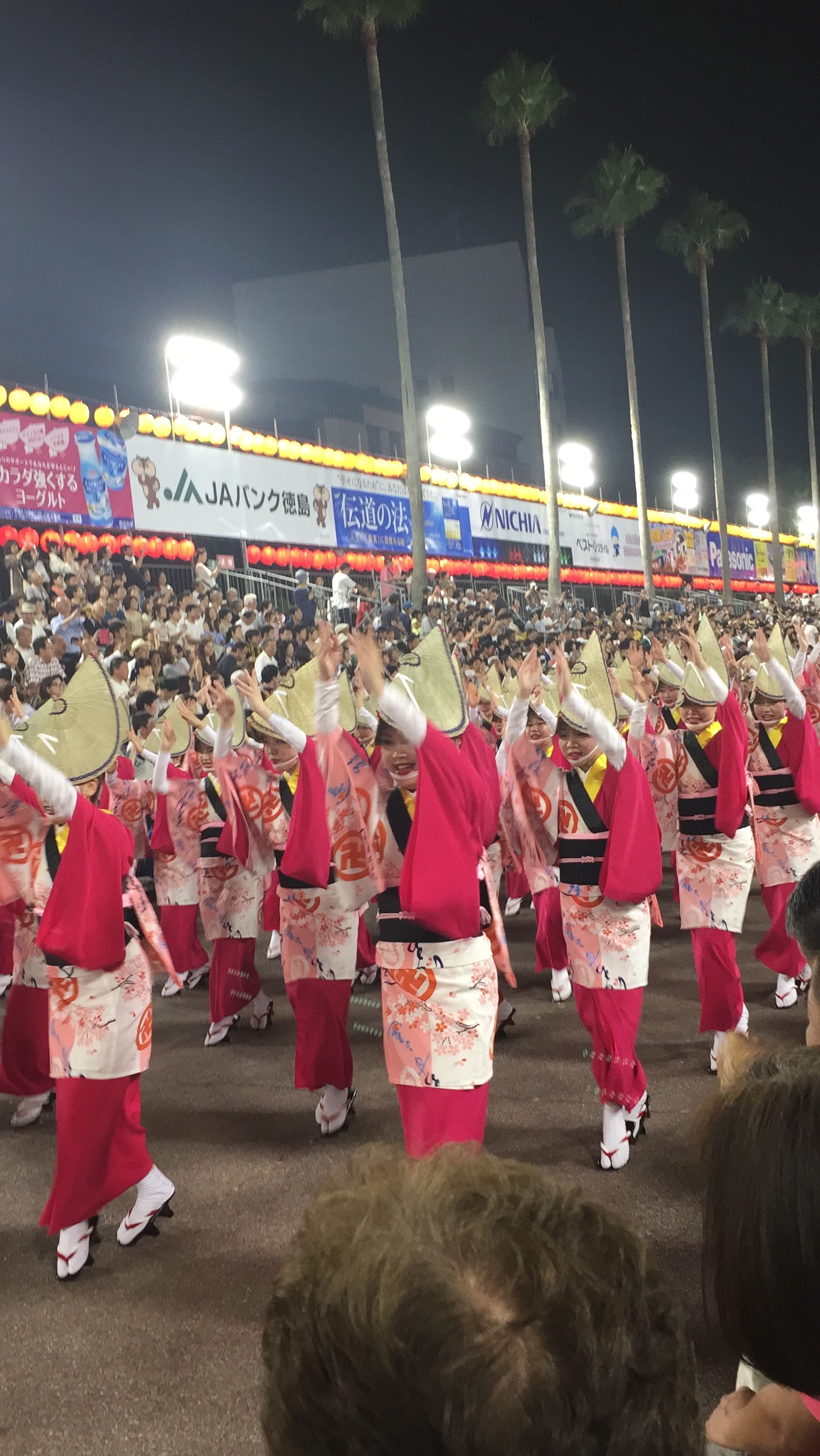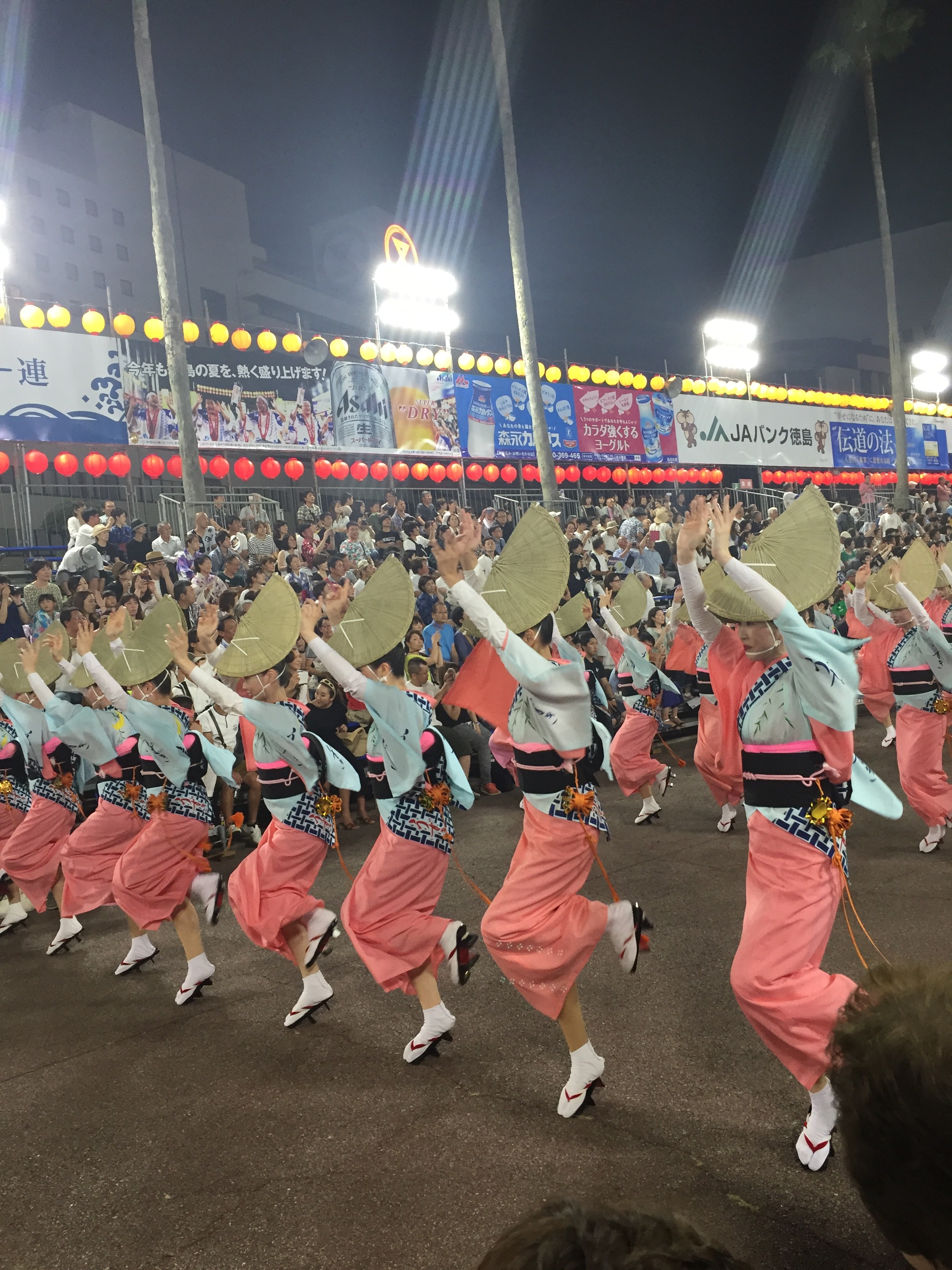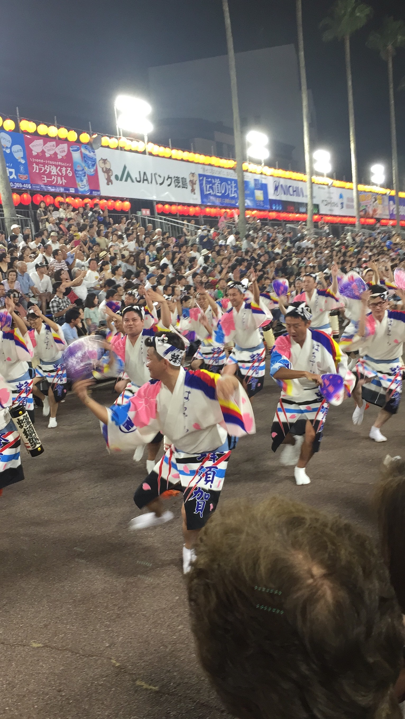 やってきました❗️阿波踊り❗️今回の旅行のメインイベントです。徳島県が一年に一度、世界中で一番燃え上がるカーニバルの時間がやってきました。400年の歴史がある阿波踊りです。期間中には140万人の見物客が訪れ徳島市内は阿波踊り一色になります。市内のアーケード街では鐘🔔と太鼓、三味線の大きなリズミカルなサウンドが聞こえてくると、阿波踊りの列が迫って来ます。気がつくと、その列に強烈な磁石があるかの様に引っ張られていました。両親が徳島出身なので阿波っ子の血が騒ぐのかもしれません。