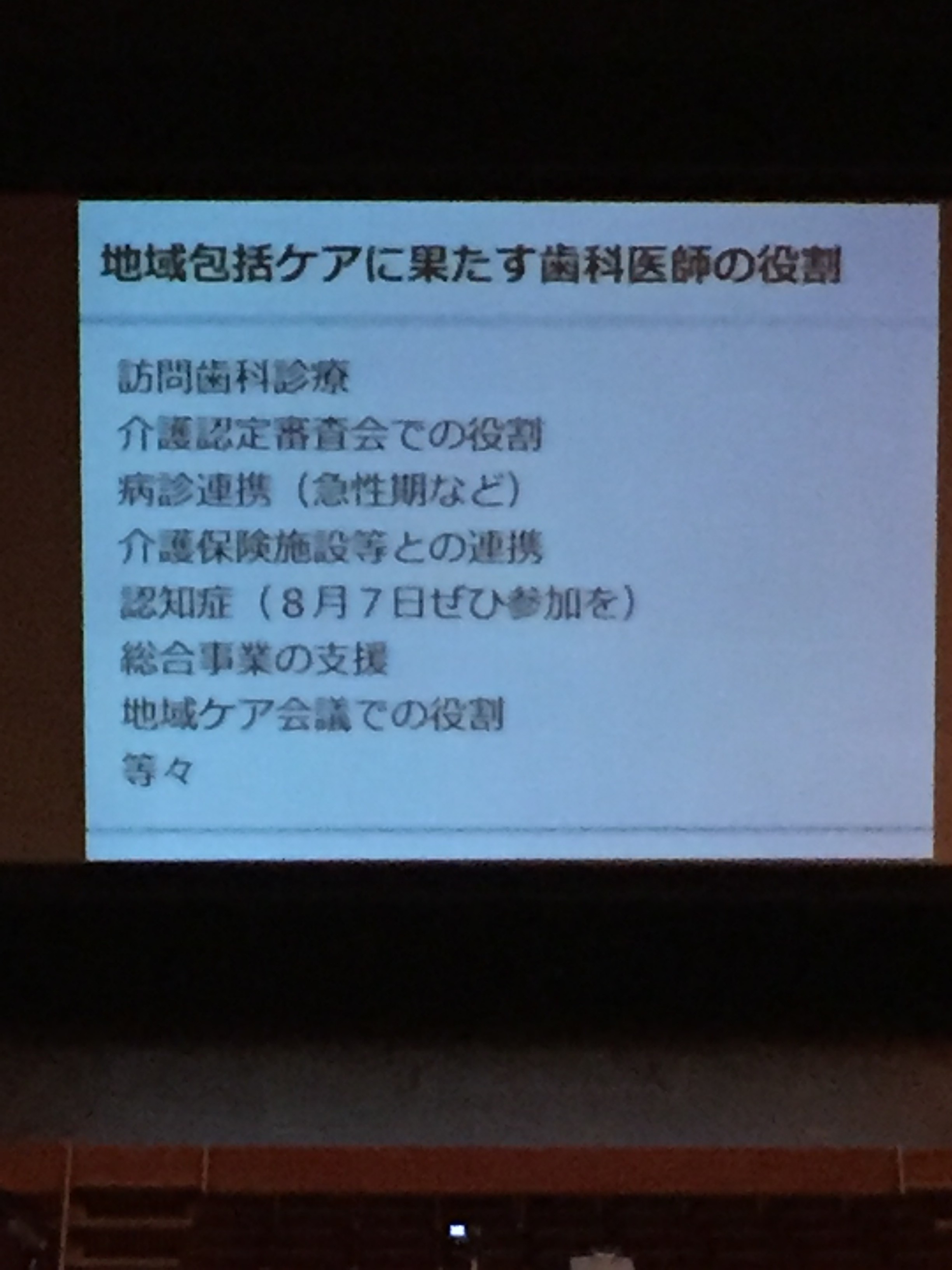今日、三重県歯科医師会館にて13:00〜17:15まで研修がありました。歯科医師認知症対力向上についての内容でした。少子高齢化社会の中で歯科医師の役割ついて考察し、高齢化社会になれば当然、認知症になる患者さんの数も増えてきます。その患者さんに対するアプローチの方法や医科との連携について学習しました。四時間余りにわたるパワーポイントやビデオを混じえた内容は興味深く、明日の治療に直結する非常に役に立つものでした。認知症にも様々なタイプや、程度があり歯科に来院される患者さんの中にその兆候があれば、それを察知し身内の方に伝える事が出来れば早期に手を打てば進行も遅らせる事も可能です。講義に関する冊子を頂き、診療室の傍らに備えておきたいと思いました。