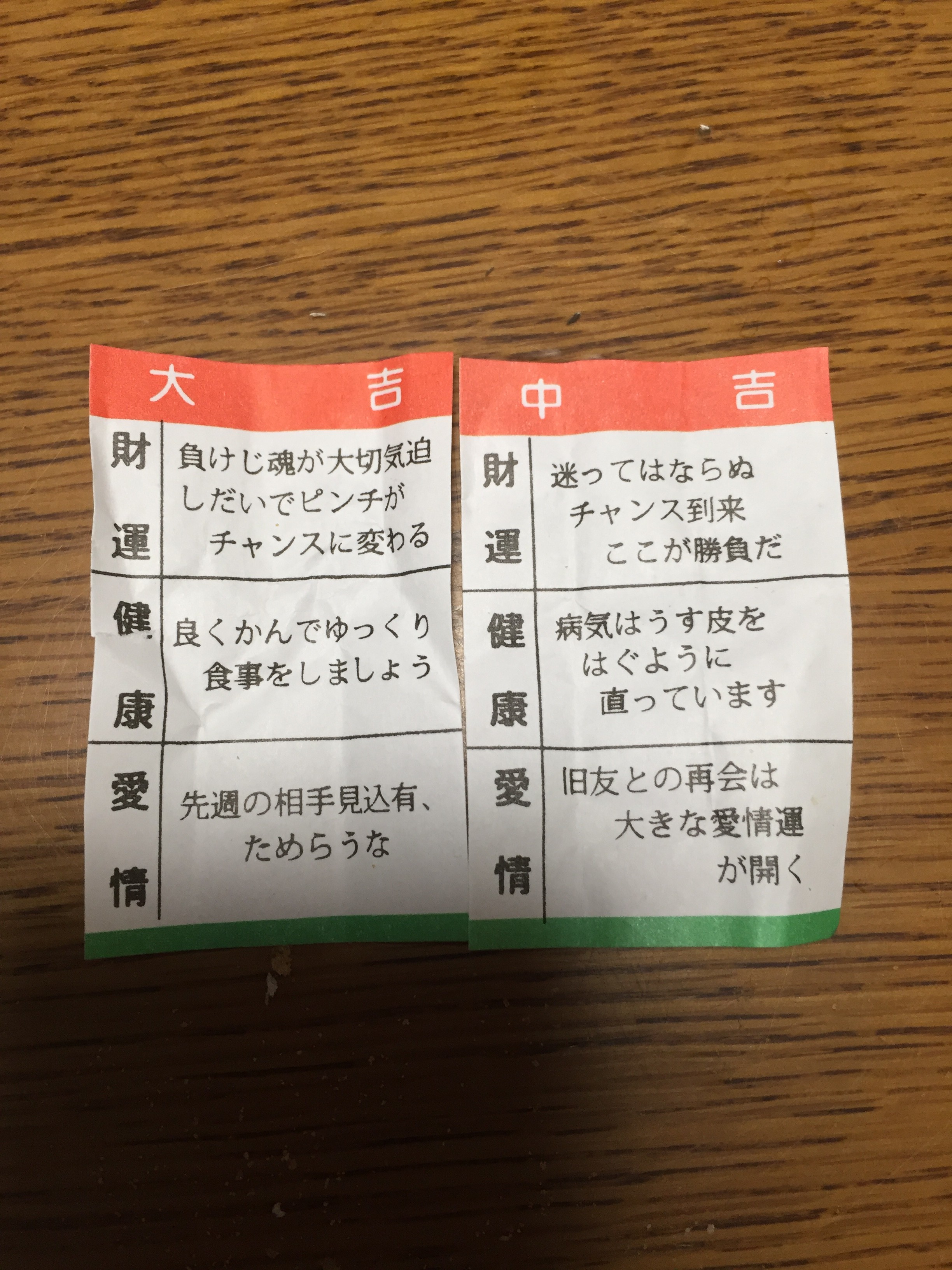 今日患者さんのS野さんから、お伊勢さん詣りのお土産におみくじせんべいをいただきました。スタッフのみんなで運だめしも兼ねて美味しく頂きました。私は大吉、スタッフのSさんは大吉、Sさんは大吉、Tさんは大吉、嫁さんは大吉だったのですが、Aさんだけ小吉だったのです。これでは、あまりにもAさんがかわいそうなのでもう1つ食べてもいいよと、せんべいを割ったらまた、小吉でした。診療中だったので、とりあえずはこのまま過ごしました。しかし、またまたこのままではかわいそうなので診療後に、もう1つ食べてもいいよと・・・・小吉。三回連続で小吉だったのです。奇跡です。ある意味、Aさんは持っているのです。彼女はおせんべいで、お腹がいっぱいになりました。残ったおせんべい3個を家に持ち帰り娘は、中吉、嫁さんは大吉、私は大吉でした。結局、小吉3個全てをAさんが引いたのです。早速、LINEでみんなに業務連絡です。「明日からAさんを呼ぶ時は、A大明神と呼びましょう。」