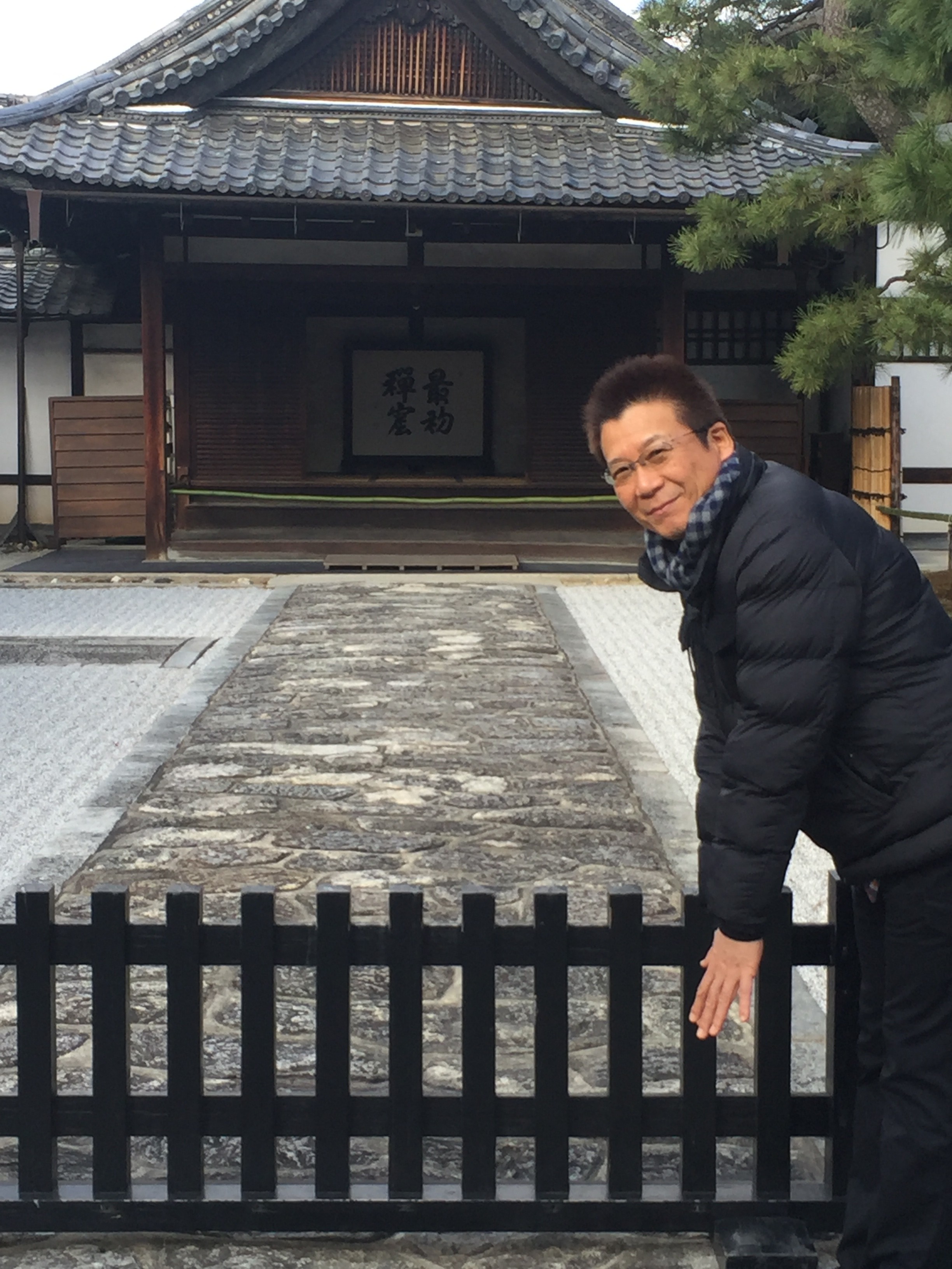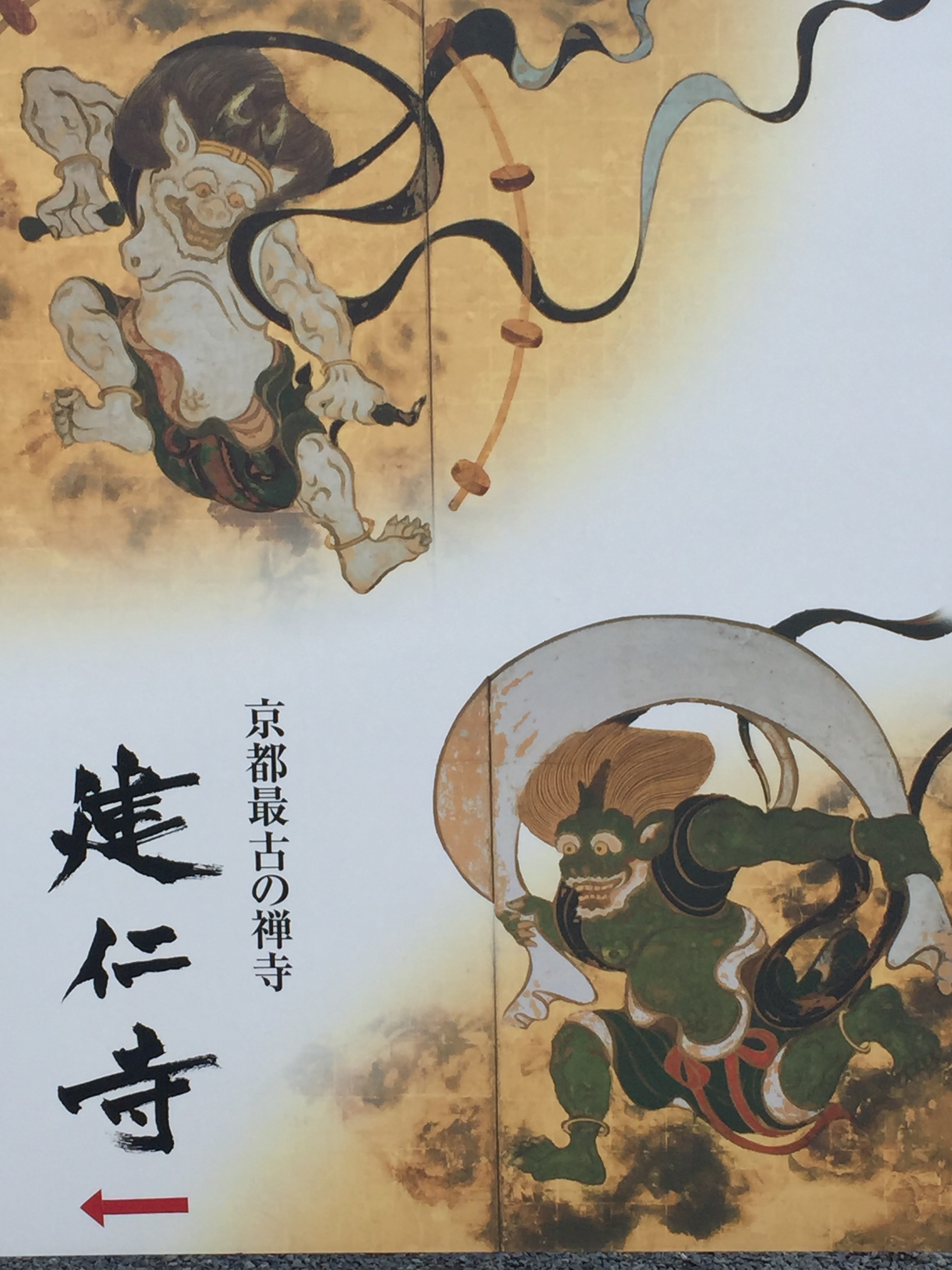 お腹もいっぱいになり、運動も兼ねて建仁寺を参りました。玄関の屏風には、「さいしょぜんくつ」と書いてありました。意味は最初の禅寺と言う意味だそうです。それでその屏風の前で、私は前屈をしてみました。