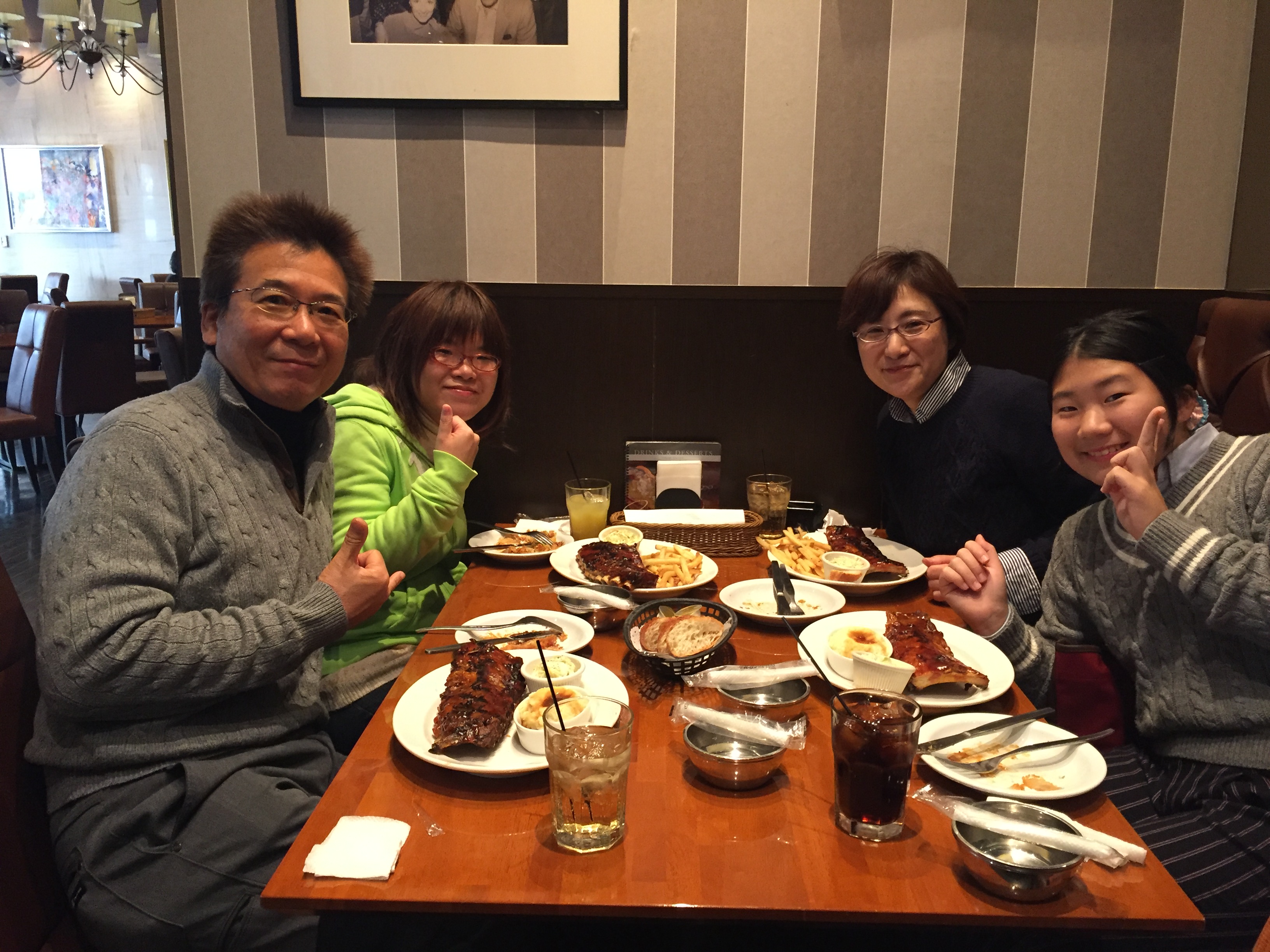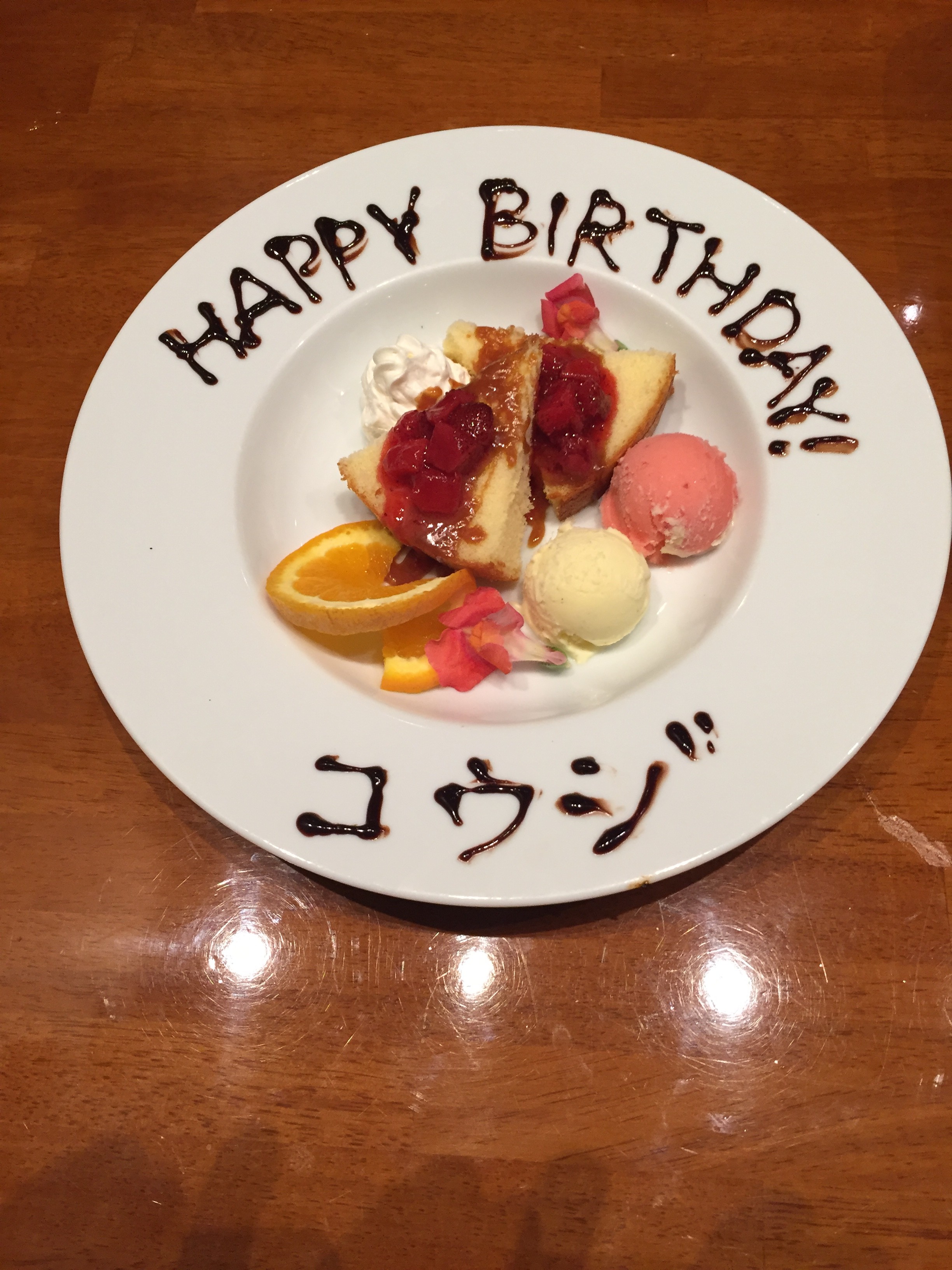 京都駅近くのスペアリブの店トニーローマで家族四人で1日遅れのバースデーパーティーを開催しました。昼2:00には我がファミリーしかいなかったので自然貸し切りになっていました。美味しいリブを堪能し、事前に誕生日ですと予約してあったのでデザートにサプライズ?ケーキが出てきました。プレートにチョコレートで書かれたHAPPY BIRTH DAY コウジの文字を色々なところから食べると変な言葉になったりで、店内は大きな笑い声が響き渡っていました。自然貸し切りだから安心して下さい。大丈夫ですよ。