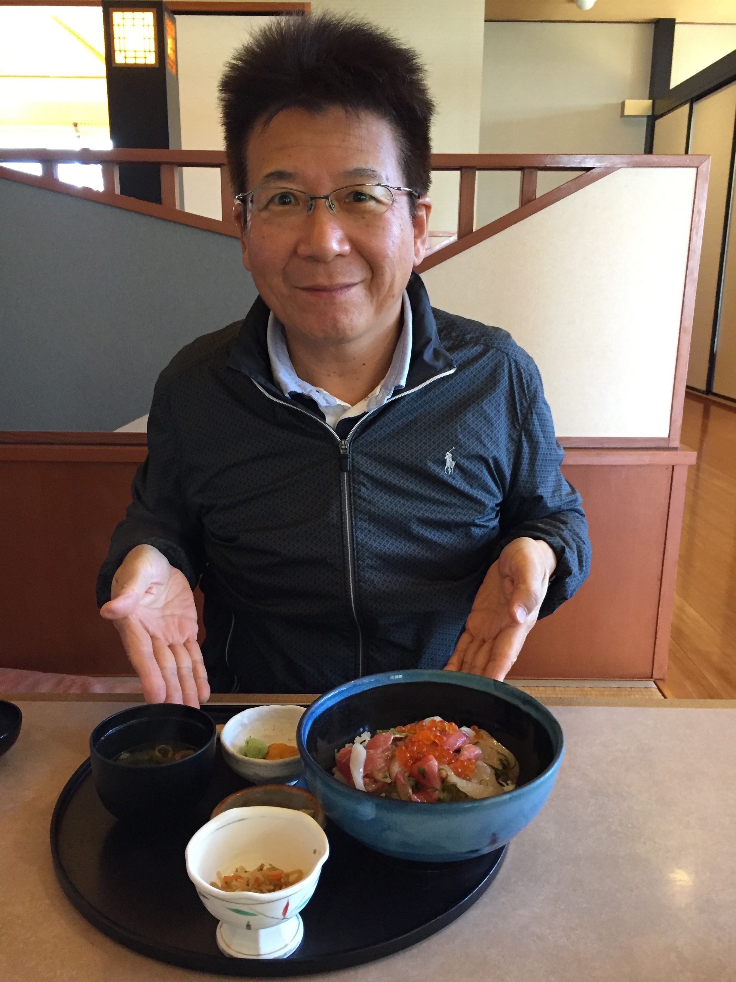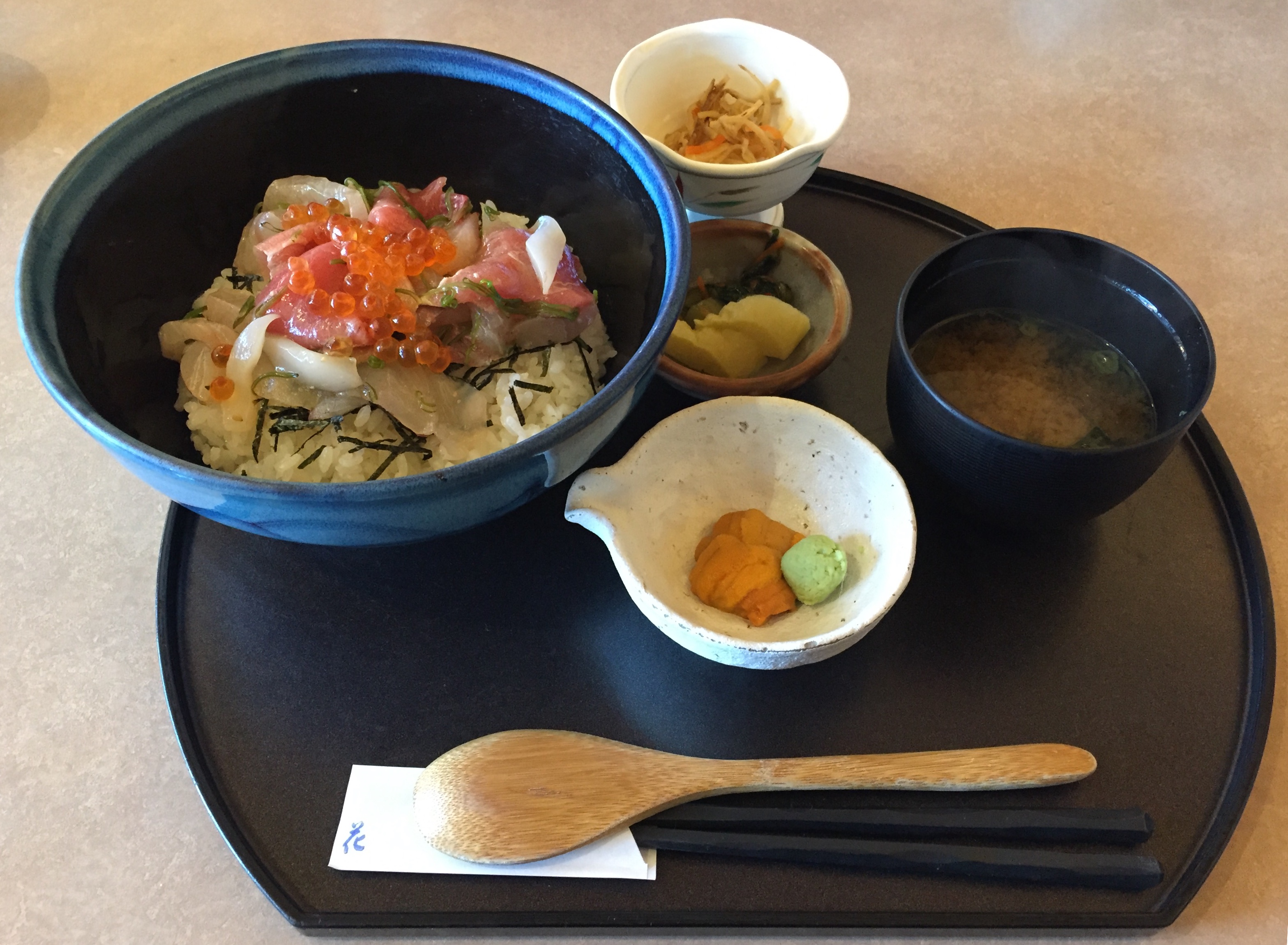 海宝丼が来るまでの間、期待が高まります。かなり、贅沢なランチです。「お待たせしました。海宝丼になります。」目の前に揃えられた初めてお目にかかる海宝丼は、流石、1980円の気品が漂っています。マグロ、ヒラメ、カンパチ、いくら、メカブ、イカが上品に散りばめられた上に、ウニを醤油で溶いたウニ醤油を満遍なくかけます。「いただきます。」「・・・・」絶句!「旨い!」ウニ醤油と様々な新鮮な刺身が絶妙に絡み合い最高のパフォーマンスを発揮しています。生きていて良かったとさえ思えます。この時、この価格は適正だと思い、自分自身を納得させる事が出来ました。本当に美味しかった。十分満足して帰路につきました。途中でへんば屋により「さや餅」を食べ、へんば餅を土産に買って帰りました。