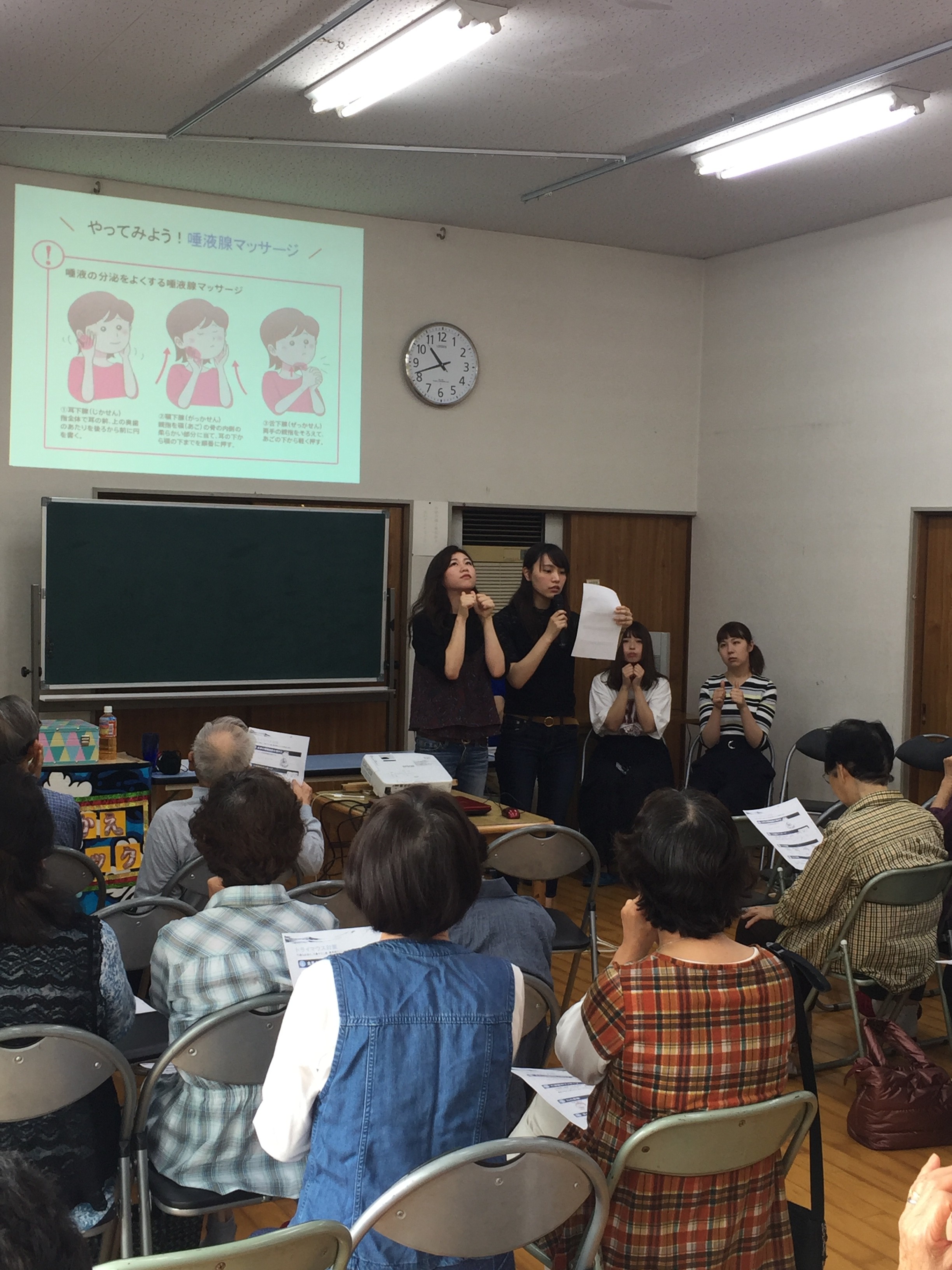 今日は東江島町集会所、通称”地蔵さん”にてNPO団体の”きずな”さんの御招待により講演会と手品🎩を披露しに行きました。毎年この時期に依頼を受け、恒例行事となっています。有り難いことです。 am10:00の開演に間に合う様に、1時間前には会場入りして準備をします。まず、大切な第1部『高齢者の口腔内の特徴と、誤嚥性肺炎の予防について』の講演の為にプロジェクターのセッティングとパソコンの準備をします。次にもっと大切な第2部『魅惑のマジックショー』の準備をします。その準備をしている間に、会場にはオーディエンスが入り始めました。タイムスケジュールは、第1部講演が40分間、第2部手品が50分間です。いつもの事ですが、余興の方がウエイトが高いのです。am10:00講演のスタートです。前置きとして「為になる話ですが、真面目な話ですので副作用として眠くなる事があります。眠くなったら遠慮なく寝てもらって構いません。でも、第2部手品の時には絶対に起きてて下さいね。」と話しました。高齢者の口腔内の特徴、唾液の役割や唾液腺のマッサージ、誤嚥性肺炎を予防するためのストレッチ、「カ・タ・パ・ラ」と大きな声で発音したり、「あ、い、う、べー」体操したり、口先を尖らせたり、舌👅を突き出したり、面白おかしく講義しました。衛生士さんの分かりやすい唾液腺のマッサージは、みんな一生懸命にして下さいました。