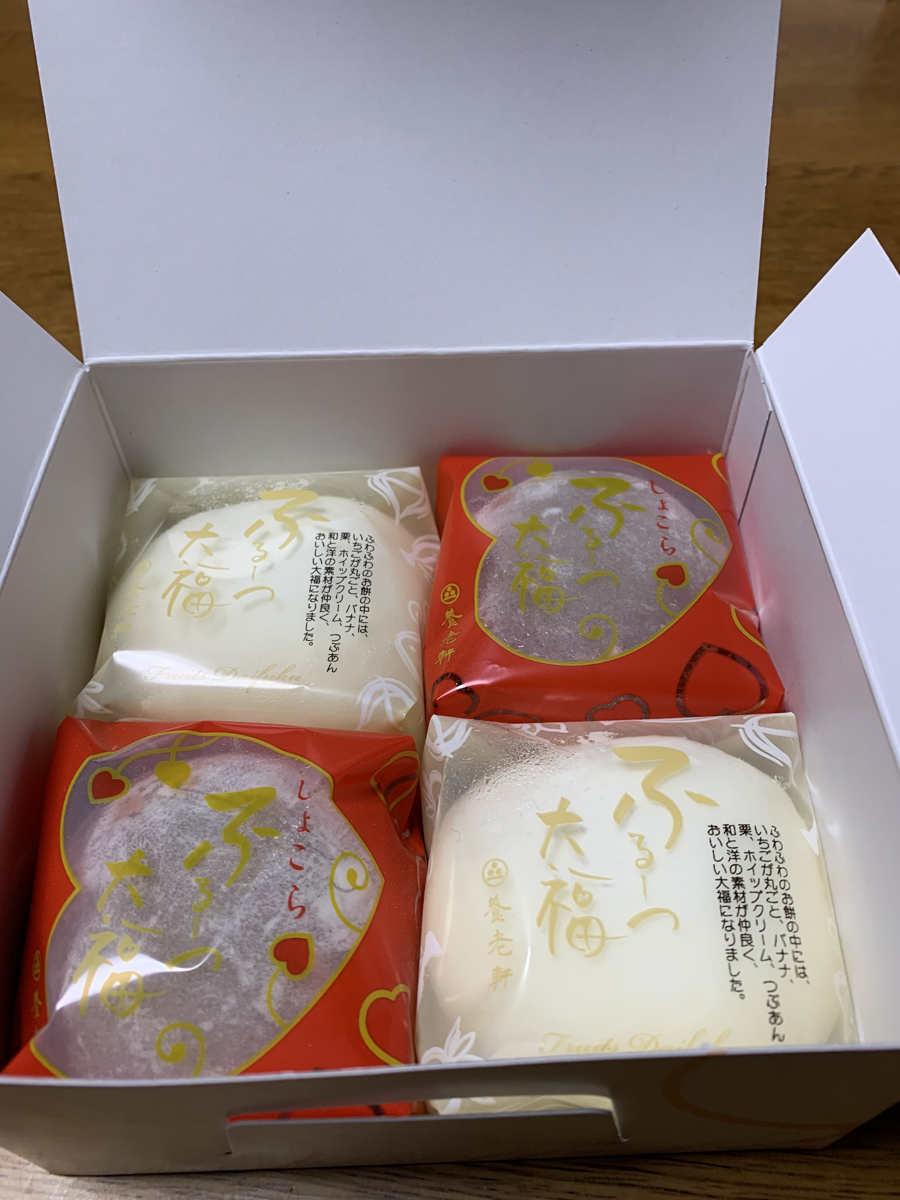 昨日 患者さんから頂いた養老軒のフルーツ大福があまりにも美味しかったので、また、松菱に行って期間限定、1日100個限定のフルーツ大福を買いに行きました。そして是非ともさかえ歯科のスタッフにも、この感動を分かち合いたくて松菱に向かいました。限定商品なのでまだ残っているがが心配でした。駐車場に車を停めて売り場に向かうまでは、気がつくと速足になってました。祈る様な気持ちで養老軒のブースに着くと陳列ケースに4個入りのパッケージ📦が5個ありました。はやる気持ちを抑える様に「三箱ください。」。自宅分、実家分、スタッフ分ゲットです。心の中ではYES‼️とガッツポーズでした。2日連続の夕食後のハッピータイムでした。また、太りそうです。今月末の人間ドックが心配です。明日のスタッフの喜ぶ顔が目に浮かびます。