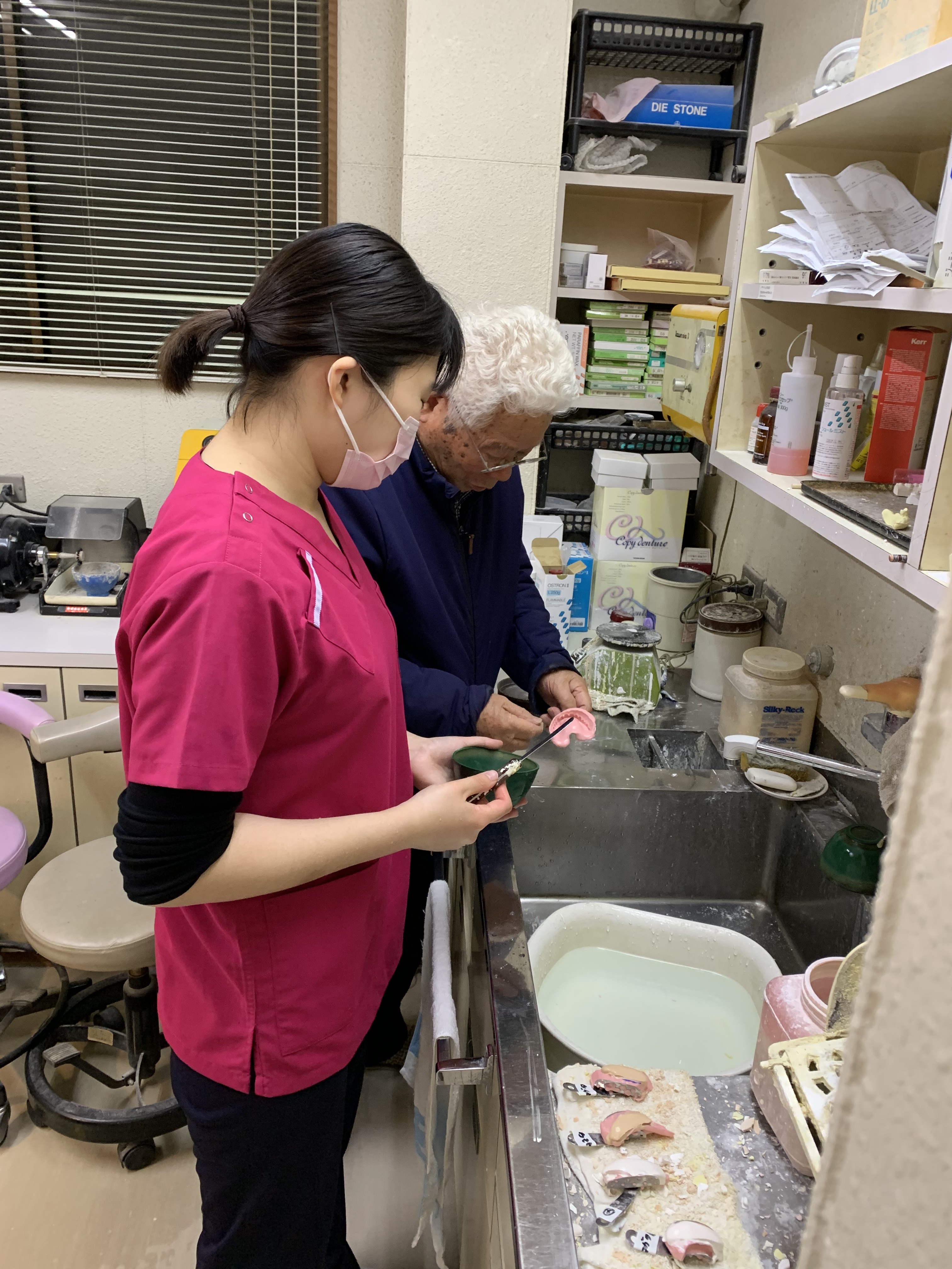 春休みの今、大学生の次女が夕方からさかえ歯科にアルバイトに来てくれています。器具の洗い物や、消毒滅菌コーナーの手伝いです。一生懸命に頑張ってくれています。スタッフのお姉さん達も親切に教えてくれるので仕事も楽しくやってます。患者さんが終わってからの後片付けと、掃除🧹も楽しそうです。仕事終わりには技工室で、親父から石膏流しのテクニックを直伝してもらっていました。もちろん、練習用の模型です。おじいちゃん👴も、孫に一生懸命に優しく丁寧に教えていました。とても嬉しそうです。技工士さんも「上手だね。筋が良いよね。」と大絶賛です。二人とも褒めて伸ばすタイプのようです。出来上がった石膏模型は、とても綺麗にできていました。仕事の事について真面目に話しているおじいちゃん👴と次女の光景を見て、私も嫁さんも気がつけば笑顔になっていました。