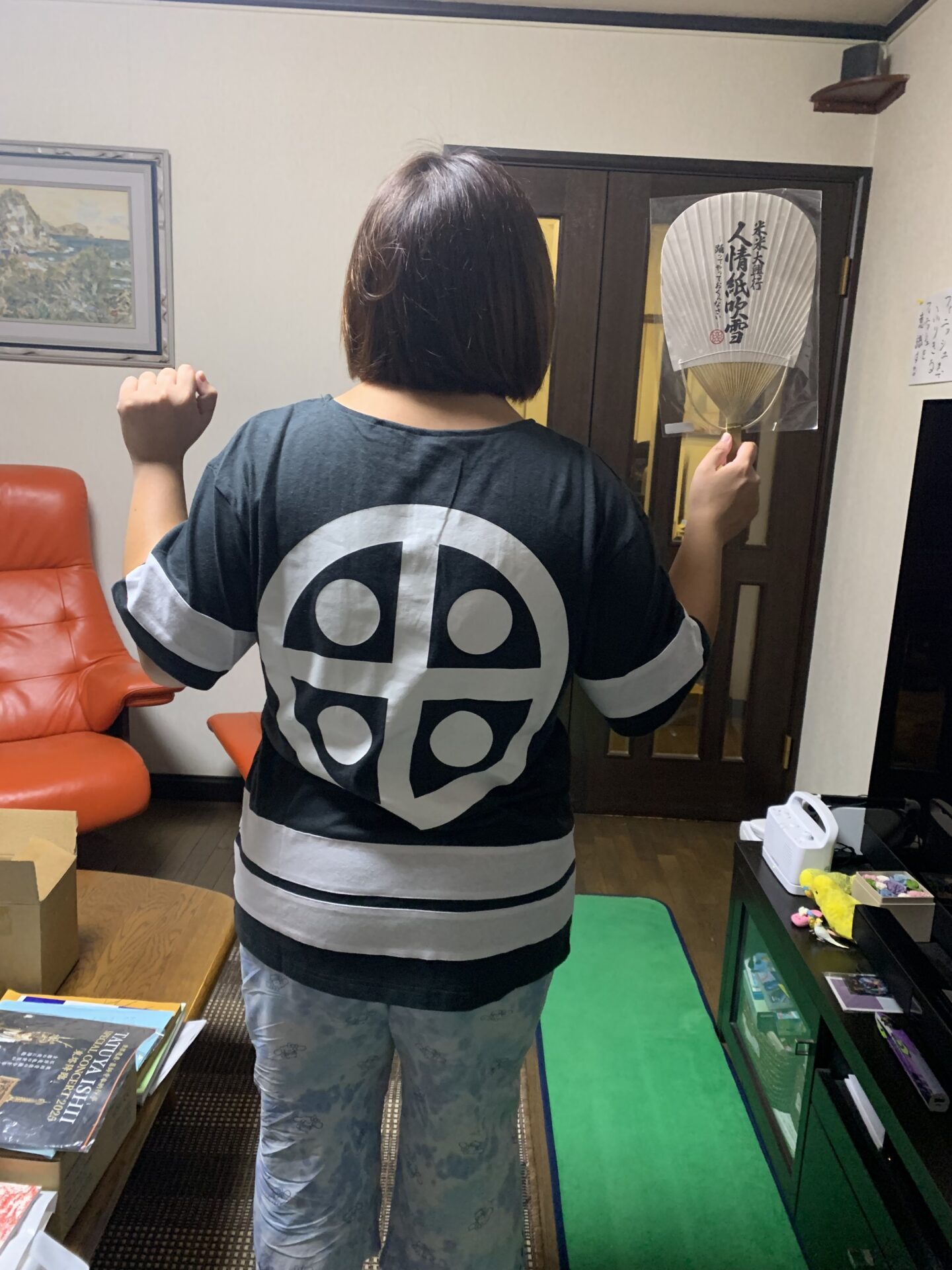 娘へのプレゼントとなった記念のTシャツを手にして、感動冷めやらぬ心で愛知県芸術劇場をあとにしました。帰宅して娘にTシャツを渡すと、大阪城ホールで共に鑑賞し、興奮を分け合った彼女はとても喜んでいました。早速、試着。そして、ウチワを手に踊り始めました。「こんな感じで、踊っていたよね。むっちゃ嬉しい。ありがとう😊。」と。L寸売り切れでよかったと感じる私でした。
