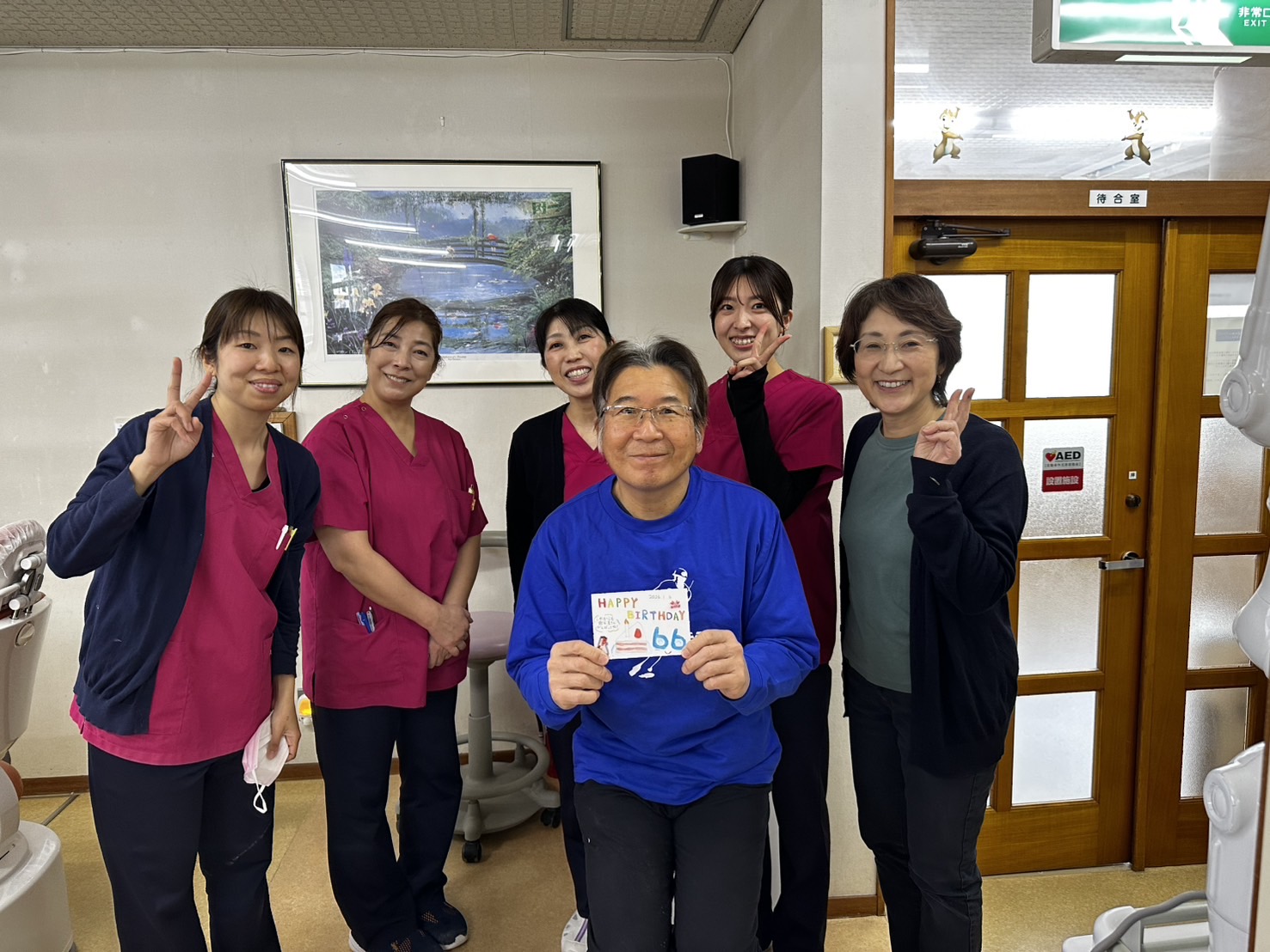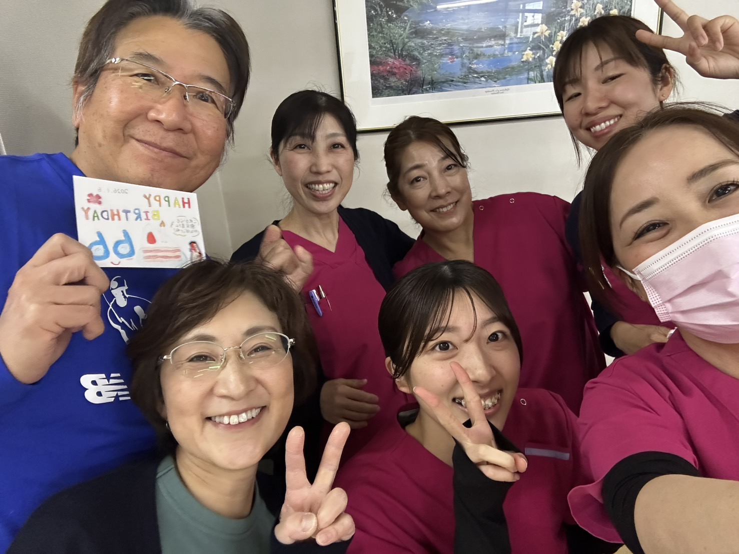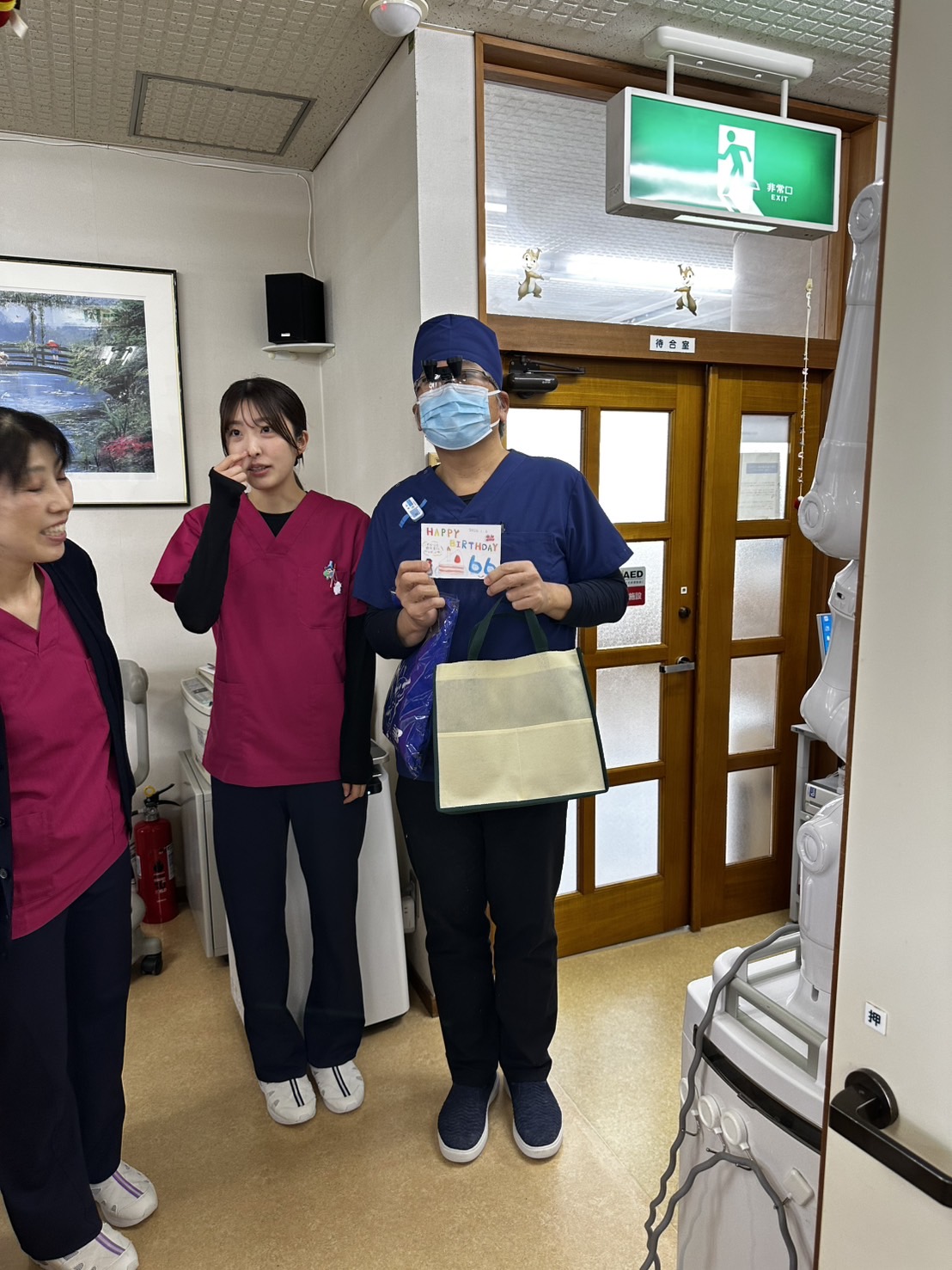 ありがとう😭。今日は最高の誕生日になりました。午前中の診療を終え、午後の患者さんの予定を確認していると、診療室の奥の方からワチャワチャとスタッフが。