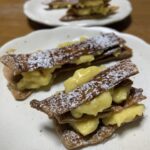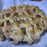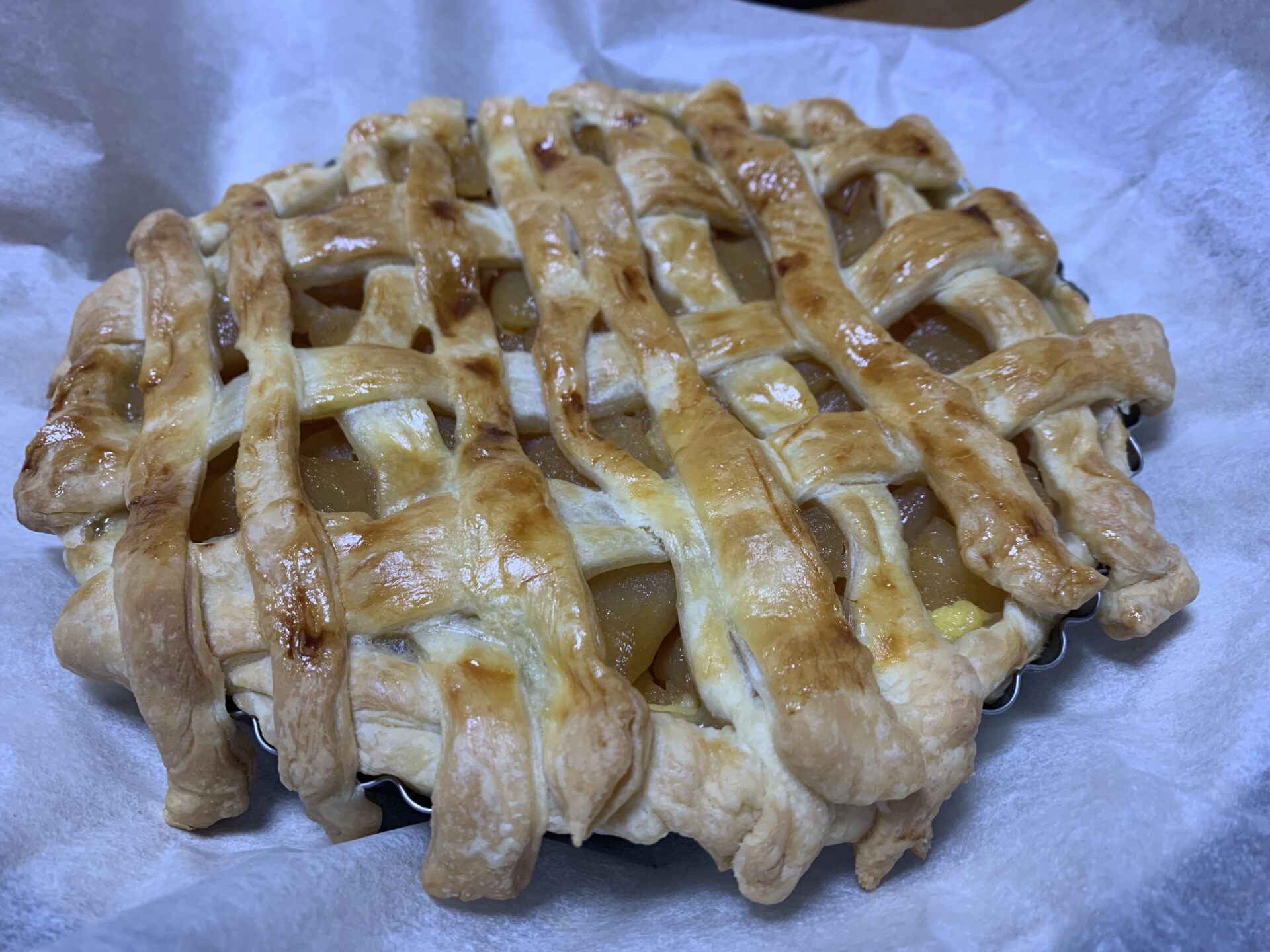 パン作り🍞🥐🥖にハマっています。先日は憧れのデニッシュを作りました。ワールドベースボールクラッシック⚾️も始まりました。前回のWBCでの大谷翔平さんのチームメイトを鼓舞する言葉に『憧れるのはやめましょう。』があります。その通りでした。ハードルが高いと思っていたデニッシュも初めの一歩のシートバターを作ることから始め、レシピ通りに生地を織り込みデニッシュ生地を作りました。色んな形に成形し焼き上がって盛り付けをみんなでフルーツをトッピングしている時の気持ちは憧れを越えたと思い、やれば出来るを実感しました。デニッシュ生地とパイ生地との違いは何かを疑問に思いました。調べれば、ドライイーストが入っているのがデニッシュだそうです。ということは発酵過程をとらないので早くできるのがパイ🥧です。じゃあ、嫁さんの大好物のアップルパイ🍎を作ってみようと思い、パイ生地を織り込みました。カスタードはレンジを使えば5分で美味しく作れる様になりました。アップルのフィリングは嫁の門外不出のレシピで作ってもらいました。パイの金型に自作のパイ生地を敷きカスタード、アップルフィリングの乗せてパイ生地を帯状にして網目状に織り込み、溶き卵を塗りツヤを出します。余ったパイ生地でミルフィーユをトライしました。オーブンに入れ、待ちました。焼き上がりました。どこから見ても『ザ・アップルパイ🍎』焼けた平らなパイとカスタードを交互に重ねて『ミルフィーユ』の完成です。2月27日am4:00憧れから現実の瞬間です。
