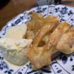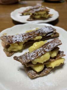 翌日、バニラアイス🍨をトッピングしてみんなで食べました。先ず、ミルフィーユ。フォルムは決して上手ではありません。でも、パイのサクサクした食感とコクのあるカスタードのシンクロは絶妙です。そしてメインの『ザ・アップルパイ🍎』むっちゃ美味しかったです。これ以上の表現する言葉が無いのが残念なくらいです。コメダのシロノワールに申し訳ありませんが勝ちました。商品化する予定です。果物🍎を煮たりする事など邪道と思っていた人も美味しく食べれます。実は私です。私が生涯で食べたアップルパイの中で一番美味しかったです。