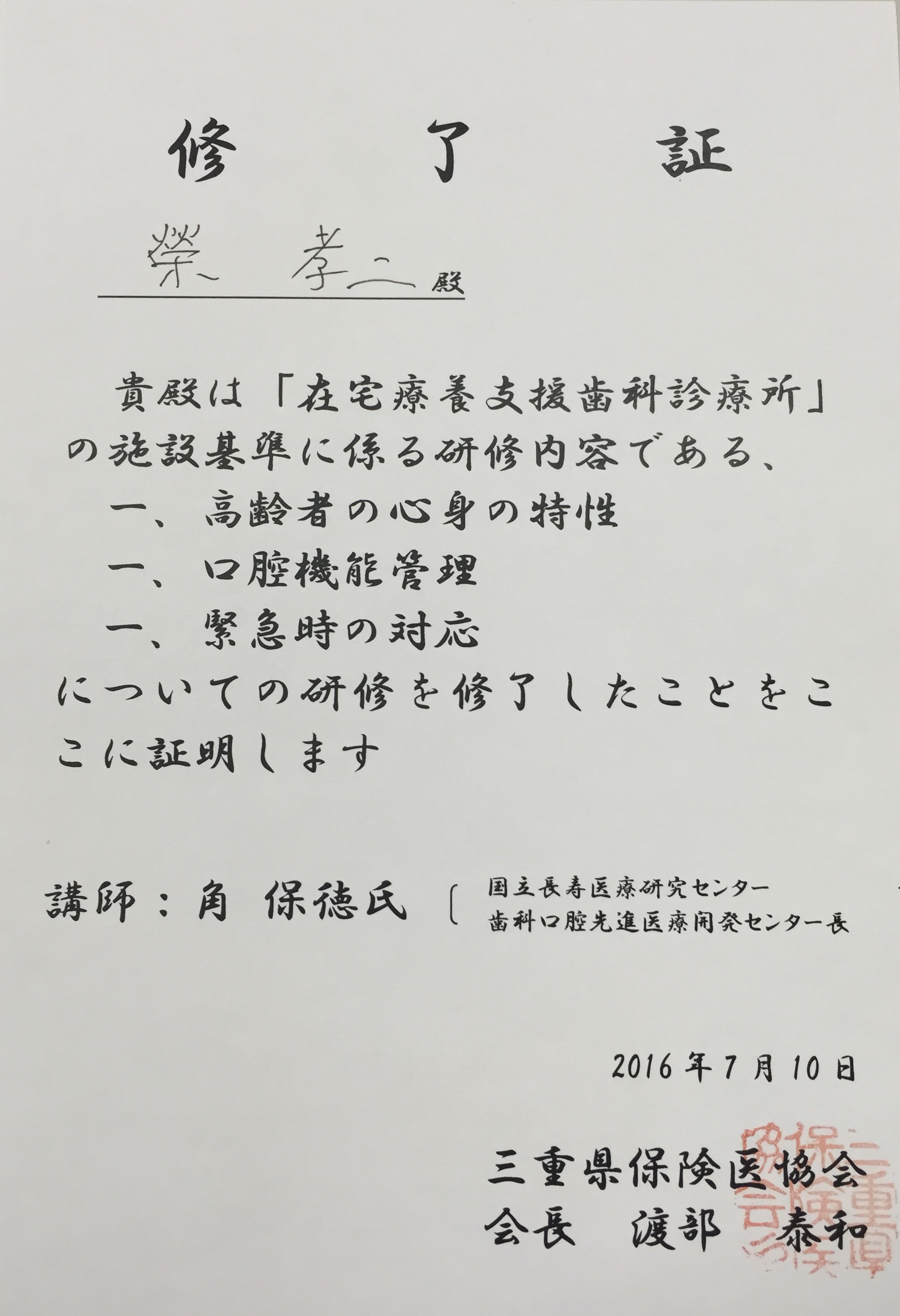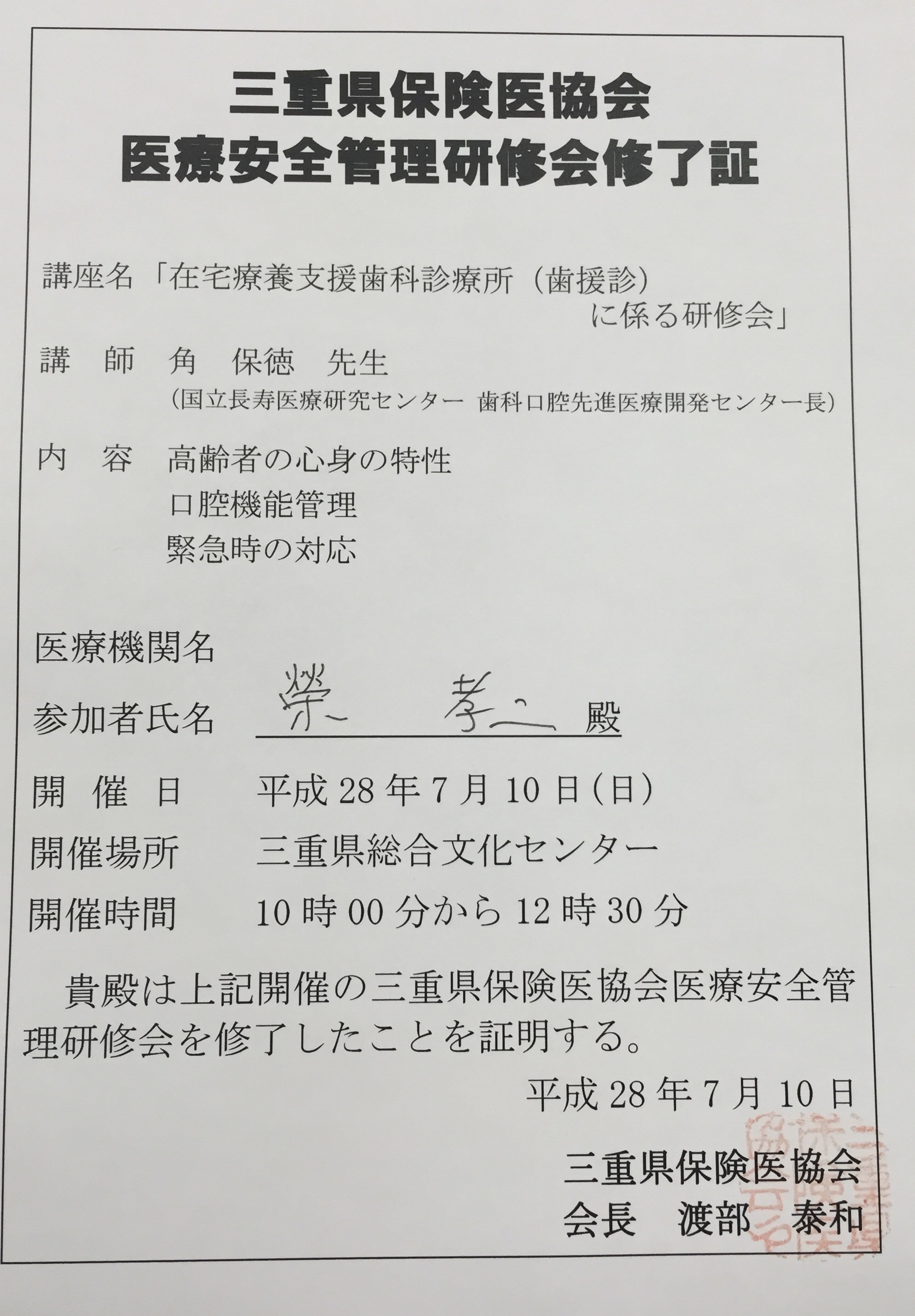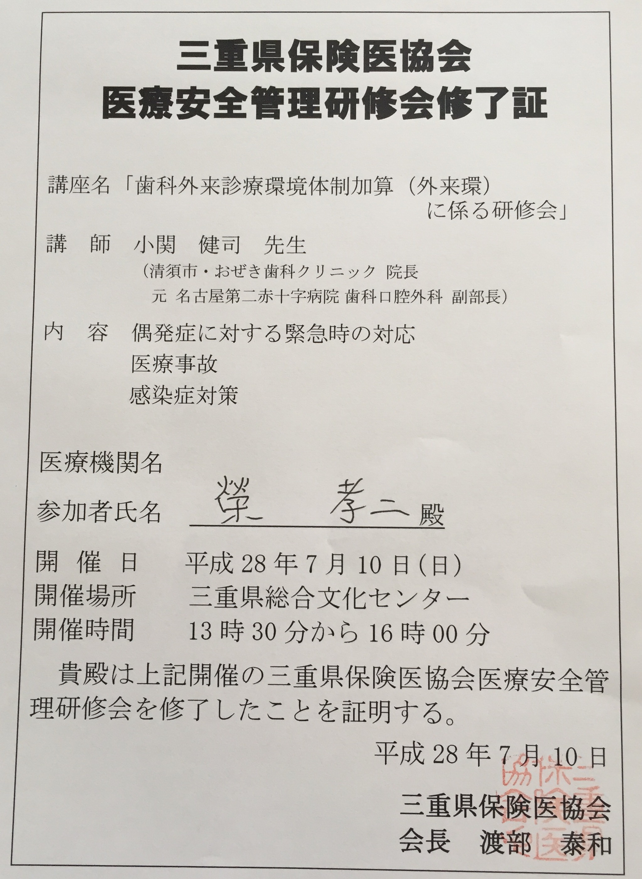 三重県総合文化センターにて、医療安全管理研修会を受講してきました。これからの、高齢化社会に向けて、午前中の第一部は、高齢者の心身の特性、口腔機能管理、緊急時の対応など、研修してきました。二時間半に渡る講義でしたがとても役立つ内容でした。昼食をはさみ午後からは、偶発症に対する緊急対応、医療事故、感染症対策を二時間半勉強しました。普通、午後からの講義は眠くなるのですが日常臨床に即役立つ物だったので、眠気はありませんでした。この研修を受けた事で、さかえ歯科医院は