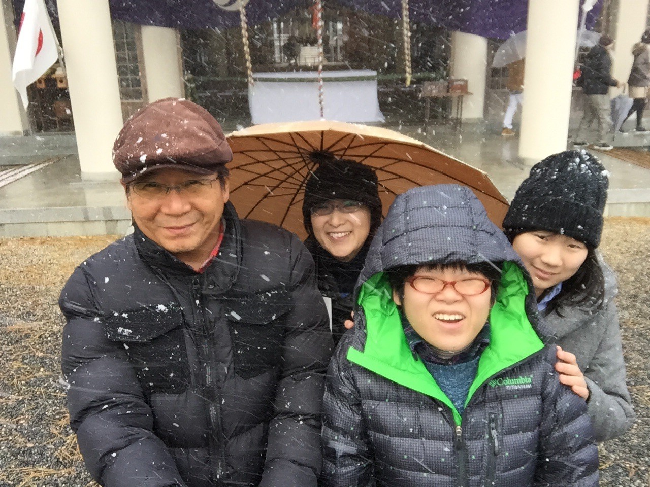 紅白歌合戦も嵐率いる白組が勝ち、海からの初日の出を見ようと早く寝たのですが、目覚めた時が日の出の時間でした。ですので、寝室の窓から初日の出を拝みました。おとそを飲み、嫁と娘達が作ったおせち料理を食べ、今年の目標を各自で発表し平和な朝を迎えました。それから子供達にお年玉を渡し、実家へ新年の挨拶andお年玉回収に行きました。実家で、にぎやかな時を過ごした後に江島神社に初詣に行きました。突然の雪に少し興奮しながら寒い冬空の中、みんなの幸せを祈願してきました。 平成27年 元旦