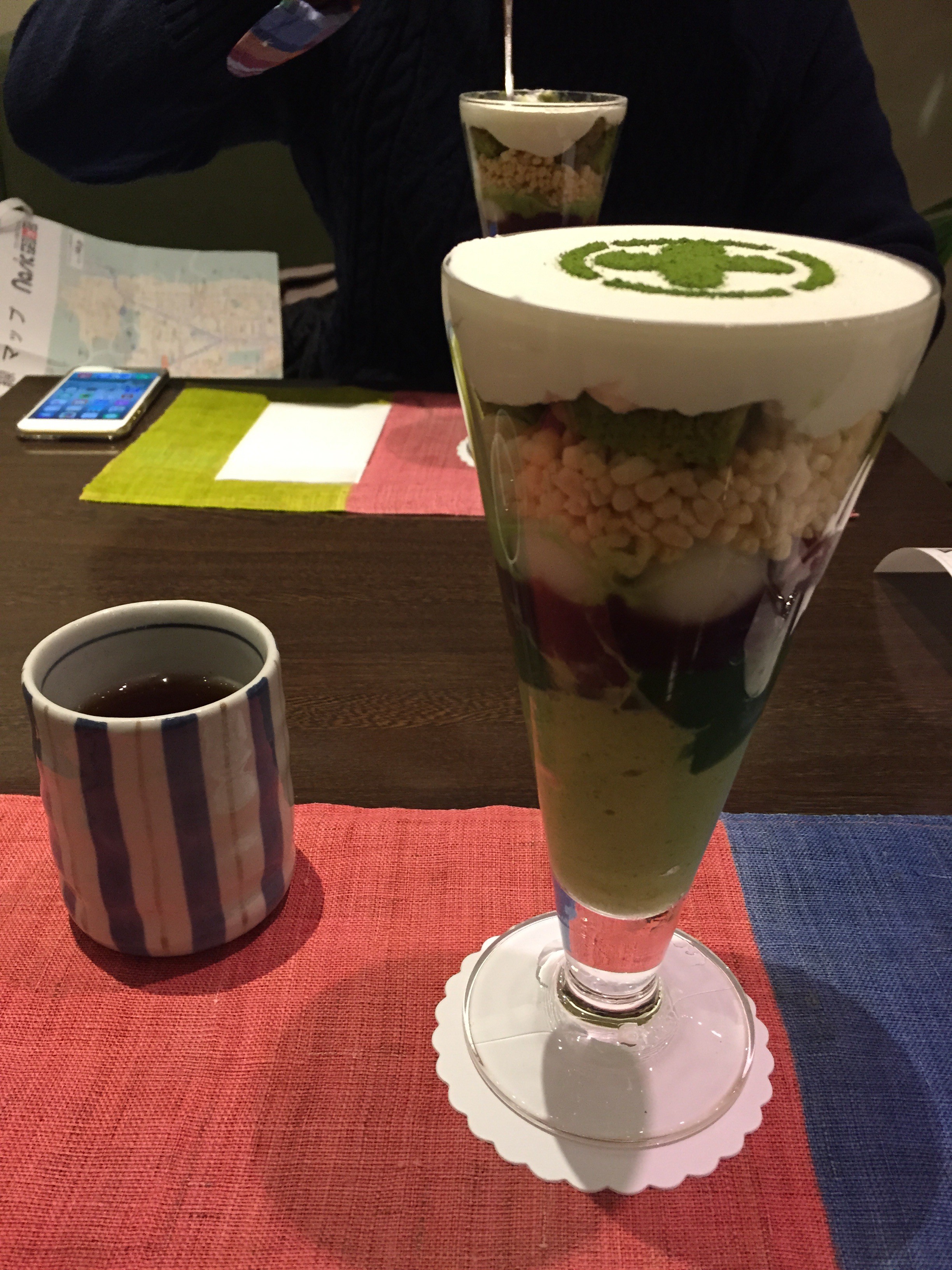 京都駅の3階に中村藤吉という、昔ながらの宇治茶のお店が出している茶店があります。以前から気になっていたのですが、先日とうとう開店と同時に入りました。駅ビルの中にある店ですが落ち着いた雰囲気があり、京都を感じました。お品書きを見て(あえてメニューとは言わず)十分に悩んだ結果、抹茶パフェに決定しました。注文すると「少々お待ちしていただくことになりますが。」と、意味深な返事。ワクワク。「お待たせ致しました。」と登場。その真っ白な生クリームの上に抹茶で描かれた丸に十の字の模様は、宇治の茶畑に降り積もった淡い雪を連想させます。その下には上品な甘さのつぶあん、細かいポン菓子の様な層、白玉、抹茶ゼリー、抹茶アイスとその中におしゃれに酸味の効いたラズベリー。それはもうグラスに中に詰め込まれた小京都です。スプーンを勇気を持って入れて食べてみると「………」絶句。欽ちゃんの仮装大賞で言えば光の点灯が音と共に上昇し赤い所の頂点まで到達、ファンファーレが頭の中で鳴り響き、欽ちゃん、香取君の登場です。至福の時を満喫しました。抹茶パフェ部門第1位の瞬間です。