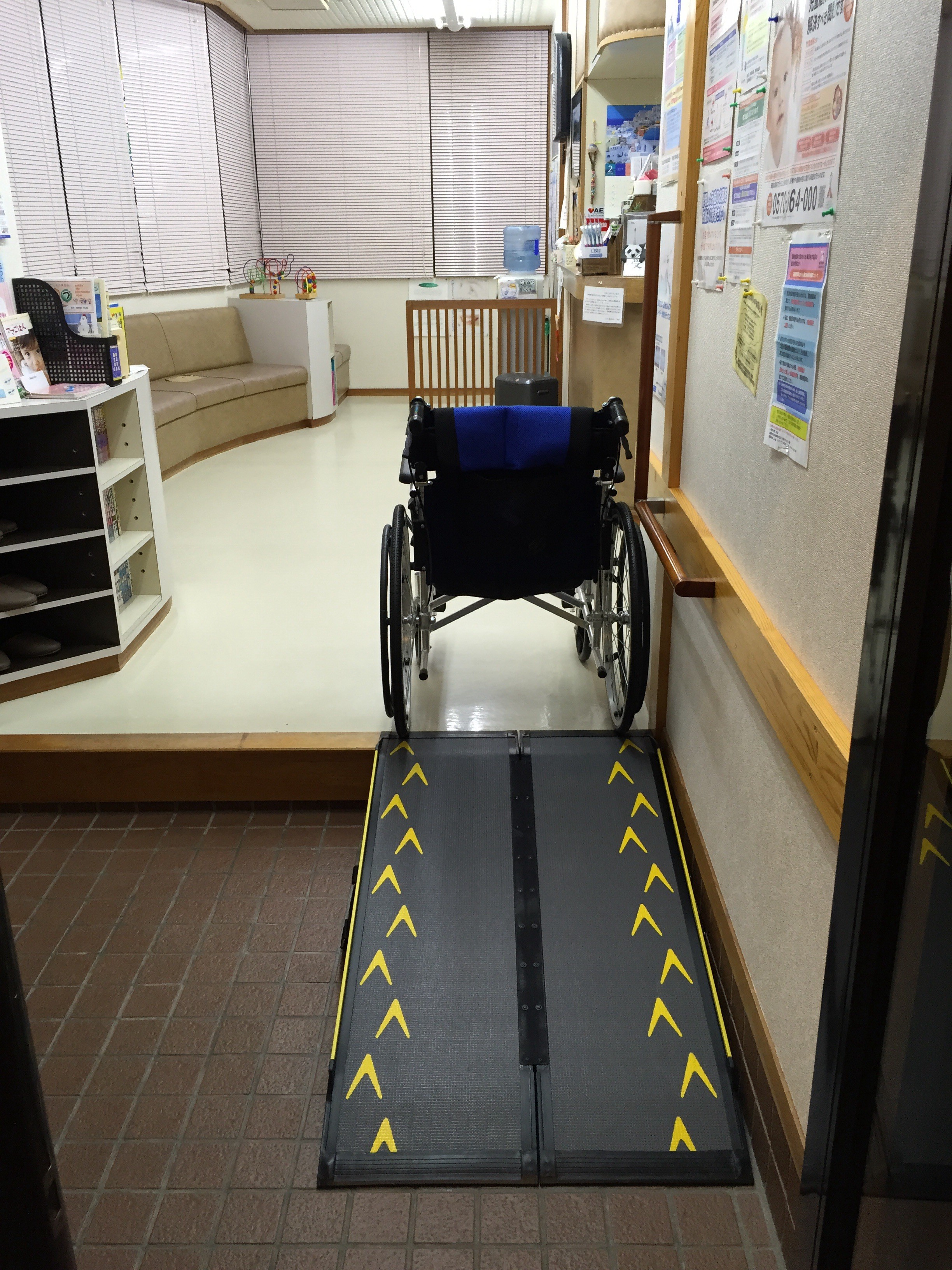 待合室への段差をスロープをつけることにより無くしました。これで車イスのままで診療室に入って頂く事が可能になりました。ハンディキャップのある方用の駐車場から、全く段差なしで診察台までの移動ができるようになりました。