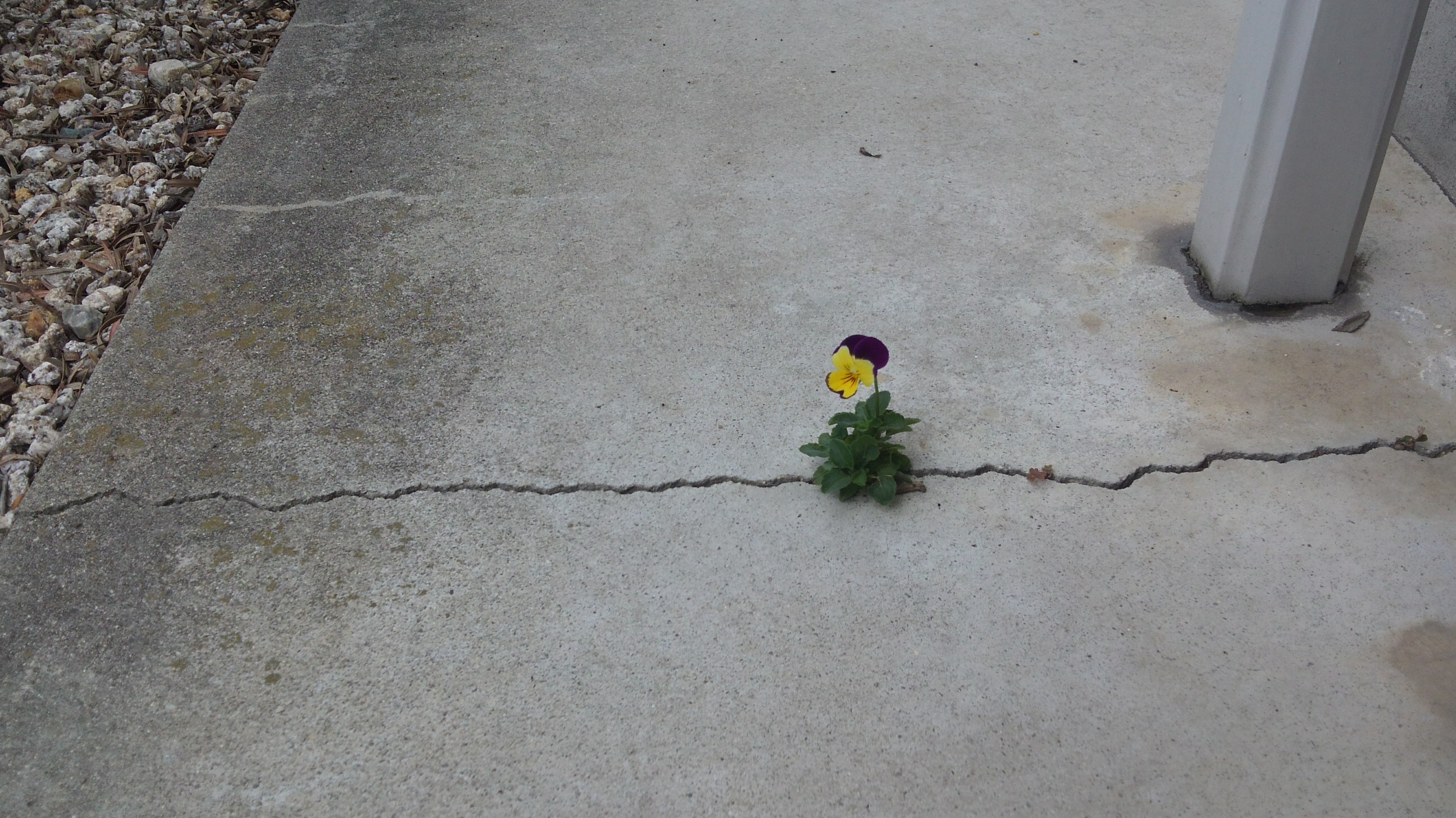 我が家の軒先のコンクリートのひび割れのすき間から、奇跡のような光景を見つけました。小さな花から生きていく事のたくましさと、素晴らしさを教えられたような気がしました。ガンバレ ど根性ビオラ!