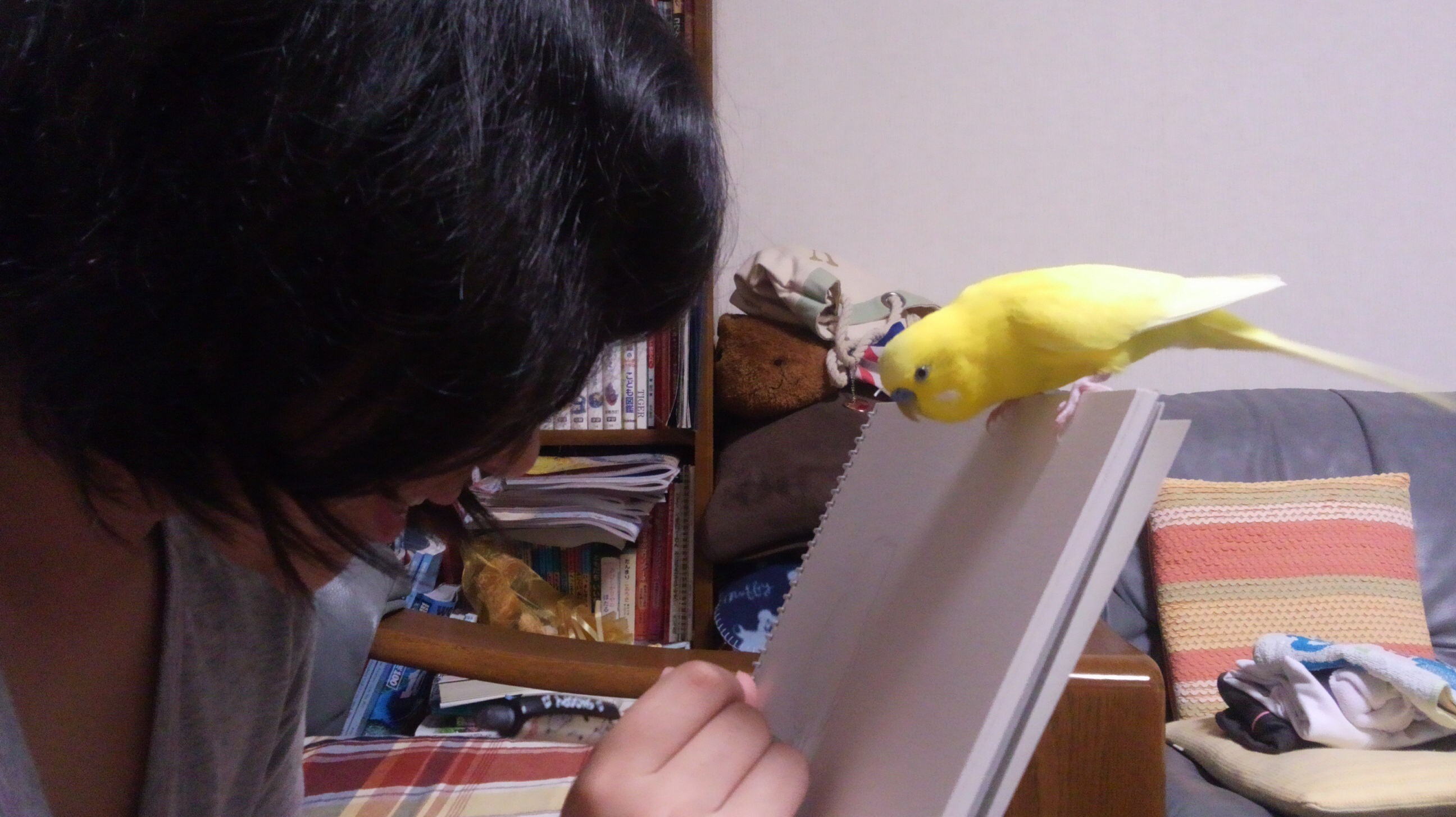 夏休みも始まり今日は娘の宿題です。スケッチのモデルとしてあの“ありがぴー”の天才インコのピーちゃんが採用されました。ピーちゃんは、なにかとポーズにこだわりがあるらしく、とうとうスケッチブックにまで乗って来て注文をつけるくらいです。さすがのプロ根性です。こだわりがあるのはわかりますが、ペン先までにとまって噛まれては作業が進まず娘も、困っていました。
