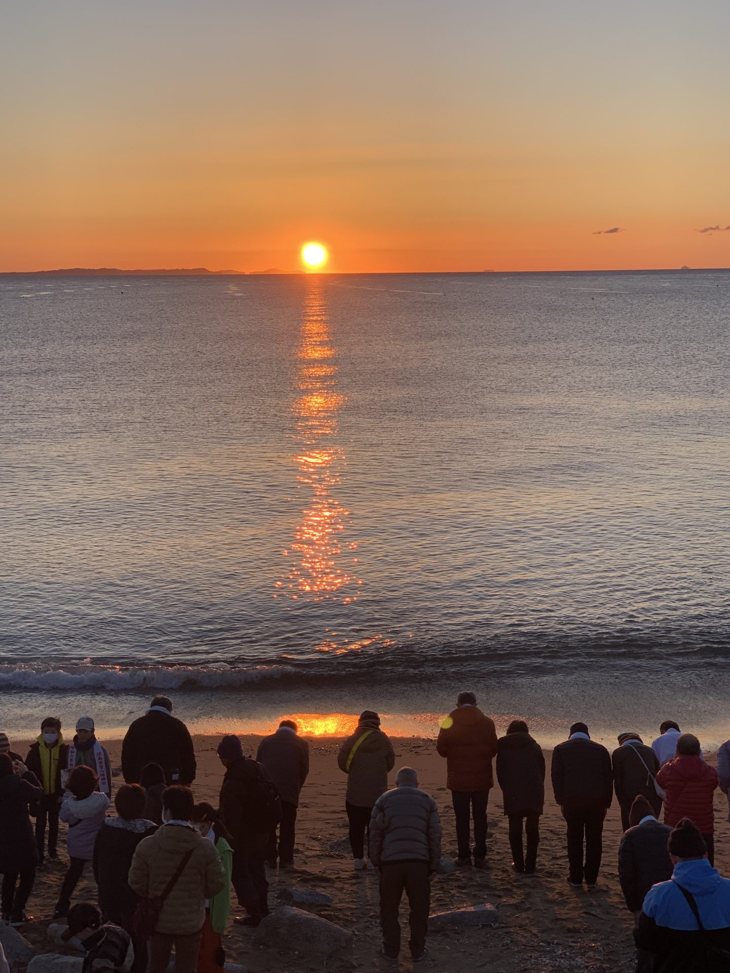 am5:30起床、初日の出を拝むべく早起きしました。江島神社⛩️さんで初詣 今年一年の幸せを願いました。神主さんにも新年の挨拶する事もできました。海岸線に行き、日の出🌅を待ちます。水平線の向こうの色が青から橙色に変わっていきます。次第に赤色が強くなってきます。水平線に太陽🌞の頭がヒョツコリハン。その光の真っ直ぐな線は水面の上を私たちの方へ一直線に進んできます。両手を合わせて目を閉じて祈ります🙏。比較的暖かな元旦の朝でした。