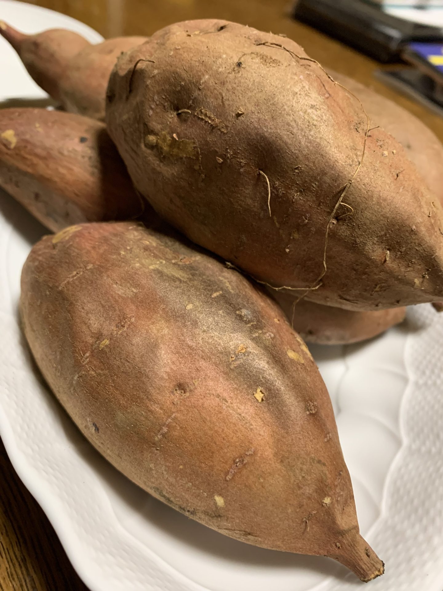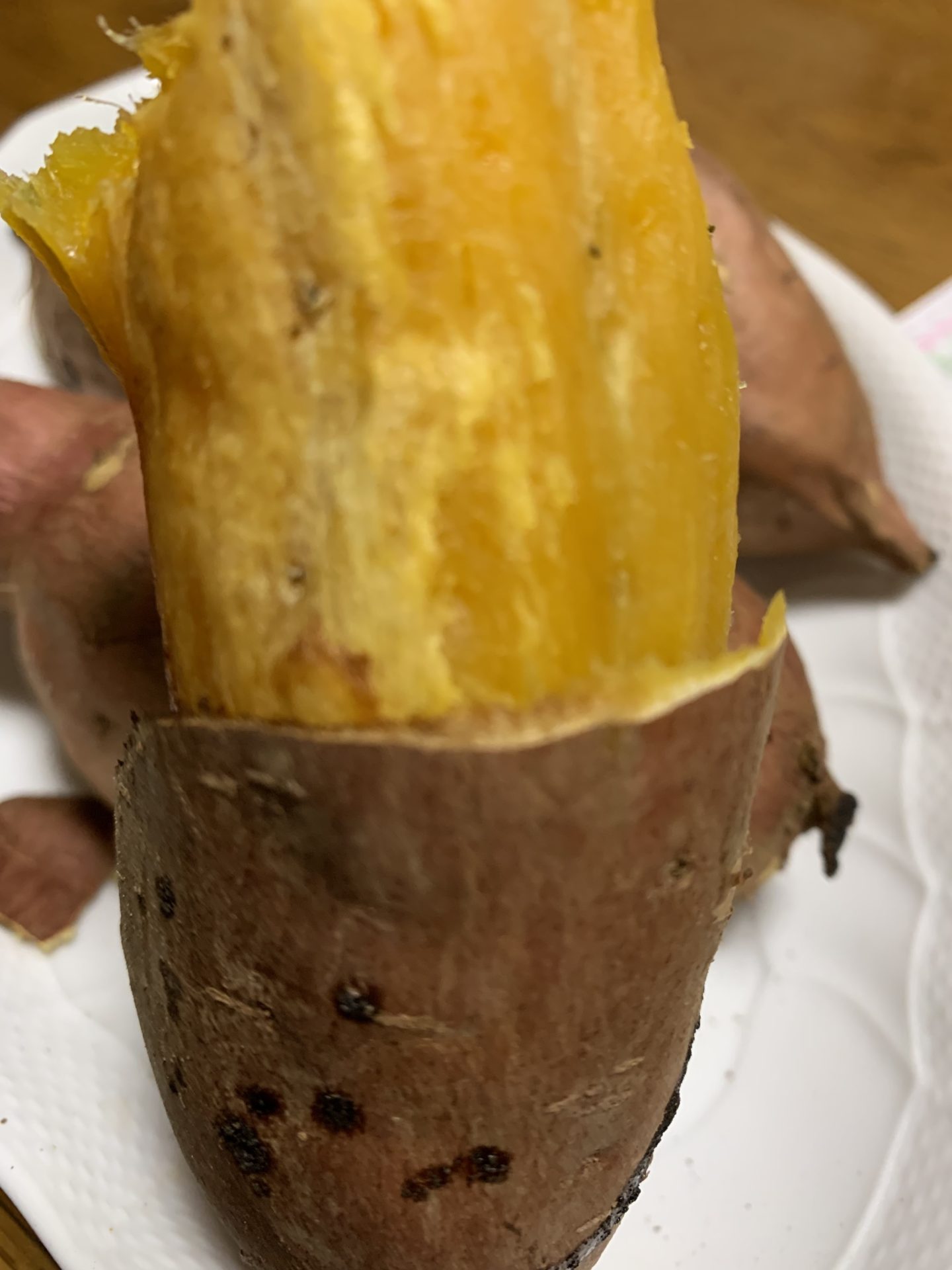 特に安納芋は最高です。焼き芋🍠にしても、天ぷらにしてもさつま芋よりも安納芋の方が甘味が強くて美味しいのです。アンニュイな木曜日の午後のおやつ代わりに安納芋の焼き芋🍠を焼いてもらいました。オーブンから漂ってくるほのかに甘い香りは至福の時間を約束してくれそうです。オーブンから焼き上がりを知らせる電子音が鳴りました。ここがポイントなのですが、焦って取り出してしまうのは絶対にダメ🙅なのです。余熱で放置するのです。そうする事によってお芋の甘みが増すのです。黄色くなった部分が更に蜜を含んだ様に黄色になるのです。「じっくりと待つんだぞ。大五郎。」(分かる人は少ないかな。ボンカレーのコマーシャル)お待たせしましたー♪‼️出来上がった安納芋の焼き芋🍠は、触るとまだ熱いです。嫁さんが「どれにする?」と4本の焼き芋🍠選択権をくれたのかと思ったら、即、「じゃんけんしよ。」と。真剣勝負の結果、私がドラフト交渉権1番を獲得しました。大きさはあまりかわりませんが、ポイントは焦げ目から推測される甘みの具合です。『ガリレオ』の福山雅治演じる湯川学の様なポーズを決めて推理します。「実に、おもしろい❗️」とジーッとどれにしようかと迷っていると「福山さん、早く決めて下さいよ。私は、これにする。」とタイガーマスクの悪役覆面レスラーの様に略奪。「あっ!」もう既に遅し。第一候補は彼女の手の中に。