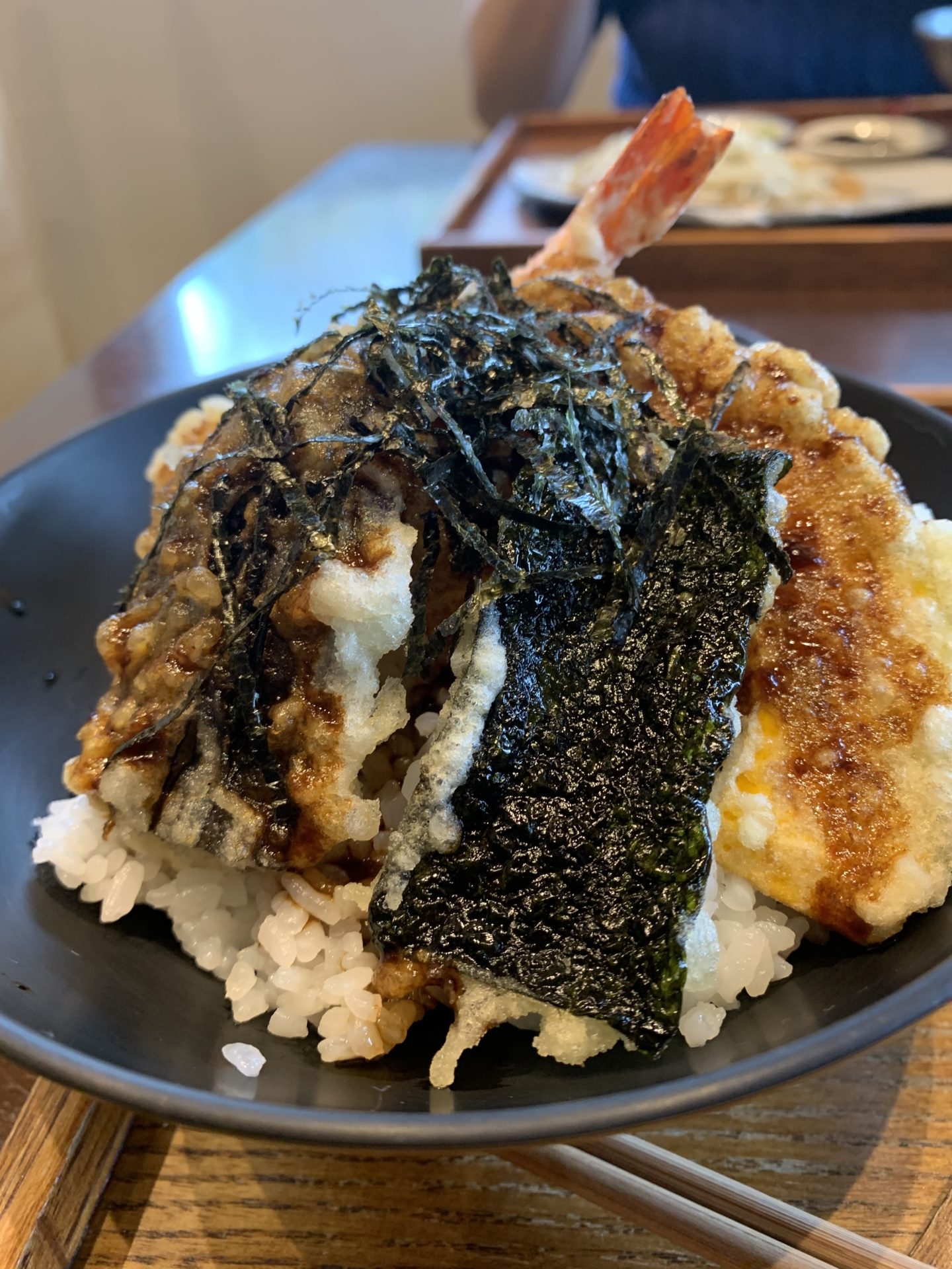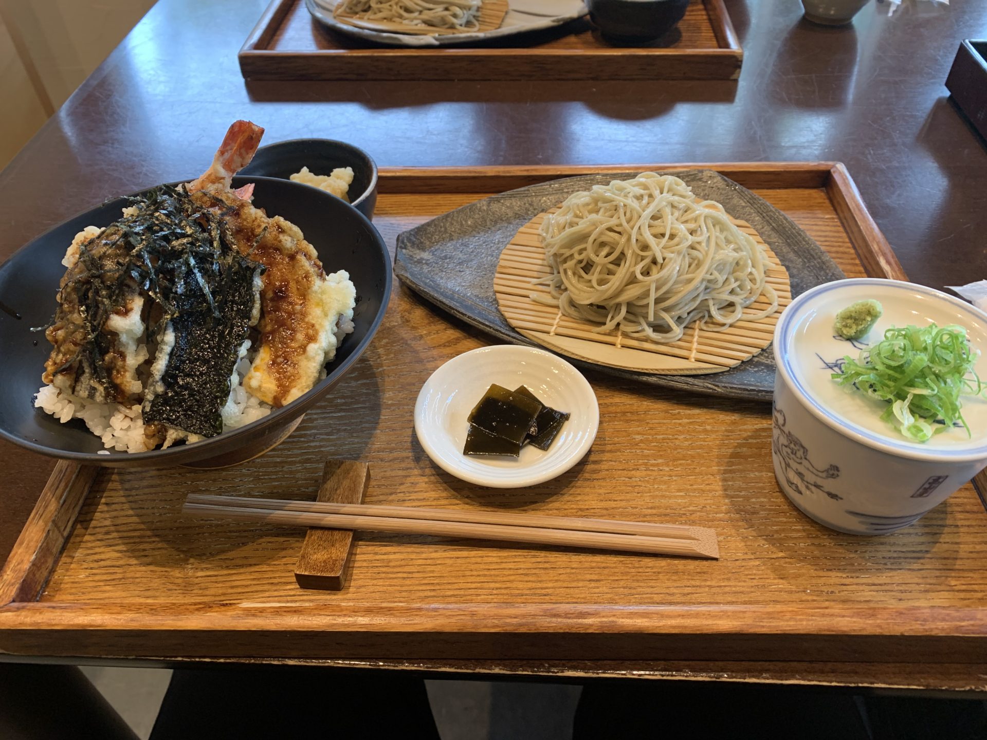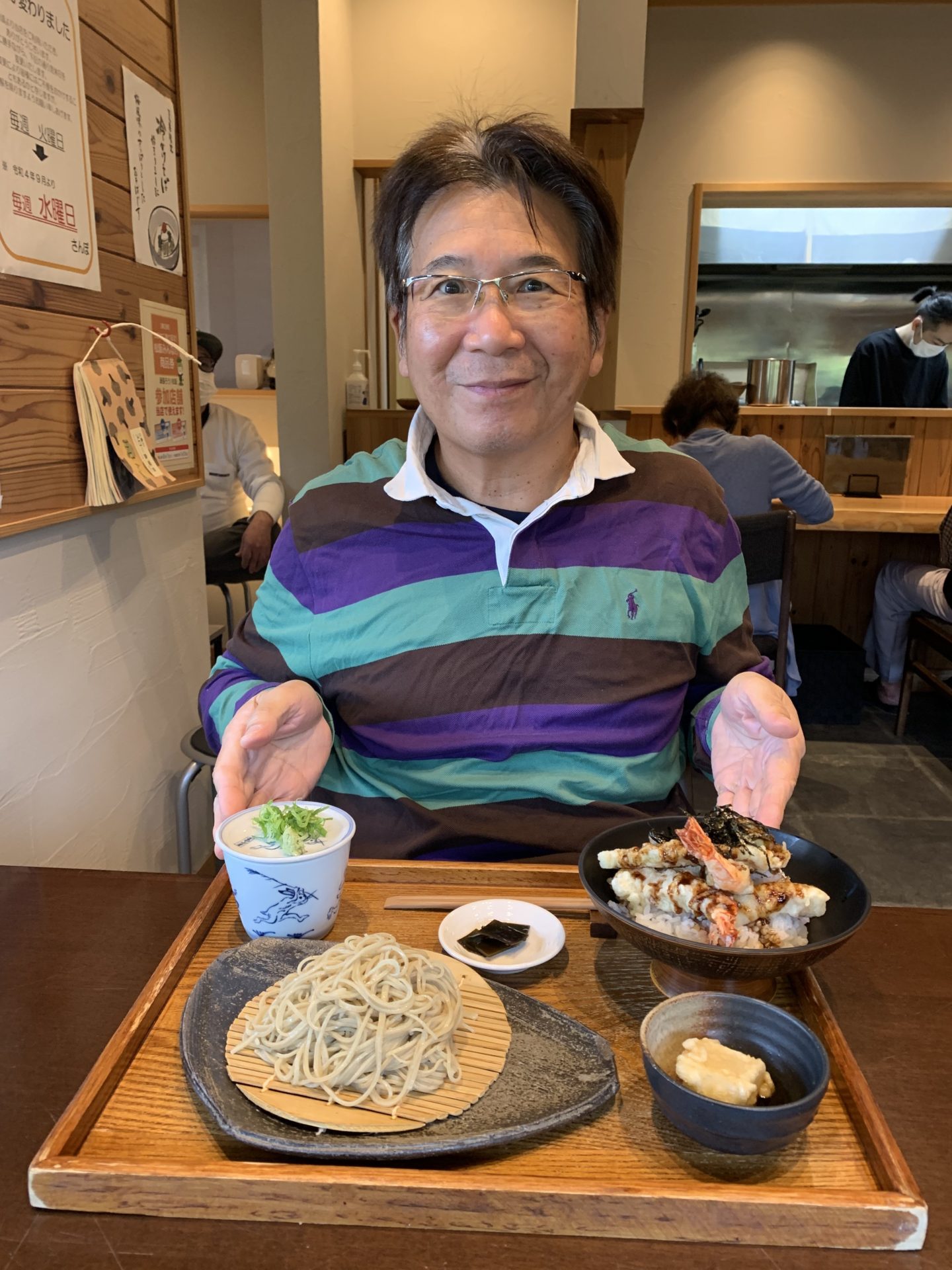 先日テレビ📺で蕎麦職人になる為に住み込み修行をして一人前になり、店を構えるという番組をみました。美味しい蕎麦が食べたいという衝動に駆られて家族会議となりました。長女から彼女の所属している合唱サークルの指揮者の方のお勧めの蕎麦屋さんに行く事に決定しました。松阪の蕎麦屋さん「さんぽ」さんです。オッケーGoogleと食べログで『さんぽ』さんの情報収集しました。案内経路検索では自宅から1時間、行列ができる店との事で開店11:30に間に合うように少し早めの10:00出発。R 23を嫁さんと期待を胸にドライブです。最近ハマっているゴルフ🏌️♀️のスイングの事や我が家では、死語と化したダイエットの話をしながら傍らの『ステーキ🥩の竹屋牛肉店』が美味しいらいよの情報についての検討会議に没頭していました。津市を通過して松阪に入ると、煮込みハンバーグが美味しかった『Bonjour』さんを左に確認、「行く?」「今日は、蕎麦という事で。」「ラジャー🫡❗️」ナビゲーションの音声案内通りに走ります。「目的地周辺に到着しました。」広い駐車場の入り口には『手打ちそば さんぽ』の小洒落た看板が。一番乗りで駐車場には誰もいませんでした。30分前の到着。車中で開店を楽しみに待ちます。11:30開店。もちろん1番。注文は『天丼と蕎麦セット』嫁は『鯛丼と蕎麦セット』その日の早朝に作る手打ち蕎麦は細くて上品なビジュアルです。期待度は上がります。まず、蕎麦通を気取って蕎麦のみを食べます。コシがありほんのりと蕎麦の香りがします。次にツユを半分くらいつけて食べます。ズズズッ!「やっぱ、蕎麦通はこうやってたべなきゃね。」と言うと、「いつから、蕎麦通?知り合ってから初めて聞いた。」と。今度はたっぷりとツユに浸してから、ズズズズッ!喉越し最高です。出ました、美味すぎちゃん‼️天丼もとても美味しい頂きました。嫁さんが頼んだ『鯛丼』は鯛の刺身に胡麻だれ、高級な料亭に出てきそうです。半分くらい食べて最後は蕎麦湯で茶漬けで締めたいルックスです。鯛丼も最高でした。蕎麦とミニ丼のセットだったので、丼は期待していなかっただけにガッツリ本気の天丼と鯛丼には脱帽でした。十二分に満足しての会計です。リーズナブルな価格と優しい店員さんの対応に大満足。「鈴鹿から来た甲斐がありました。」と言うと、「わざわざ鈴鹿から。ありがとうございます。」の嬉しそうな表情に、「また、今度は子供達も連れてきます。」と約束しました。