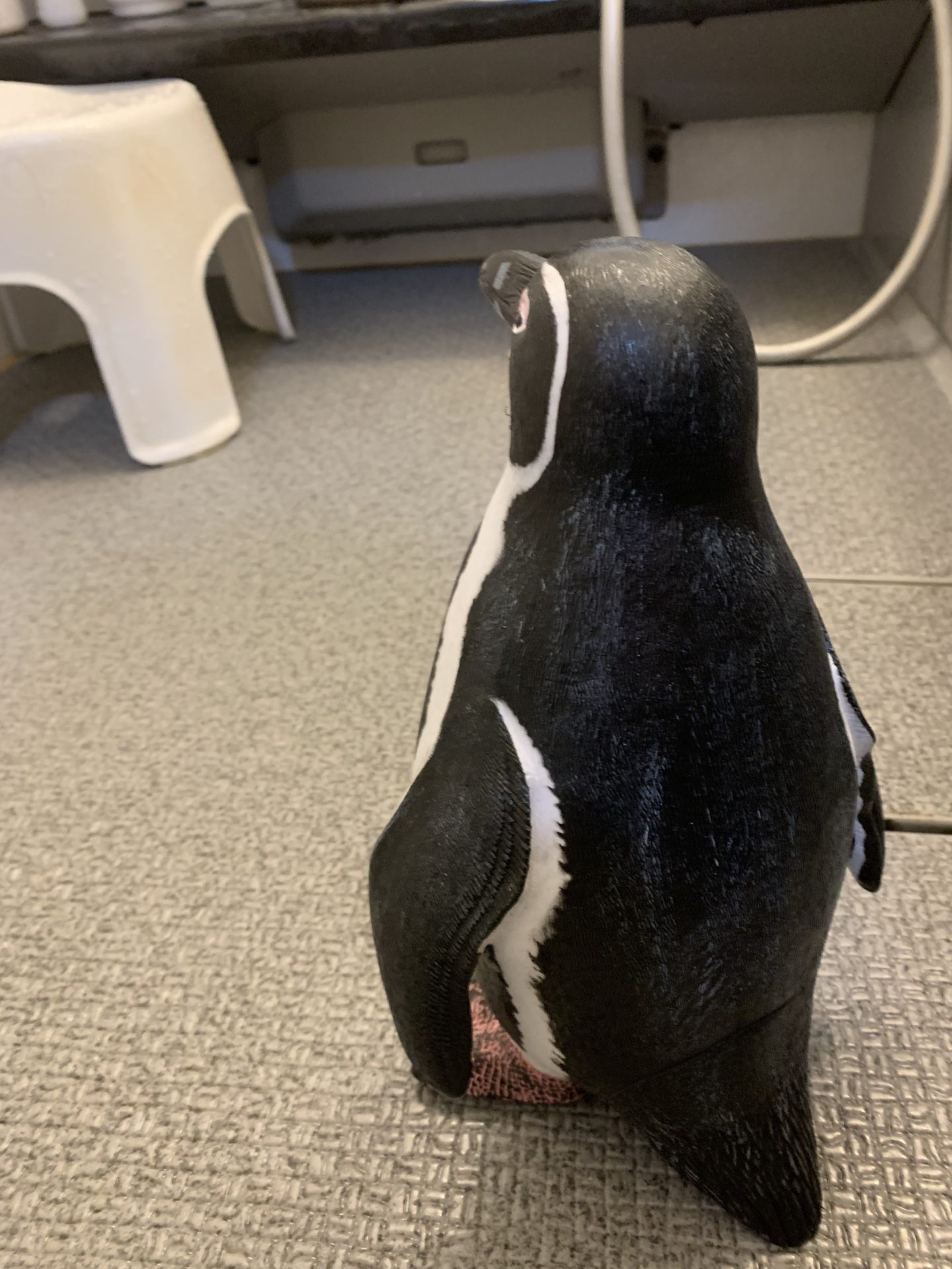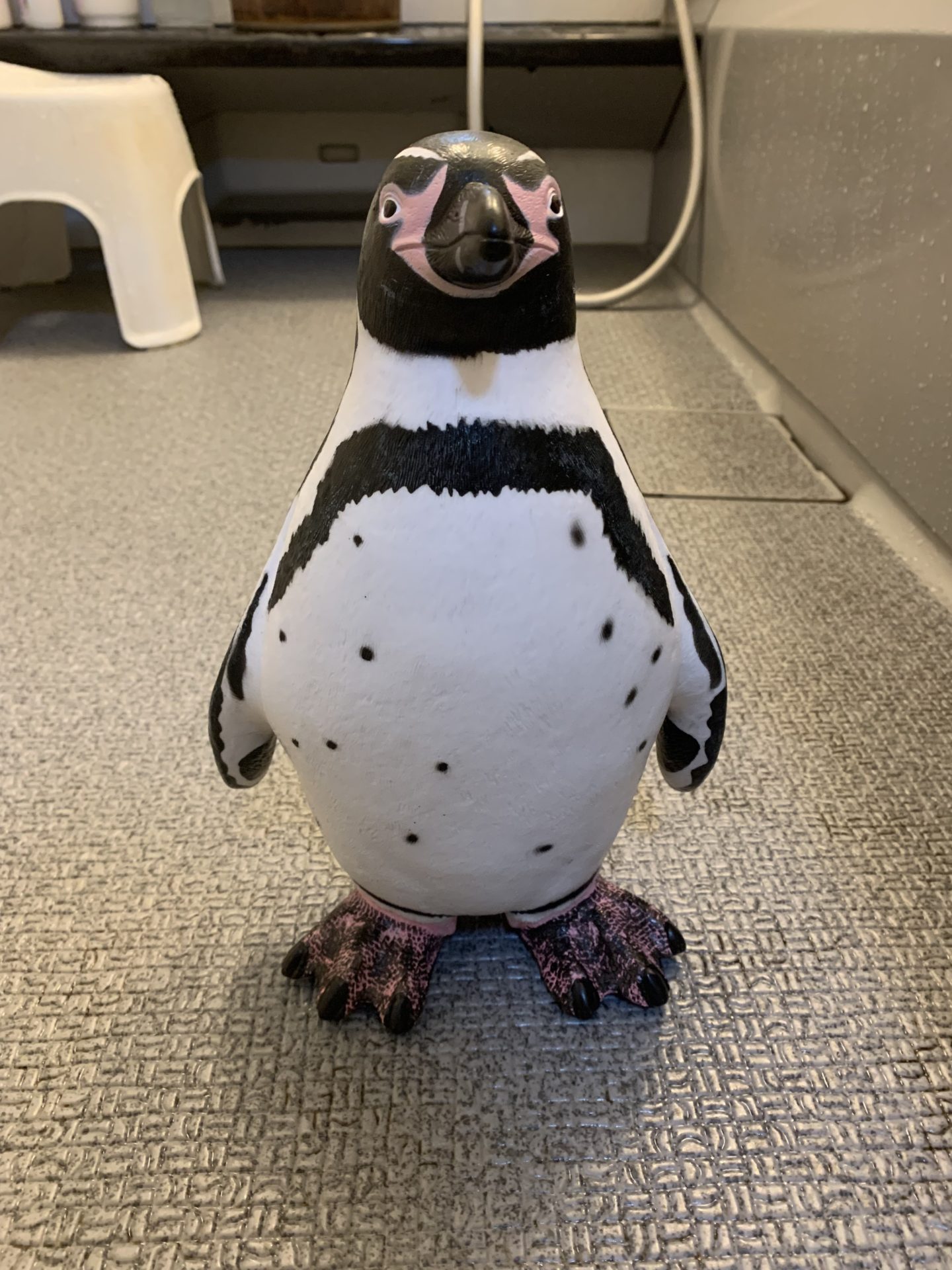 購入したフンボルトペンギン🐧を自宅のバスルームで飼うことにしました。Bluetoothで継ないだスピーカー🔈から、フンボルトペンギンの鳴き声が出せるようにセットアップしました。いたずら好きの榮家では、今日唯一仕事だった長女をドッキリさせようとスタンバイ。脱衣所でお風呂🛀に入る準備をしている長女の様子を嫁さんが監視します。そして、『今だ、』のサインが出されました。YouTubeからピックアップしたペンギン🐧の鳴き声を『ポチッと』再生。「ゴォ〜、ゴォ〜、ゴォ〜ッ。」と凄い鳴き声が浴室から聞こえてきます。ビックリ🫢した長女は、浴室の扉を開けます。そこには、フンボルトペンギン🐧が❗️「ぎゃーっ‼️」長女の叫び声。ドッキリ大成功。みんな大爆笑でした。仕掛けられた長女は、一瞬「ウチなら、本物もありうる。」と思ったみたいでした。榮家に仲間入りしたフンボルトペンギン🐧のボルト君は、洗面所の番人となっています。時々、彼の存在を忘れてお風呂上がりにビックリしてしまいます。