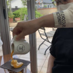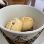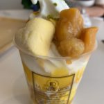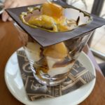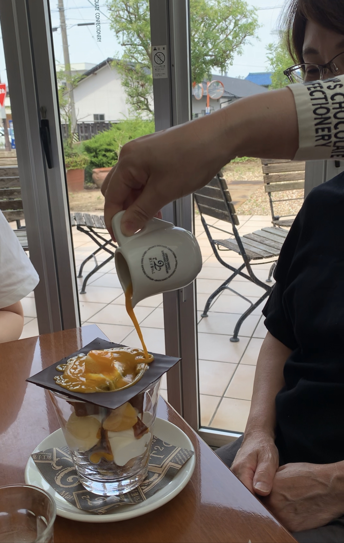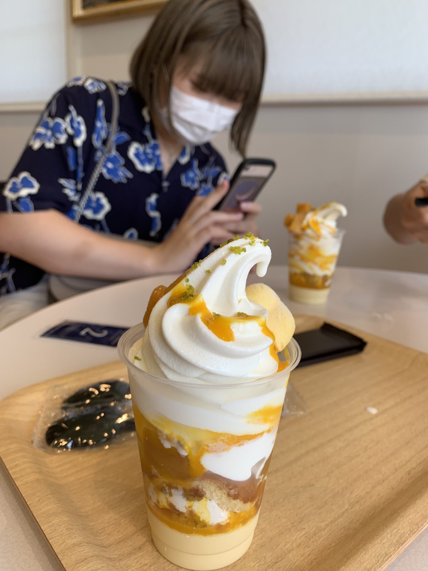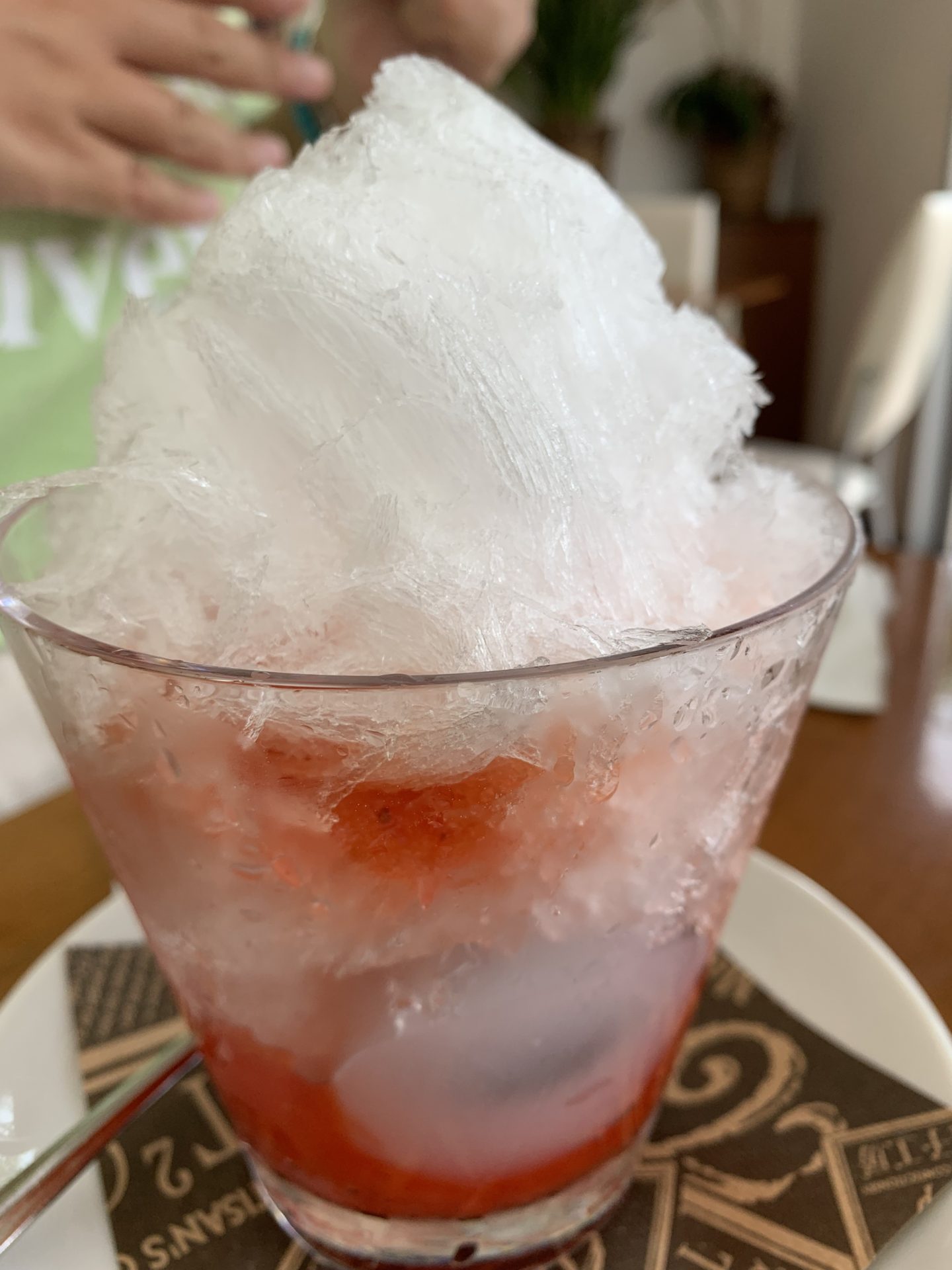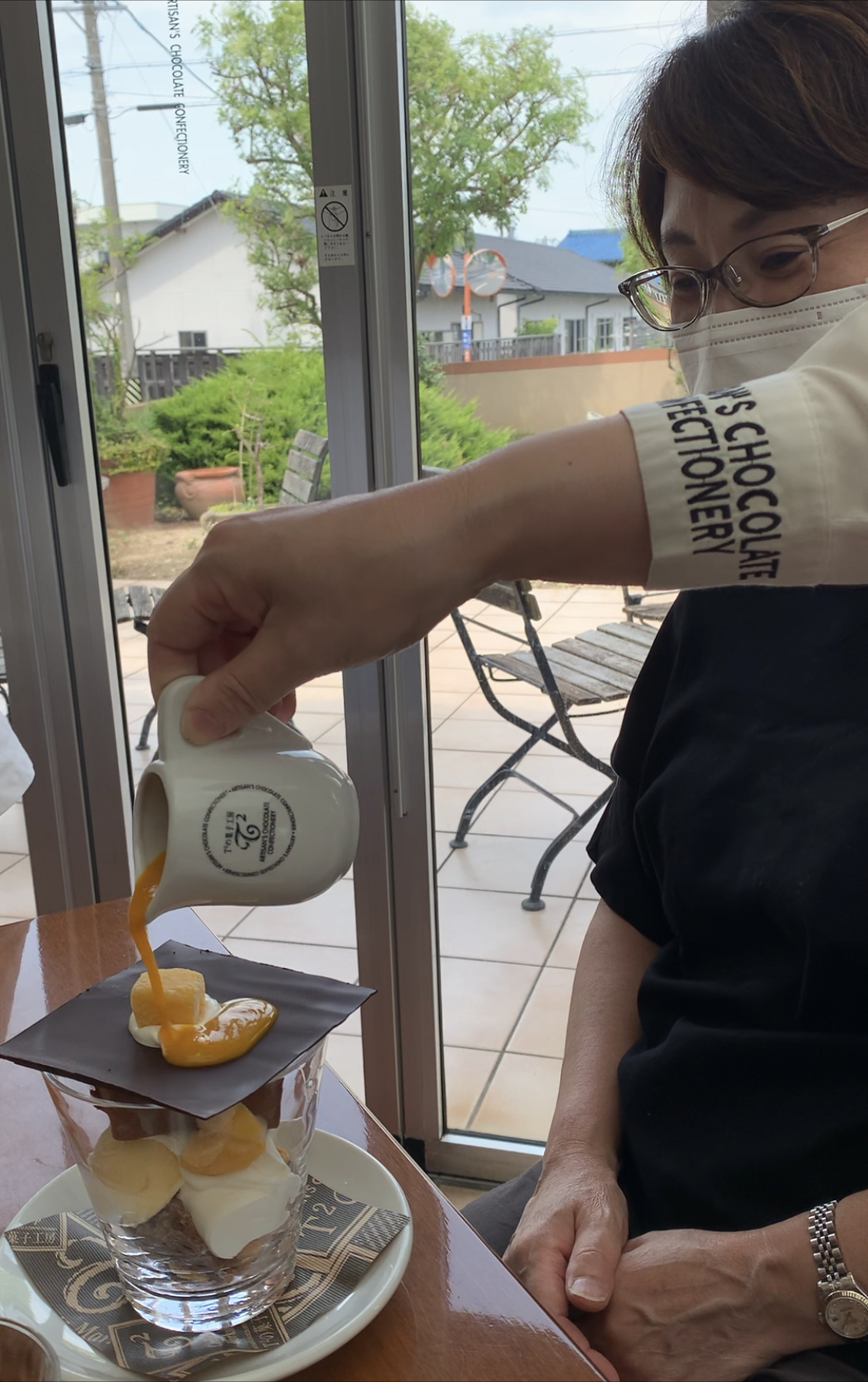 まず、アフォガートの登場。バニラアイス🍨が2個入ったボウルに熱々のエスプレッソコーヒー☕️が目の前で注がれます。初めて見る光景です。トレビアン❗️オシャレっつです。次にイチゴフラッペの登場。中にはここに居ますよと言わんばかりの美味しそうな水饅頭がグラス越しに見えています。そして前述のメイン、マンゴーパフェのit’sSHOWTIMEです。写真、動画の準備はいいですかと、スタッフさんが熱々のマンゴーソースをチョコシートの上から螺旋状に垂らします。そのソースの熱でチョコは溶け出し、コップの中のパフェの部分に滴り落ちます。great‼️もう芸術の域です。各々、満足してとても楽しい時間を過ごしました。特に嫁さんは大満足でした。
