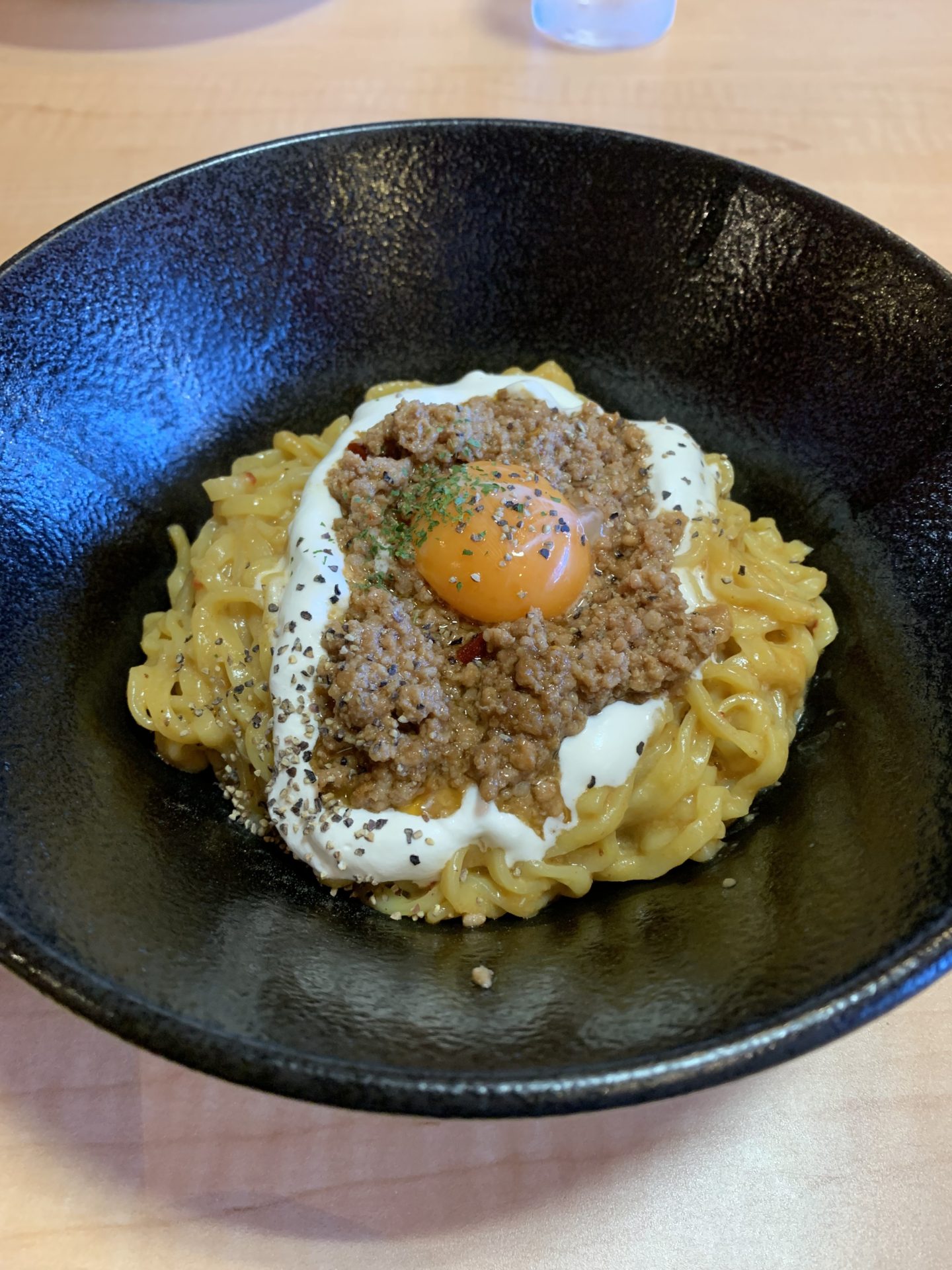 津市河芸町に『春夏秋灯』ラーメン店🍜があります。よく利用させて頂いているラーメン屋さんです。鶏がらベースのかき卵入りの『もっともっと美味しいラーメン』をいつも注文するのですが最近、いろんな事にチャレンジしてみようと思う今日この頃、『汁無し坦々カルボナーラ』にチャレンジです。東京でマスカルポーネチーズ入りの塩ラーメン🍜が絶品だった事を思い出し、ラーメン🍜にチーズもありと思うようになりました。そして今日は坦々麺にチーズインです。「はい、お待ちどうさま。汁無し坦々カルボナーラです。」提供されたラーメンは、もうパスタです。卵を混ぜて、坦々のひき肉をスクランブルします。実食。出ました。美味すぎちゃん‼️好みもあると思いますが、私的にはGOODでした。中華とイタリアンとラーメンの融合🍜でした。世界がこんなふうにバランスよくあればなぁと思うくらいでした。