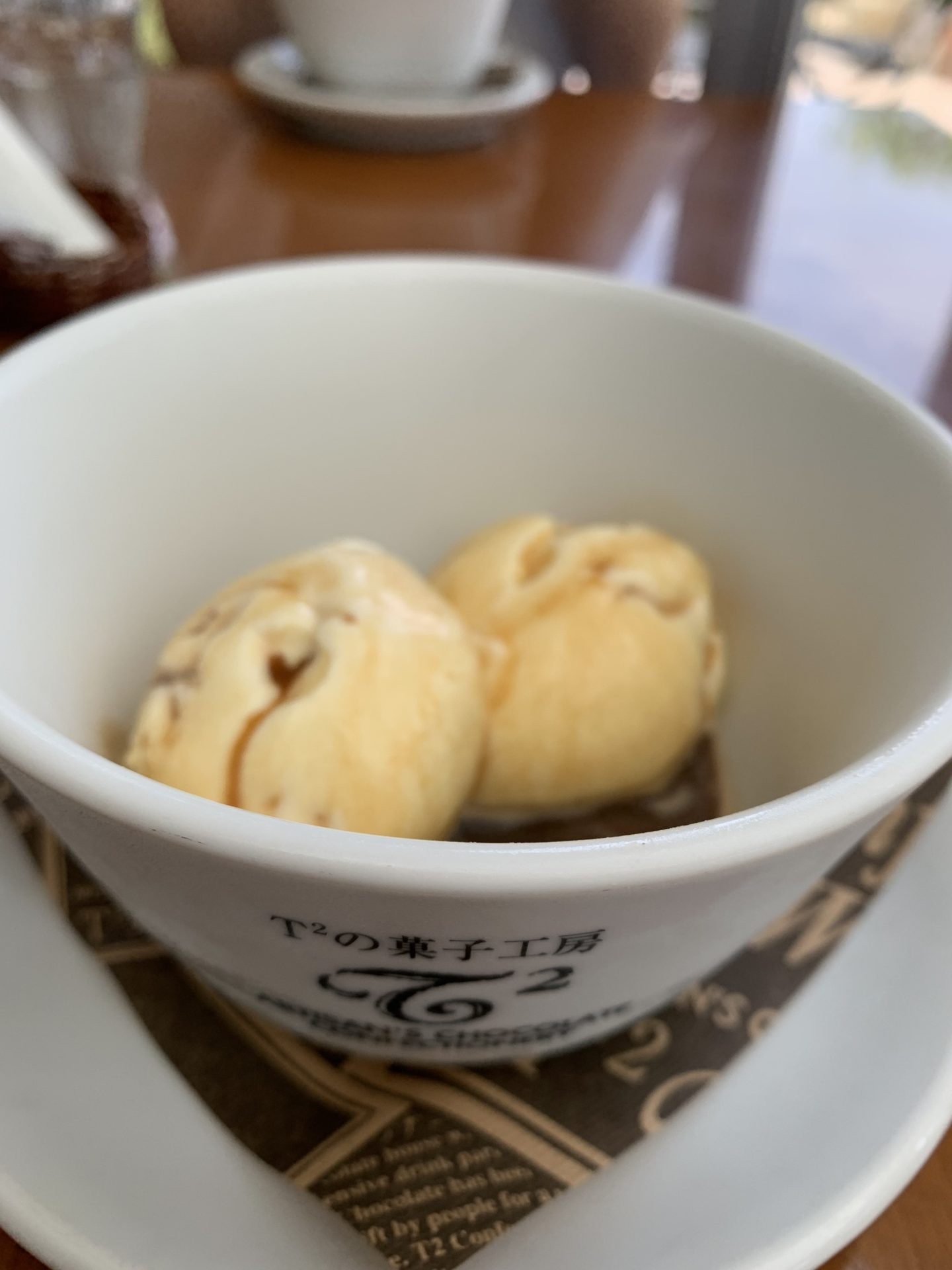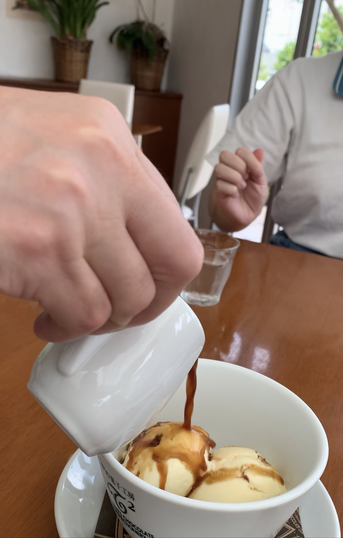 今日は、チョコレート菓子工房のT2に来ました。ヨットハーバーが近くとあってとてもお洒落なお店です。夏休みの暑い午後に、ひとときの涼を求めて榮家みんな、少しだけオシャレをしてやってきました。はじめは、コメダ珈琲店にしようかと家族会議で決まっていましたが、せっかくの夏休みなのでチョッピリだけ贅沢にと思い、ヨットハーバーまで来ました。落ち着いた店内に入りメニューを熟読します。バニラアイスにエスプレッソコーヒーをかけたイタリアのとってもオシャレなスイーツのアフォガート(私の人生初の言葉)を私と次女が、夏の定番のイチゴカキ氷に水まんじゅうが涼しげに入ったのを長女が、そして、本日のメインイベントとも言うべき一品、チョコレート🍫で蓋をされているカップ、そのチョコレートに温かいマンゴーソースをかけるとチョコが溶け落ちるという素晴らしいパフォーマンスを魅せてくれるマンゴーパフェを嫁さんが注文しました。