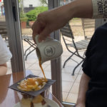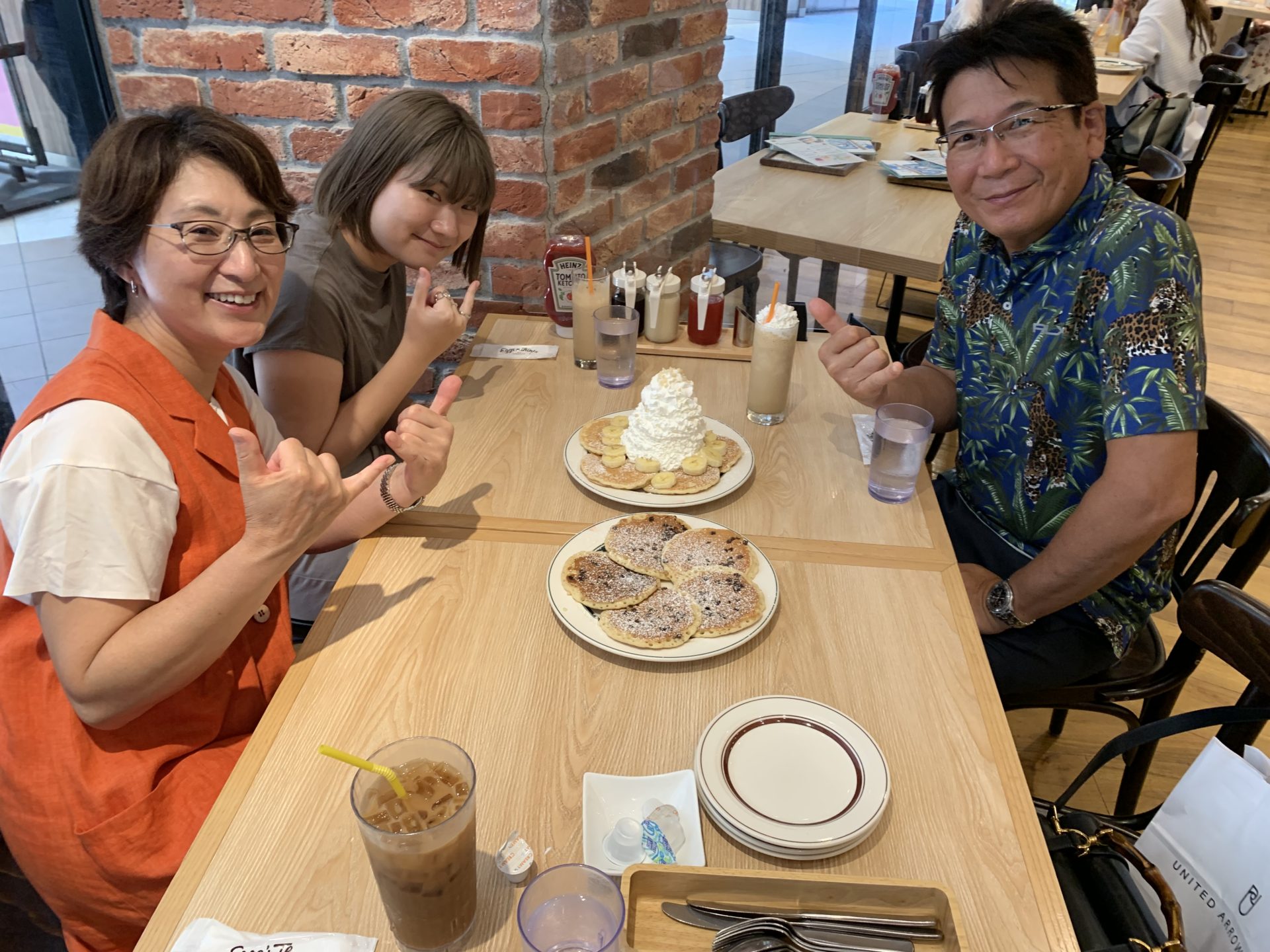 6時間余り十分に歩いたので、少しお腹が空いてきました。ハワイのパンケーキ🥞屋さんエグスンシングスで、お気に入りのバナナホイップパンケーキ🥞とチョコチップパンケーキ🥞を食べました。食べる前にスタッフが写真撮影🤳してくれます。🤙Alohaポーズで「はい、アローハ。」カシャツ。ここはハワイなんだと言いきかせながら。パンケーキ🥞を3人でシェアします。メイプルシロップをたっぷりとかけて食べました。そして、残り少なくなった頃に、ココナッツ🥥シロップをかけて食べます。ココナッツミルク🥥の味と香りは目を閉じればワイキキビーチの情景を運んできてくれます。