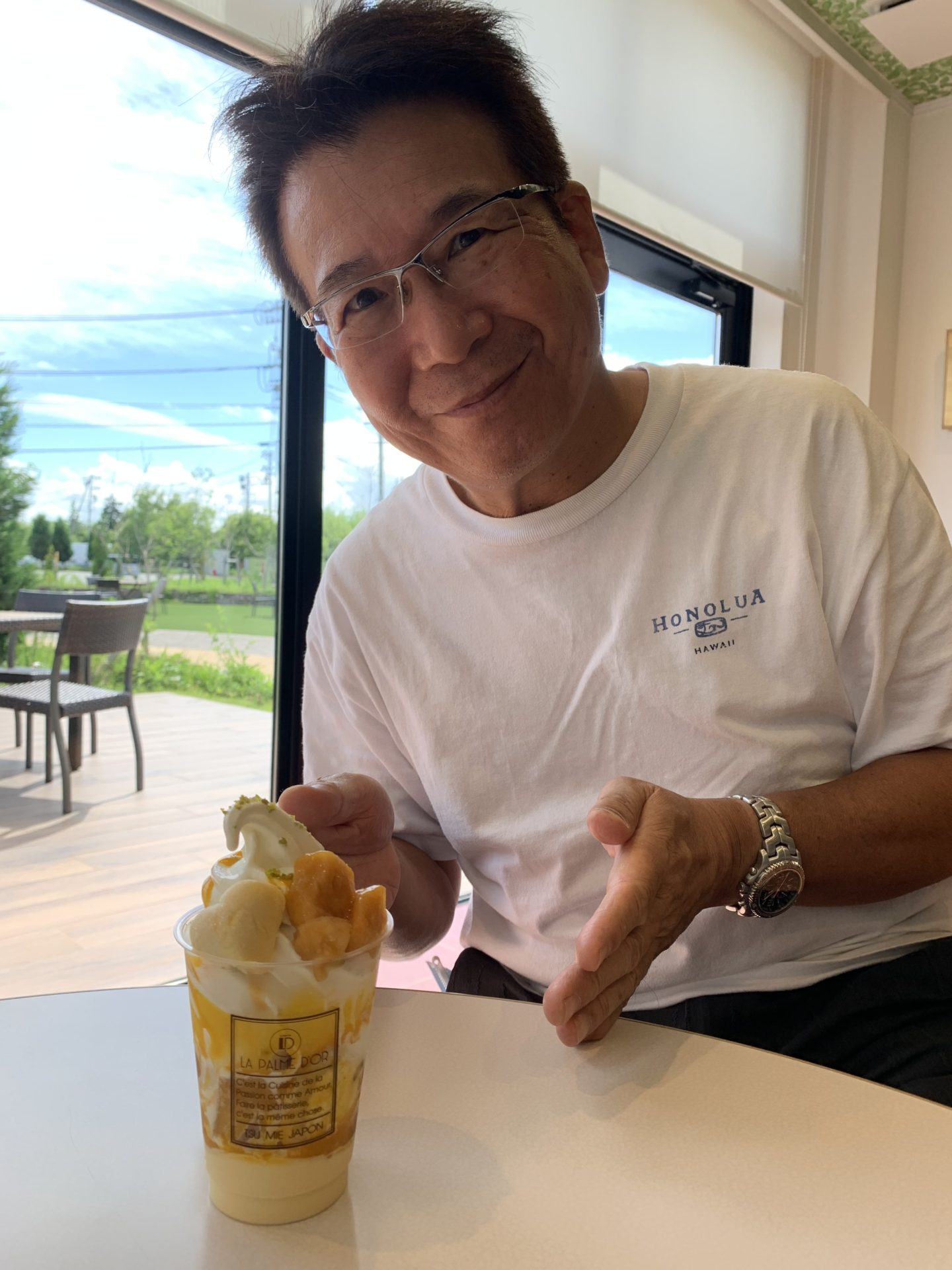暑い日、お気に入りの津市あのつ台にあるパルムドールでパティスリー特製パルフェを食べました。マンゴー🥭か苺🍓どちらにしようか迷いましたが、夏はマンゴー🥭ですよね。『濃厚ミルクソフトマンゴープリン&ごろっと果肉パティスリー特製パルフェ』ポスターに書かれたキャッチコピーと写真に私達の心は釘付けとなりました。ただ、その下にさりげなく表示してあるプライスに少しビビりながらも、自分にこう言い聞かせました。「後悔先に立たず」マンゴーパルフェ🥭を3つオーダーしました。洒落たイートインスペースに腰掛け、涼しい店内でカメラをポートレートのポジションでミラノコレクションのモデルさんのようにフォトグラフ(写真)を撮ります。今のカメラの技術の凄さに驚愕します。芸能人かと錯覚するほどの素晴らしさです。