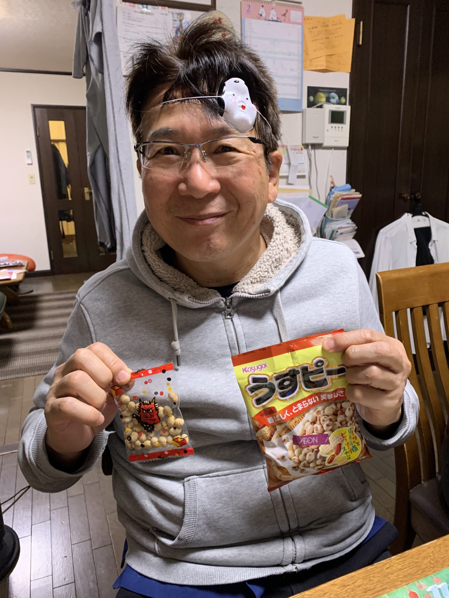 昨日は節分でした。恵方巻きを食べ過ぎて豆を食べる事が出来ませんでした。というよりも、歳の数➕1個の豆を完食する自信がなかったので今日になりました。「鬼は外福は内❗️」食卓の上で散らばらないように豆を撒きます。さて、豆の実食になります。そして毎年恒例の嫁さんの年齢詐称タイムです。ほぼ独り言ですが「えーっと、歳の数より一つだけ多い豆を食べるのだから・・・27個食べよっと。今年は塩ピーだから美味しいね。」「・・・・。」しばらく放置。サイレントトリートメント。「ダンナさん、なんか言ってよ。」「どのように答えたら喜んでいただけますか?27個やったら、まだ知り合ってへんやん。タイムスリップかっ!お姉ちゃんは奥さんが2歳の時の子かーい!えらい年の差婚やのー。俺はカトちゃんかーい!」榮家の毎年の節分の儀式的なもの、定番、B’zのライブだったらウルトラソウルの様なものになっています。仲良しの歯医者さんからもらった大豆で私の分の豆は足りました。ほぼ義務的に63個の大豆を黙々と食べました。口の中は唾液が吸い取られパサパサです。唾液の大切さを実感しました。嫁さんと娘は塩ピーを美味しく食べてました。少し羨ましく思いました。もらったオタフクの面を被り、ご機嫌な楽しい1日遅れの豆まきでした。