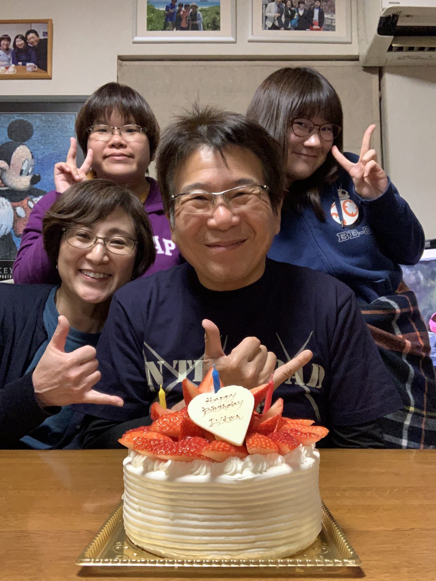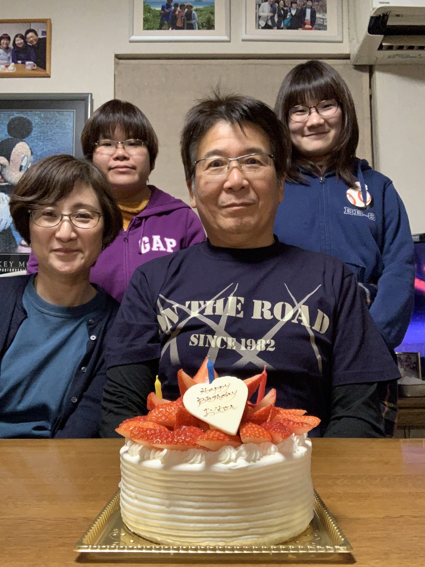 昨日の1月6日誕生日🎂は浜田省吾武道館ライブで1人で過ごしました。最高の自分への誕生プレゼント🎁でした。ライブが終わりホテルに帰り家族に感動を伝えました。いつも誕生日🎂の夜は家族で過ごすのですが昨夜は1人でした。少しだけど寂しく思えました。今日は、自宅で誕生会です。近くのケーキ屋🎂さんメリメロショコラさんのバースデーケーキ🎂にご機嫌さんです。浜田省吾武道館ライブのグッズで購入したTシャツ👕を着て記念撮影です。そして『ハッピーバーディトゥユウ♪』を歌います。いつもの様にマリリンモンローバージョンでも歌います。ロウソク🕯の火を消しケーキ🎂を分けます。もちろん第一選択権は私にあります。ホワイトチョコのプレートの権利もです。それとケーキ皿に残った生クリームをきれいに食べきる権利も与えられます。「お父さん、何歳になった?」「ドゥハハハハハッ。我が輩は10万62才になったのである。」いつもの私の誕生会でした。やっぱ、みんなが一緒の我が家での誕生日が最高です。