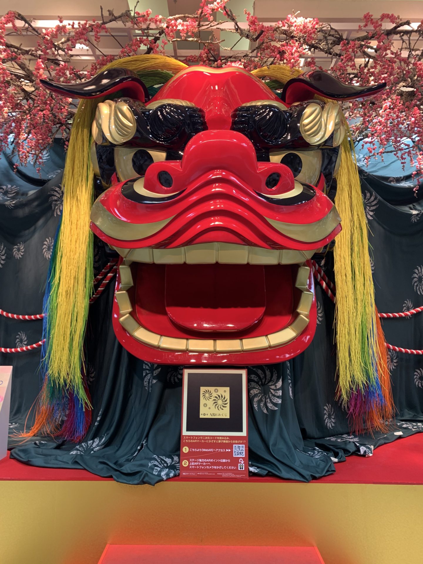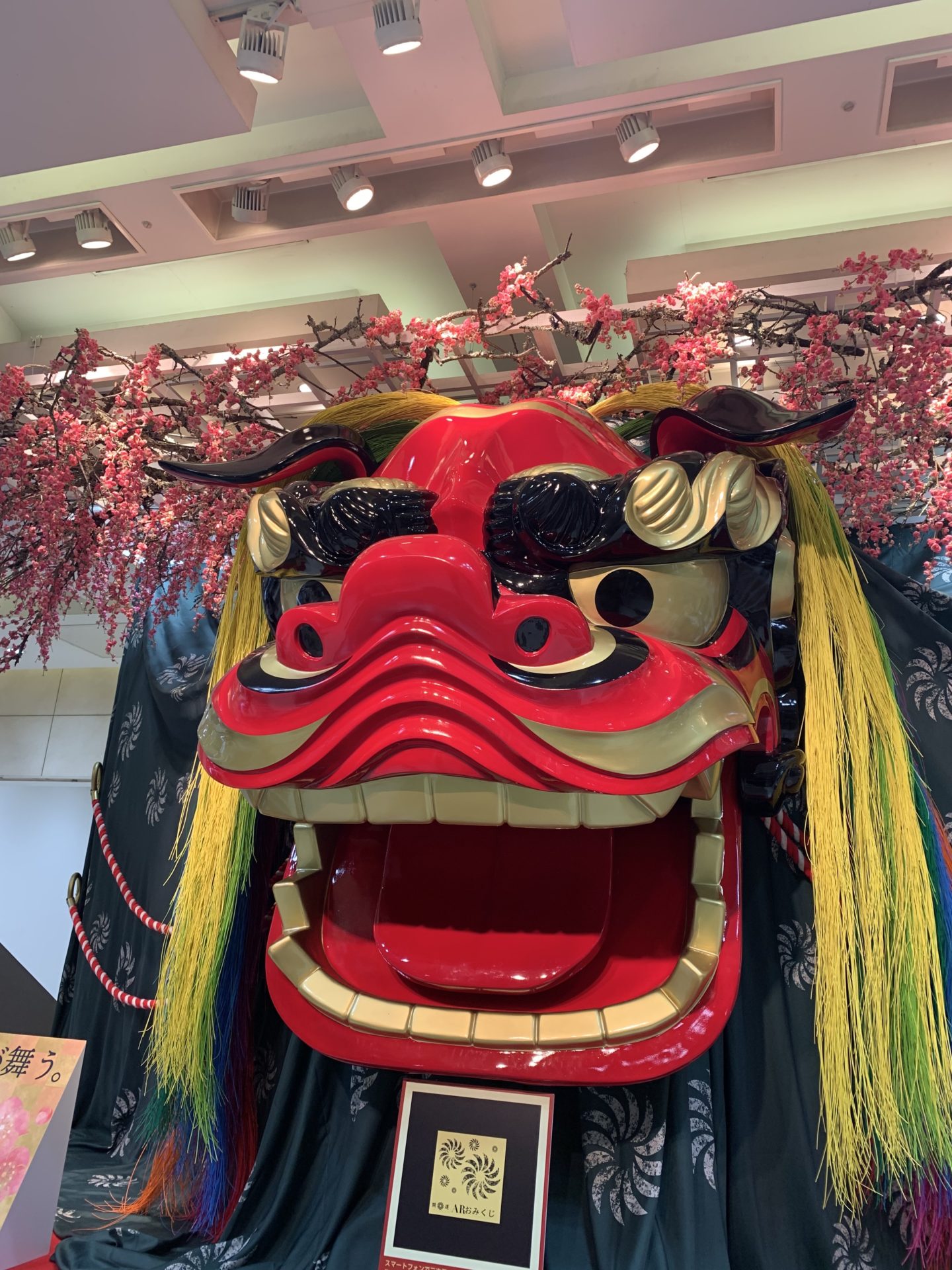 名古屋駅高島屋1階の装飾はまさに、the正月🎍というものでした。大きな獅子舞のお獅子が飾ってありました。すごくインパクトのある飾り付けに思わず立ち止まりました。記念撮影をしました。よく見ると立ち位置の印があり、そこからQRコード入力し撮影するとスマホの📱画面のお獅子の口からおみくじが出てきました。今やおみくじもデジタル時代です。一回目『小吉』2回目『末吉』。何とか大吉を出そうとトライしましたがダメでした。おみくじの助言(一番気になるのは恋愛運です。)を心に刻み込み今年も良いになる様にと決意するのでありました。