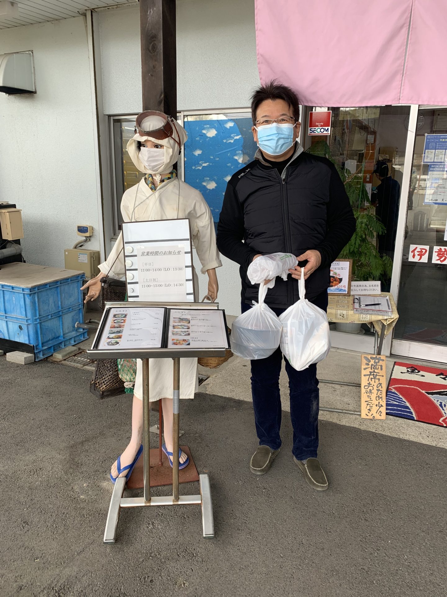 家を出る前に実家と娘用に『ちらし鮨』を3つテイクアウトできるように電話📞しておきました。鳥羽に向かう車中では『ととみ』の話題で盛り上がりました。鳥羽商船高等専門学校が近づき店に着きました。am11:15駐車場に到着。とと美ちゃんは、店の前で待っていてくれます。彼女のお気に入りの白コーデファッションです。もちろん、肩からは杉で作ったポシェット。久しぶりのだったので緊張していたのか、それとも別れたあの日、別れが辛すぎたのか一ミリもその場から動けずにいたのか一点を見つめたまま氷の魔法をかけられた様にじっとしていました。「とと美!待ってくれてたのか。あの日からずっと。」「・・・・・」相変わらず口数の少ない女です。店の前で待ってもらい私達は店内へ。
