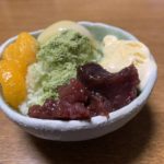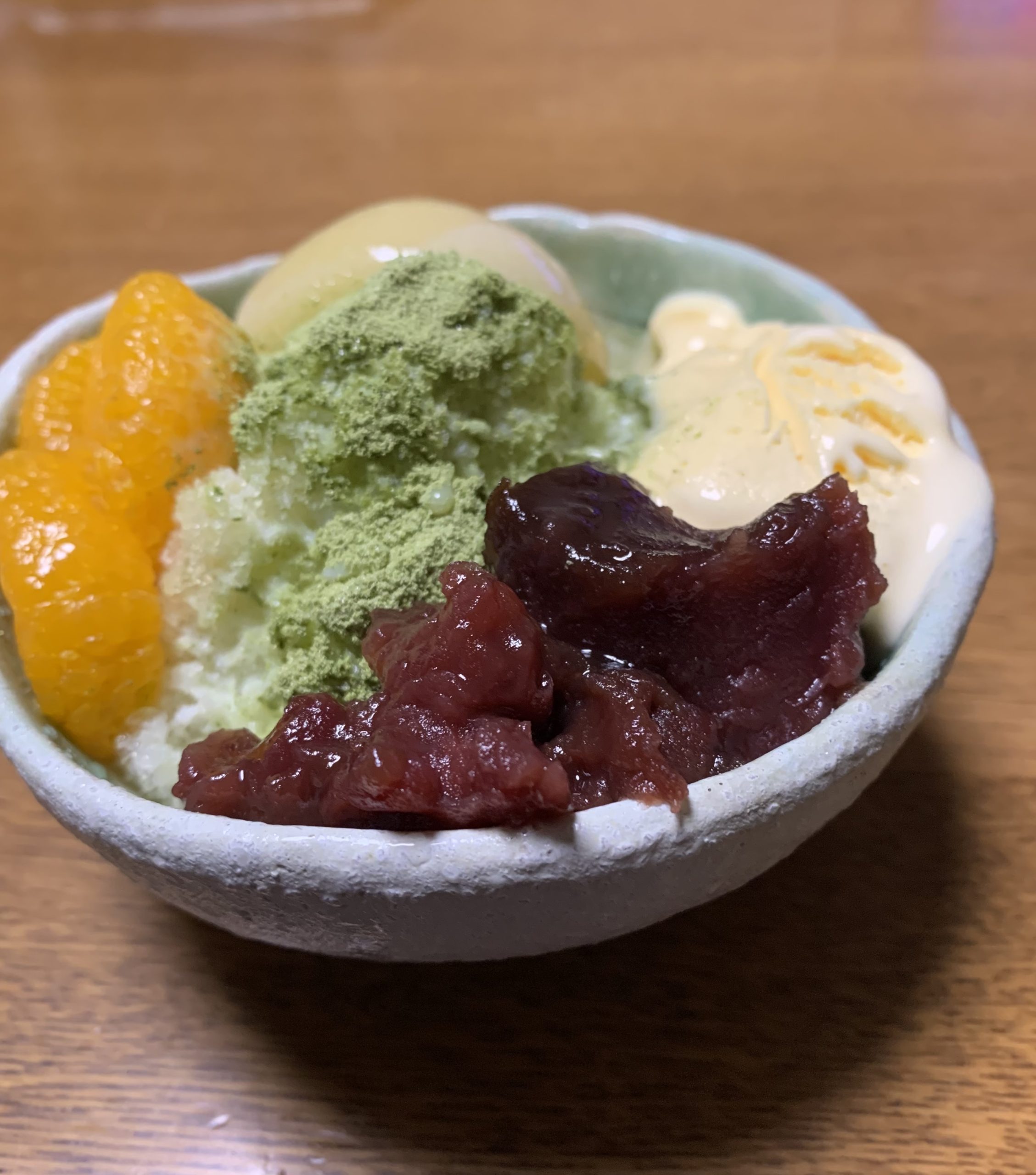 暑い日が続きます😵。こんな時は、カキ氷が最高です。夕食後に無性に食べたくなり、粒あん、練乳、バニラアイス、缶詰🥫ピーチをウエルシアに買い出しに行きました。グリーンティーは自宅にありました。”シャカシャカ”とカキ氷マシーンの涼しい音と共に、削り出される氷は盛り上げられ、つぶあん、ピーチ🍑、バニラアイス、ミカンをのせます。そして、グリーンティーをふりかけ、仕上げに練乳を搾り出します。