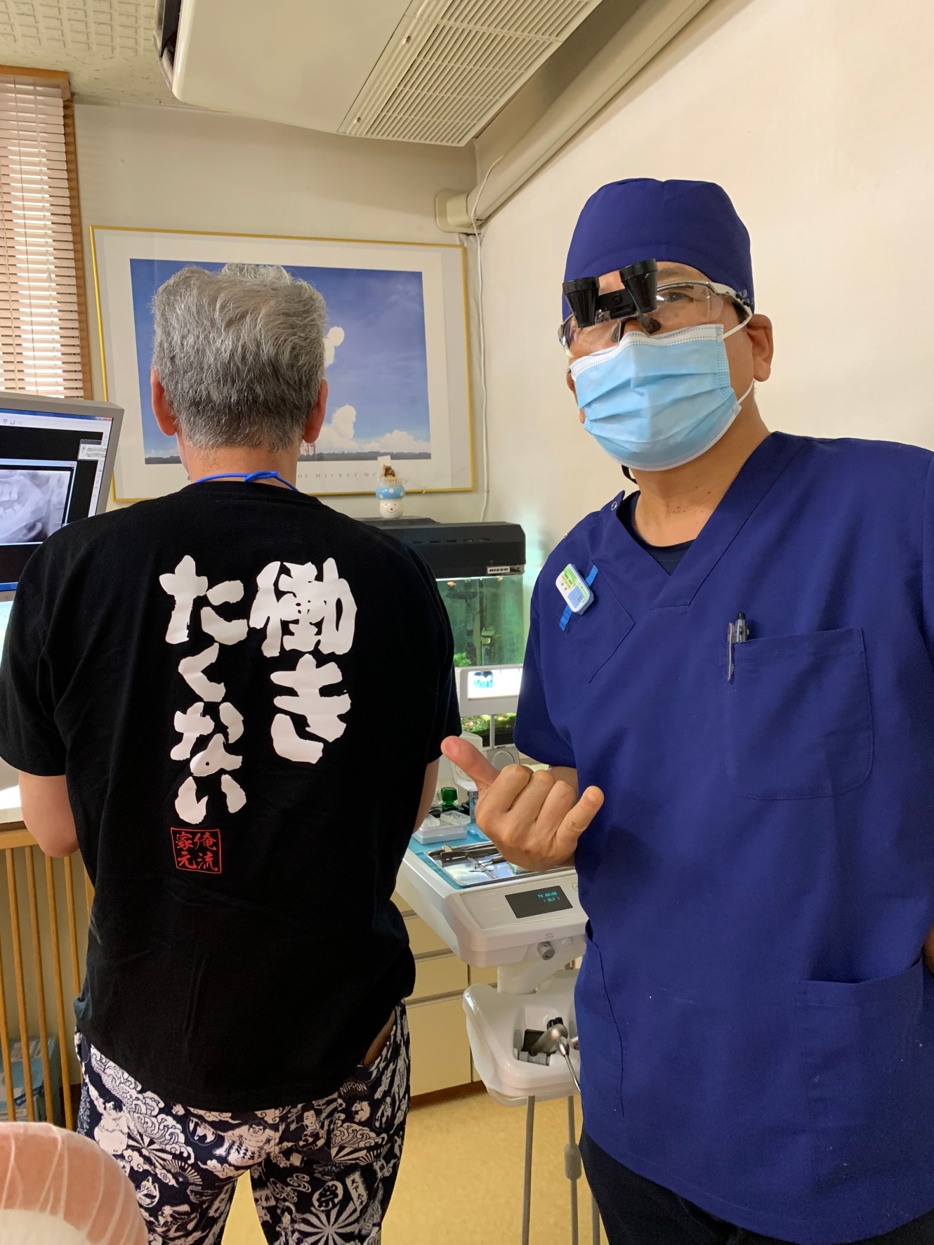 患者さんの背中に、思わず『なるほど』と、うなずいてしまいました。『働きたくない』。物静かな患者さんです。あまり冗談を言うような方ではありません。付き合いの長い患者さんです。詰め物が欠けて舌にひっかかるとの事で来院されました。診療台に座っている時には気がつきませんでしたが、治療が済んで立ち上がった時、黒地に白く書かれた文章に、心の中で、そのとうり‼️私の笑いのツボにクリティカルヒット。一緒の写真撮影お願いしました。