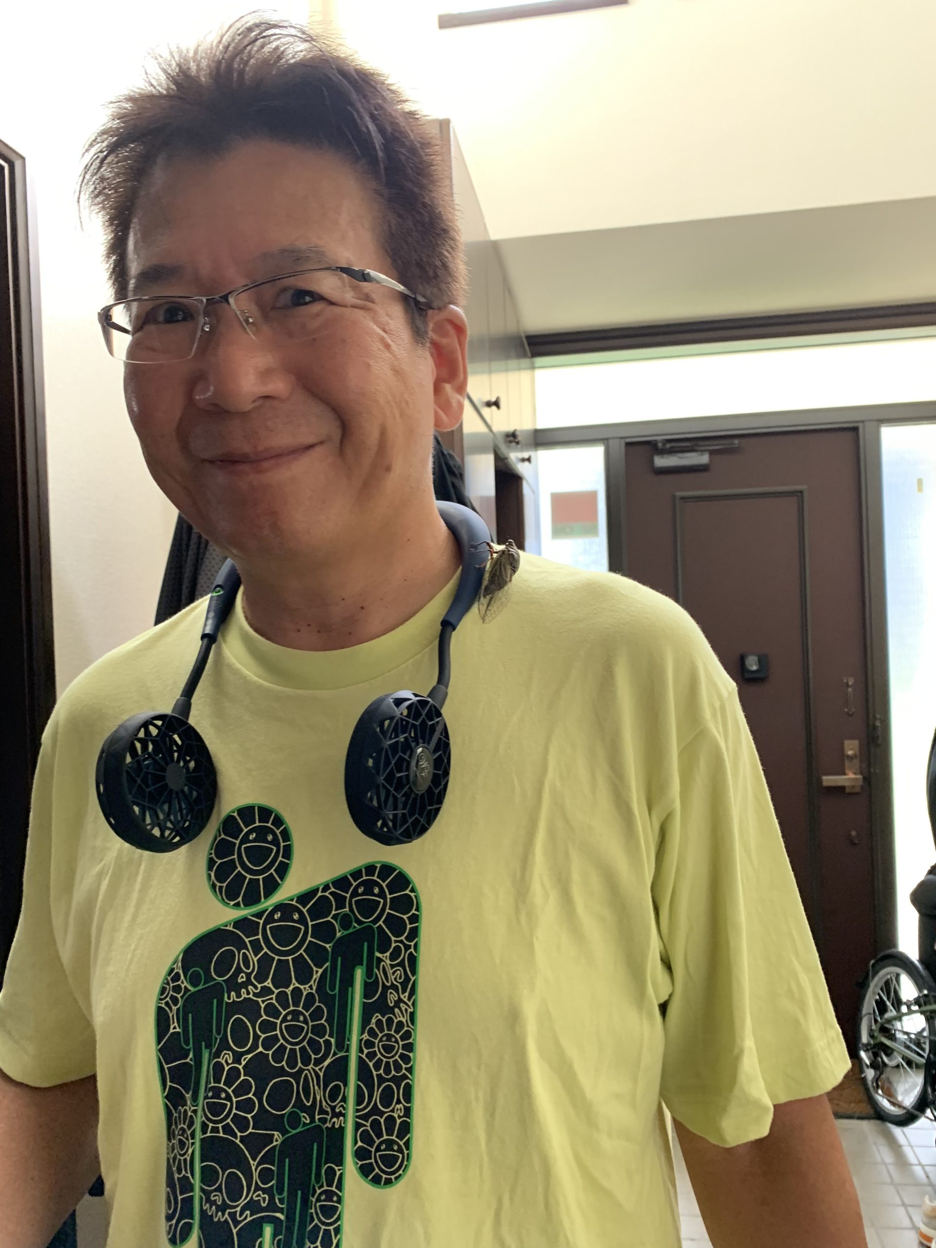 連日暑い日が😵続きます。炎天下の東京ドーム3個分の庭の芝刈りは大変です。首に掛ける扇風機はとても画期的で送り出される風は作業効率を向上させます。ユニクロで買ったビリーアイリッシュデザインのお気に入りのTシャツは、ビショビショになりました。シャワー🚿を浴びようと家の中に入るとカサカサと肩の辺りで気配がします。見ると👀セミが、首に掛けた扇風機にとまっているではありませんか。扇風機の快適さに惹かれたのか、それとも冷房の効いた部屋で涼しくなりたかったのか。とにかく、セミすらも音を上げるくらいの暑さです。室内でも熱中症になるこの頃です。水分補給に気をつけて健康に留意して下さいね。