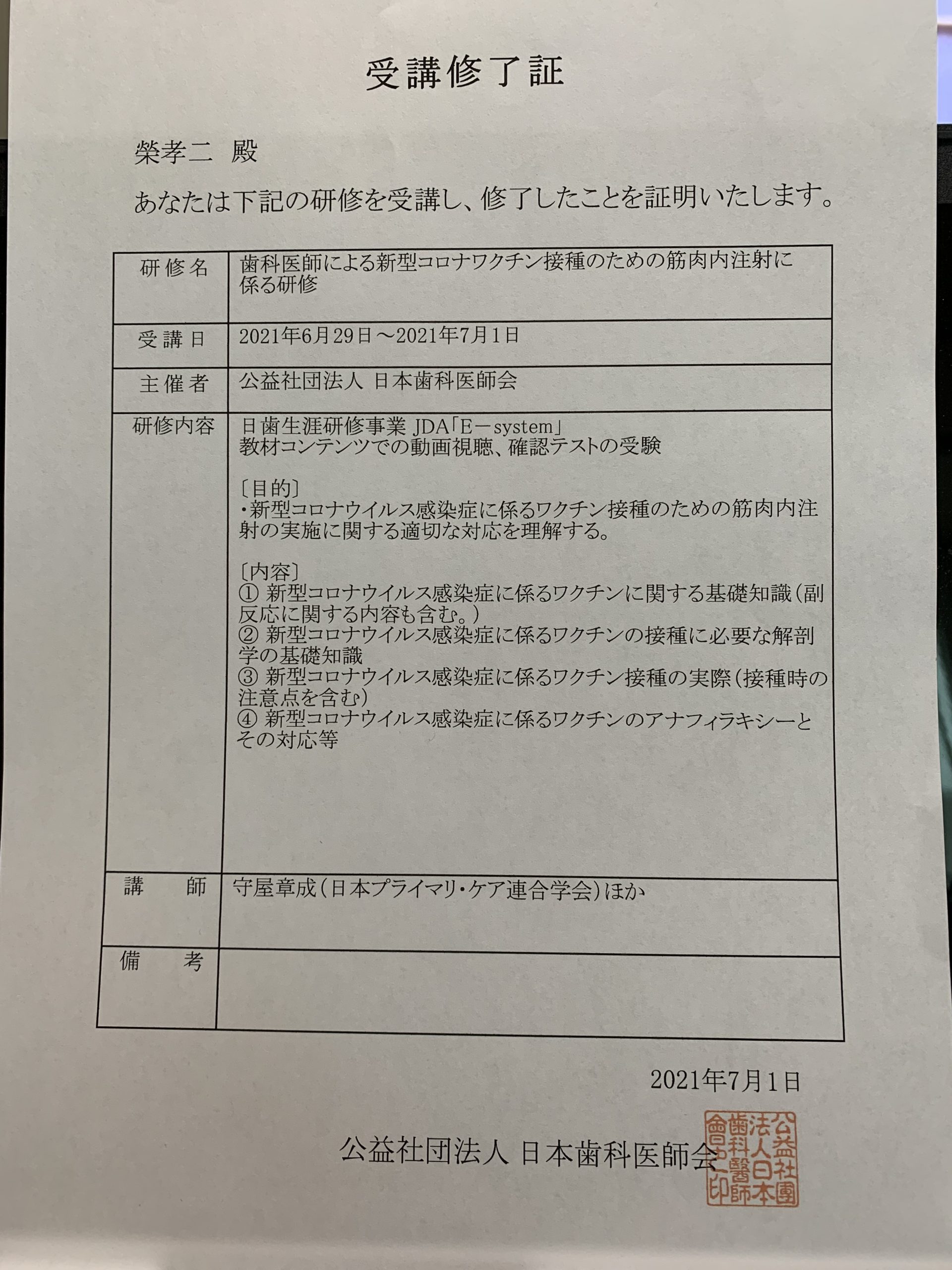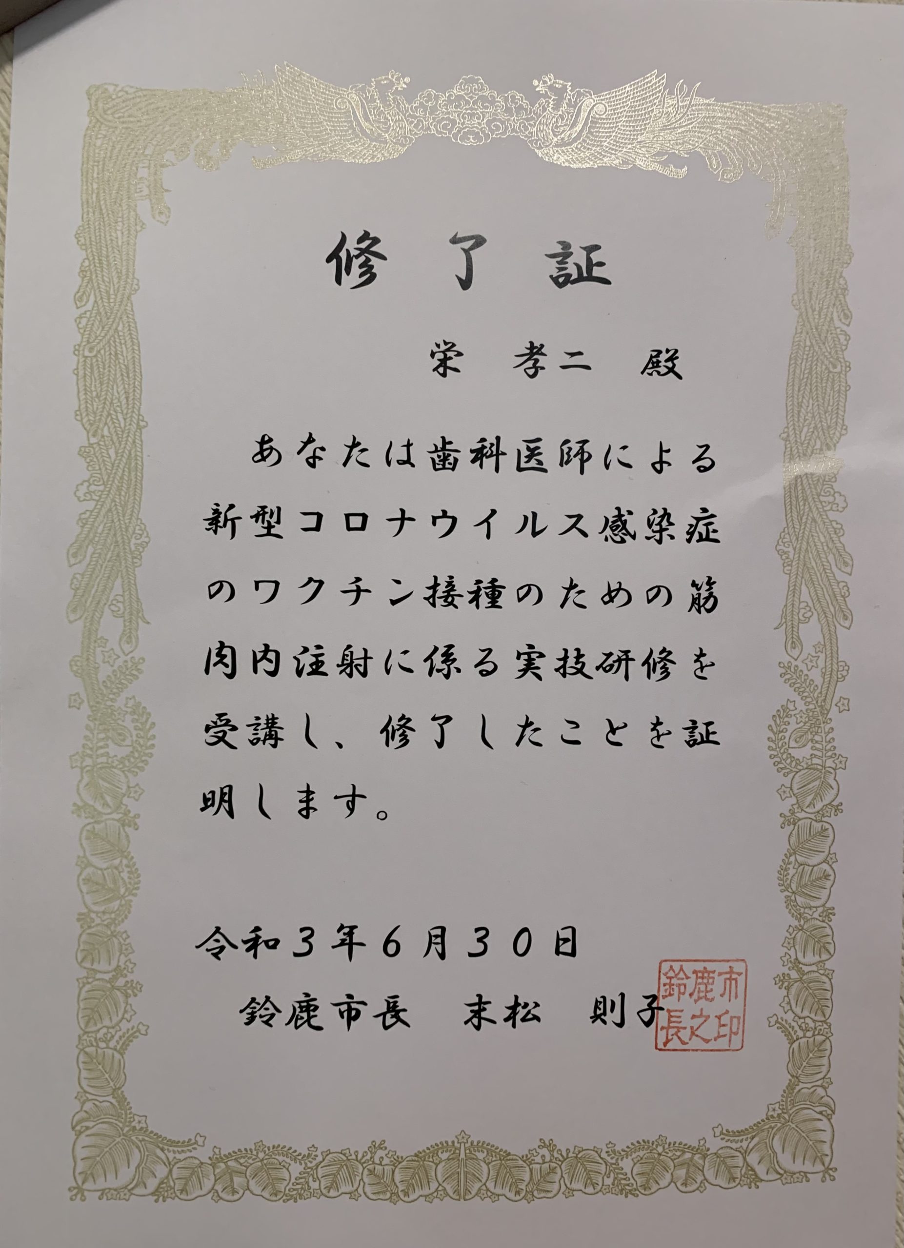新型コロナウイルス感染症を、終息させる為にはワクチン接種が有効な手立てです。そこで、医師、看護師だけでのワクチン接種では打ち手不足が懸念される為、歯科医による接種協力が要請されています。鈴鹿歯科医師会も鈴鹿市長からの協力要請がありました。そこで、日本歯科医師会主催の『歯科医師による新型コロナワクチン接種の為の筋肉注射に係る研修』をインターネットで受講し、鈴鹿市ワクチン推進課指導の下、実技研修を受けました。これで鈴鹿市からの要請があれば、私も協力させて頂くつもりです。