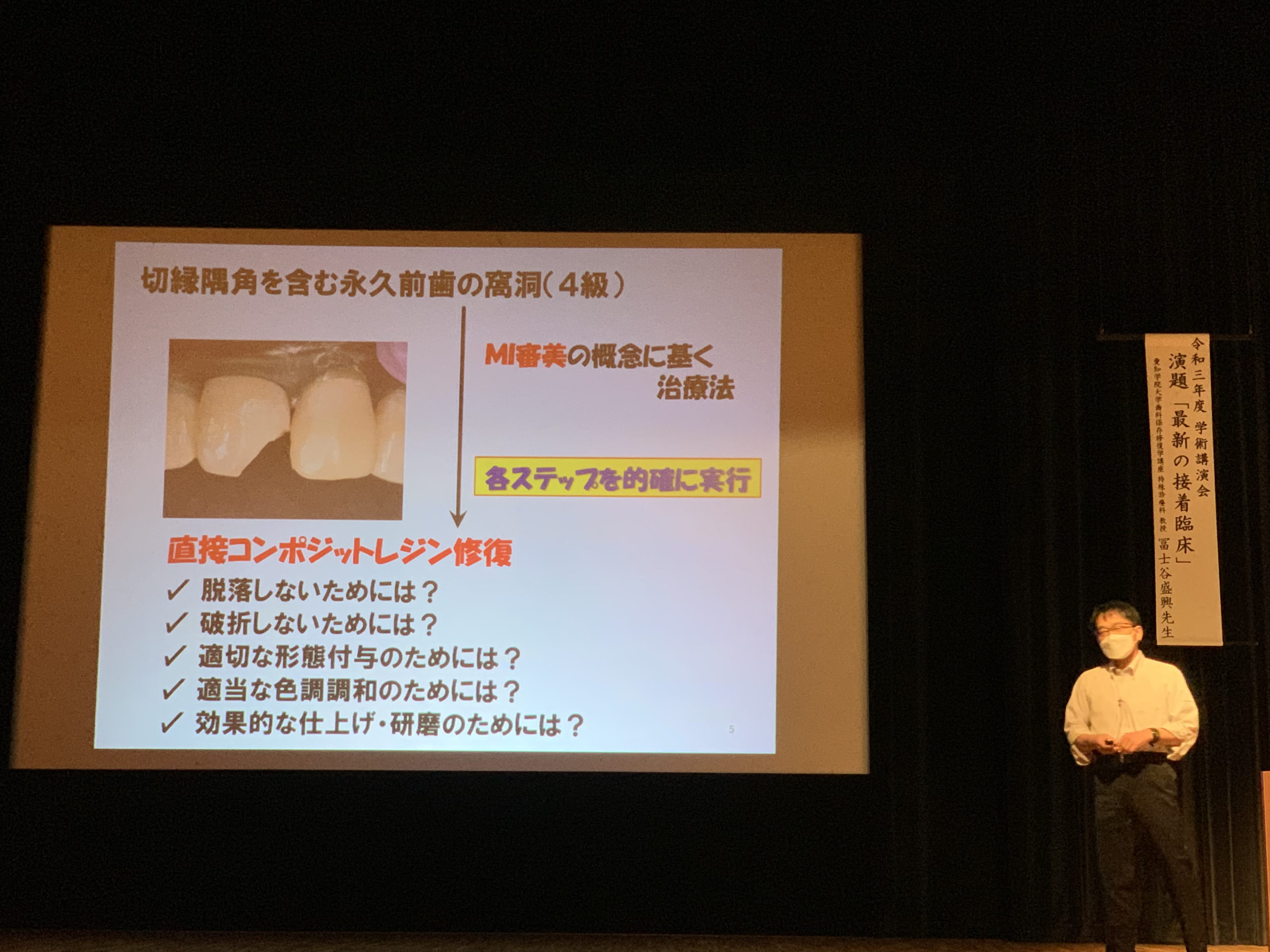 7月11日(日)10:00〜13:30鈴鹿市文化会館『けやきホール』にて令和3年度学術講演会が開催されました。今回の学術講演会は新型コロナウイルス感染対策の為、密にならないように席と席の間隔が十分とれるようにとの趣旨で文化会館『けやきホール』での開催となりました。広い会場設定もあり他支部からの先生方の参加もありました。講師に愛知学院大学保存修復学講座教授 藤谷盛興先生を迎え『最新の接着臨床』について、Part1 われないはずれないCAD /CAM冠(レジン冠、セラミック冠) Part2 外れない きれいな4級レジン修復のストラテジーが講演されました。日常臨床に直結する内容で、特に接着セメント使用時の前処理については特に興味深い内容でした。講演後の質疑応答にも熱が入って終了予定時間を過ぎても質問が絶えませんでした。