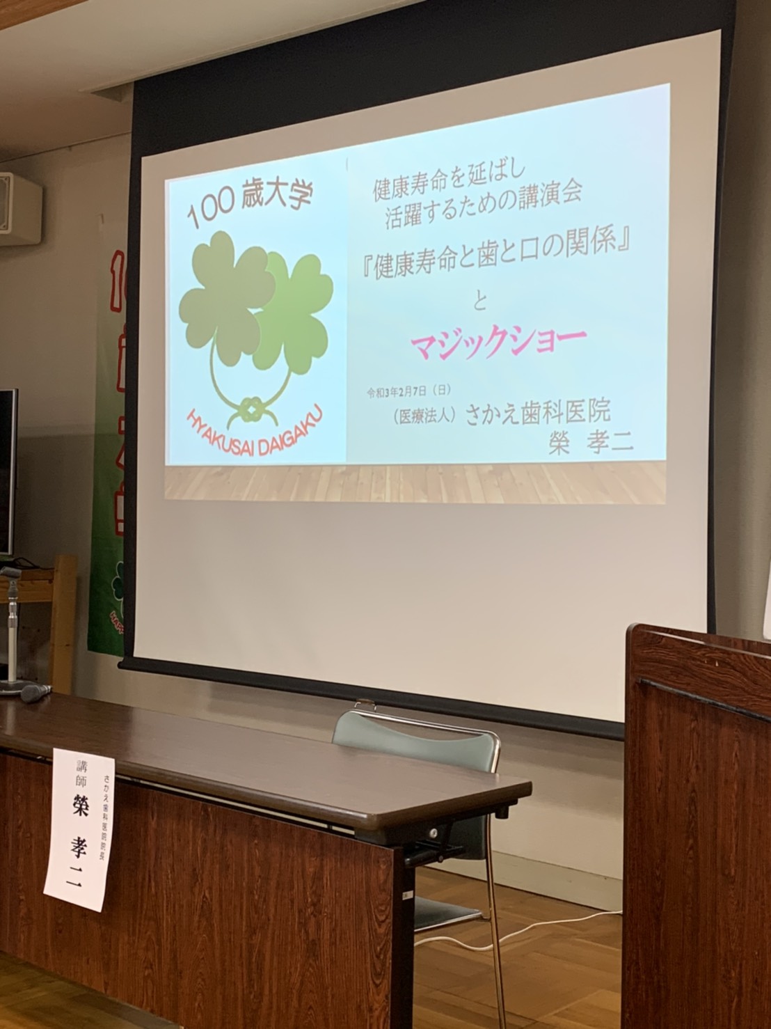 2月7日(日)13:30から、鈴鹿市ふれあいホールにて『100歳大学』の講義に行って来ました。昨年の春くらいに依頼を受けていた講演会です。講演の内容はオーラルフレイル(口腔機能低下症)と、誤嚥性肺炎のメカニズム、コロナ禍における口腔ケアについてなどです。そして、私の講演会にはお楽しみのマジックショーがオマケに付いてきます。時々、オマケの方が為になったと言われること多々あります。私本人的には、その方が満足しているのですが。公演開始の1時間前には、準備にホールでスタンバイします。パソコン💻を自前のプロジェクターに繋いで、スライドショーのチェックをします。学術的な真面目な講演の準備は、年末から頑張って独学でマスターしたパワーポイントなのでバッチリ👌です。そして、準時間がかかるのはマジックショーの準備です。アシスタントの妻、ひろみ・キャンベルの焼いてくれたマフィン、ポップコーン🍿などを仕込み、牛乳🥛、大根、キュウリ🥒、卵🥚、キャンディ🍬などの確認をします。まるでピクニックか、フリーマーケットみたいです。全ての準備完了後、講演会スタートです。聴講者の方々はとても勉強熱心でした。有難いことに中にはメモを📝とってくれる方もみえました。1時間半余の真面目な講義の後に、お楽しみ方マジックショーです。講演が白熱し過ぎたので、マジックショーの時間は30分になりました。用意していったネタの半分くらいしか披露出来ませんでしたが、皆さんには喜んでいただけた様に思えました。