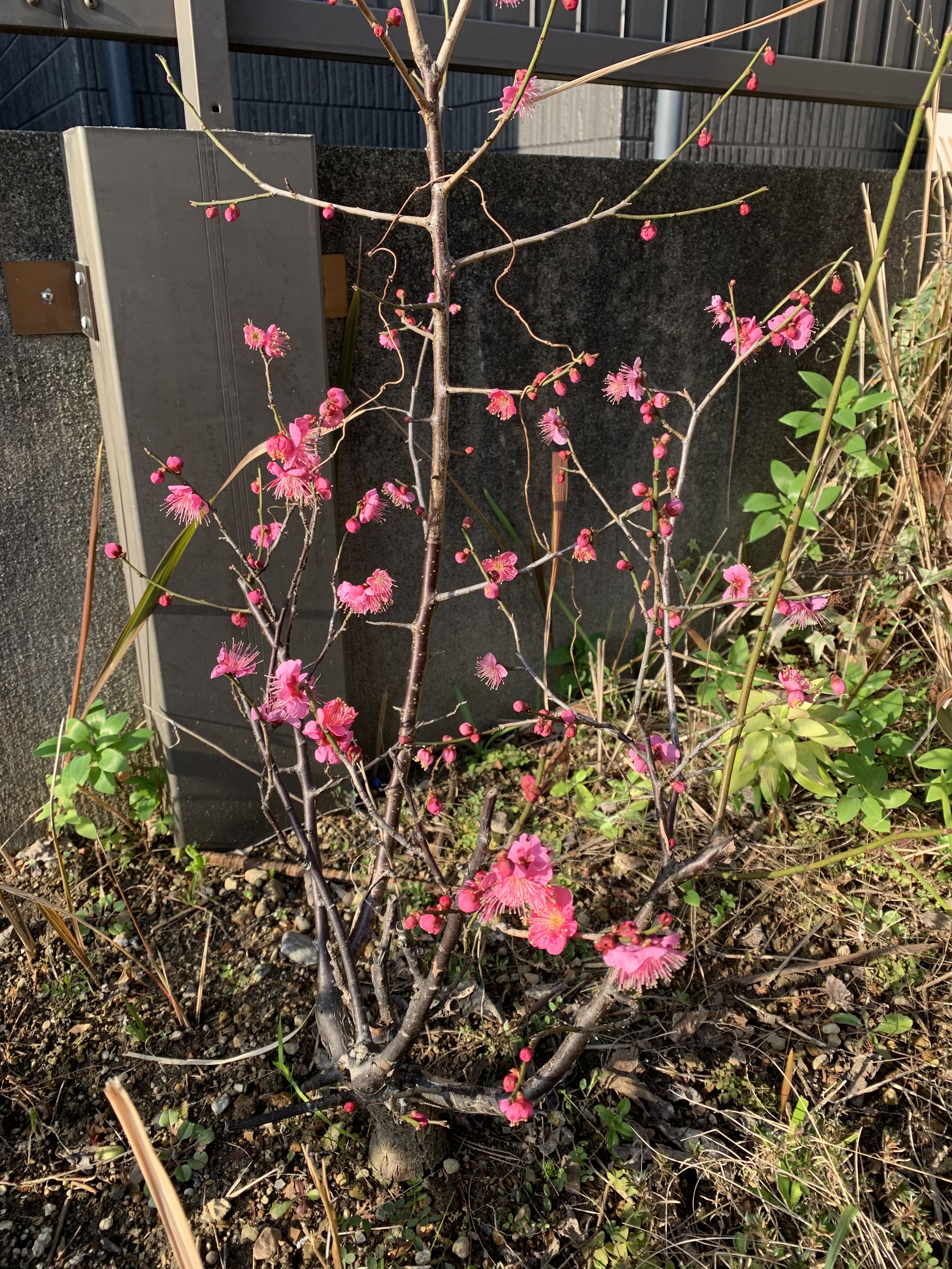 2月の初旬にしては暖かい日です。庭の片隅の梅の花が咲いているのを見つけました。この梅の木は、5〜6年前の12月31日の夕方にホームセンターで買った松竹梅の正月飾り鉢の中の梅です。年末ギリギリで閉店間際の売り尽くしの品だったので定価2980円が特別価格500円でした。正月が済んでから小さな梅の木だけを植え付けました。その時は、こんな立派なりしっかりと花をつけるとは思いませんでした。「桃栗三年柿八年」とはよく言ったものです。あれっ?梅は・・・何年?着実に春は近づいていますね。