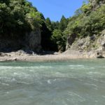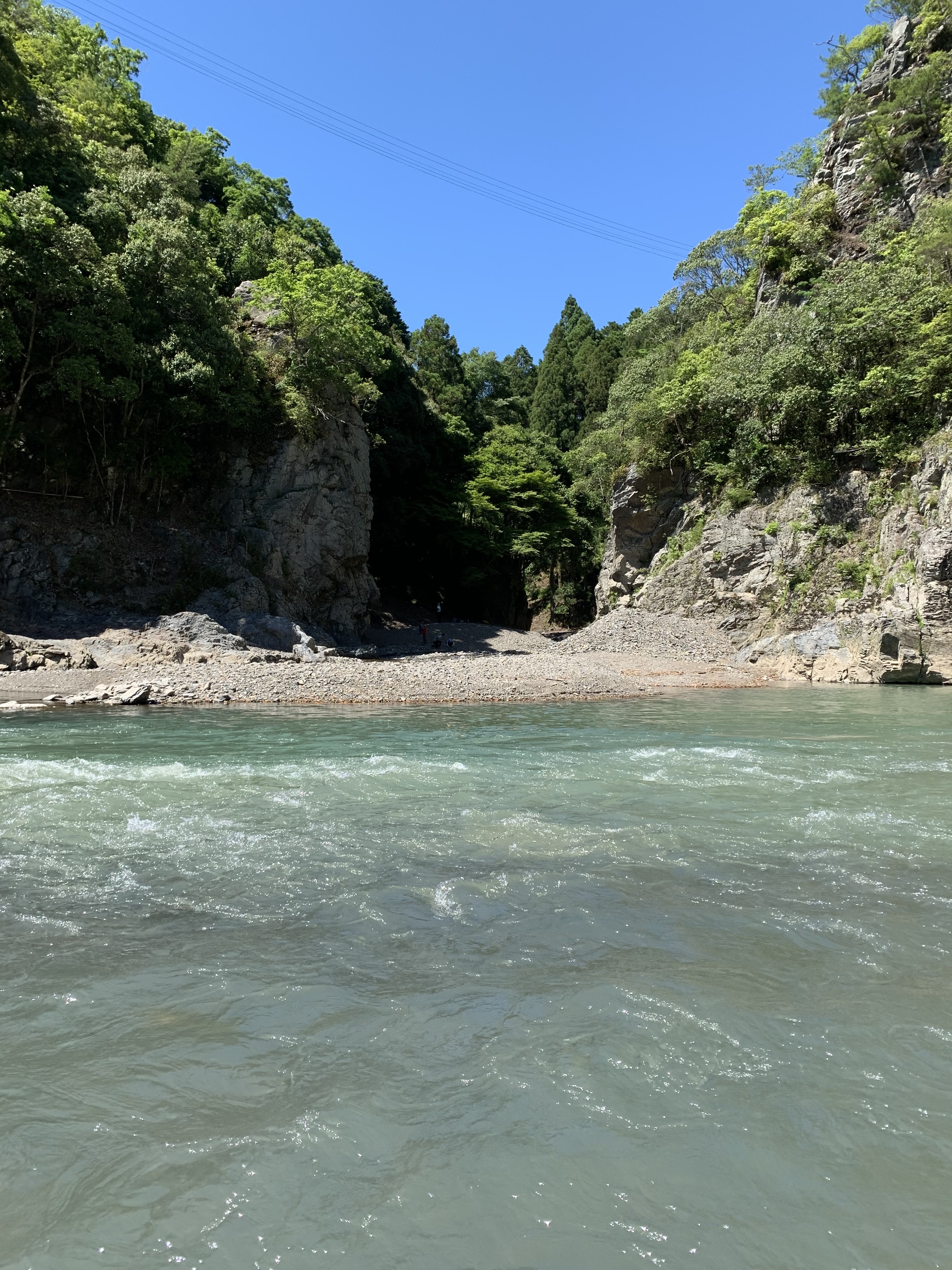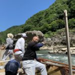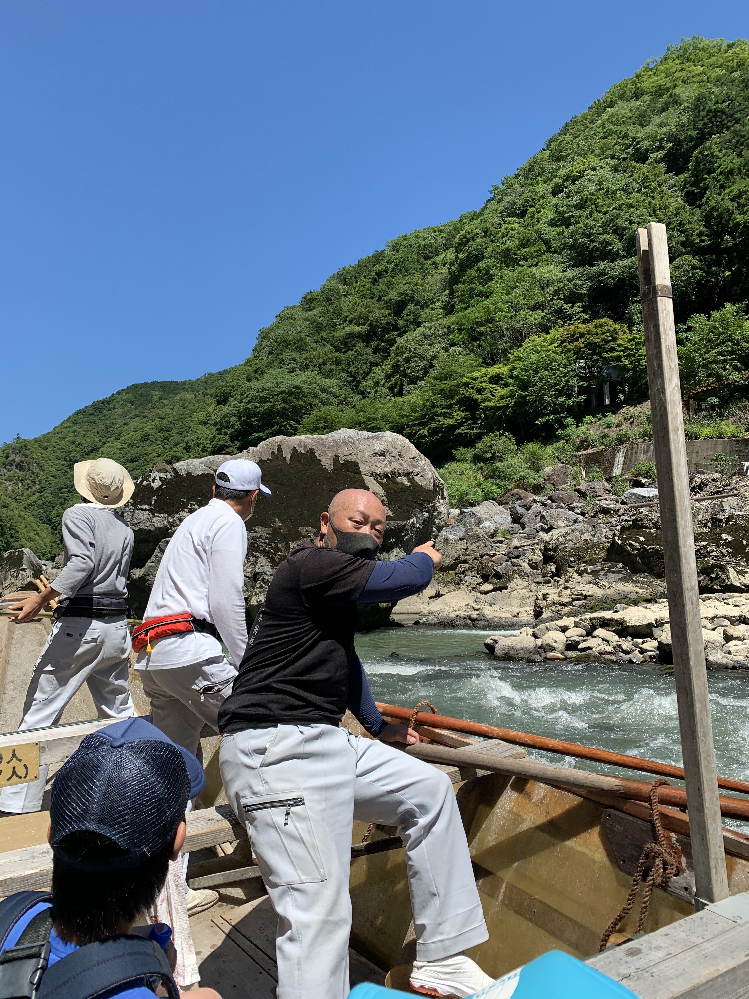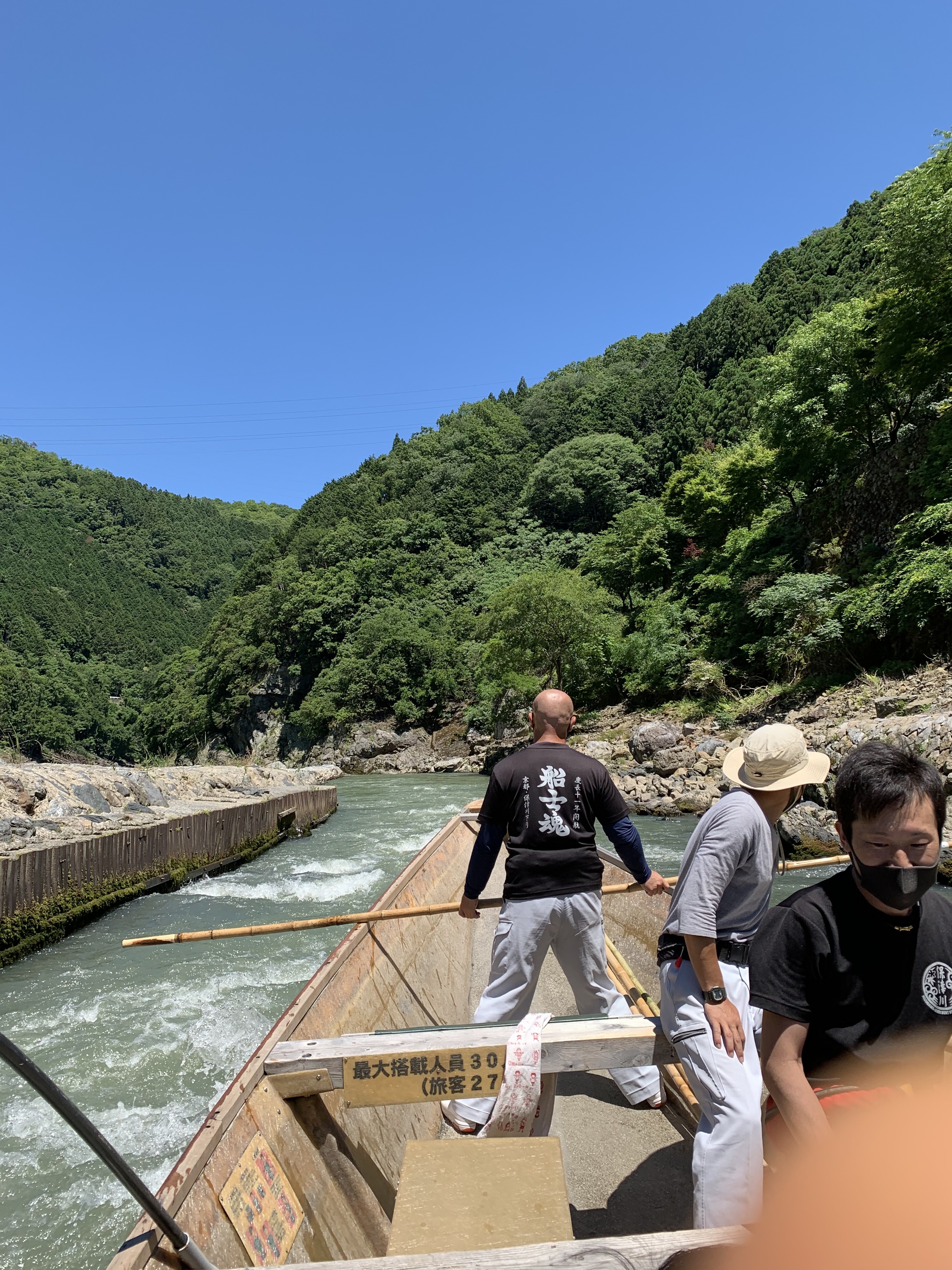 美味しい京都だし巻き玉子サンドイッチ🥪でお腹を満たしたところで、保津川下り乗船の時間がきました。ライフジャケットを腰に巻き川下りの舟に乗り込みました。一昨年の秋に川下りをした時と大きく違っているのは、みんながマスクをしている事です。初参加の娘2人は特にワクワクしていました。ゆっくりと舟は、河岸から離れ緩やかな川の流れにのって流れていきます。4人の船頭さんの息の合った舟さばきで安全に丹波の山並みをぬいながら、緩やかに流れていきます。案内役の船頭さんの絶妙な話術が更に楽しい舟旅を演出してくれます。所々に急流があります。そんな時、船頭さんのテンションも上がります。もちろん私達乗組員も水しぶきをかぶるのではないかとワクワクです。「サァ、第一の関門ですよー‼️」船頭さんの声。みんな足を踏ん張ります。ザブーン。波しぶき(思っていたよりもショボイ)が乗組員を襲います。キャー❗️同乗していた大阪から来た昔の娘さん達が叫びます。もっと若い子だったら「濡れませんでしたか?」と声をかけるのですが聞こえないフリして放置です。関所を沈没する事なく乗り越えたクルー達はお互いの生存を讃えあい、愛宕山、小倉山を眺めながら舟旅を続けます。川の流れに身を任せ、舟はのんびりと流れていきます。ひと時ではありますが日常を忘れさせてくれます。一時間半くらいの雅な贅沢な時間を堪能し舟は渡月橋近くの船着場に着きました。アラビカ京都嵐山にてお洒落なアイスカフェラテを買い、桂川を眺めながら少しだけリッチな気分なティータイムを満喫しました。