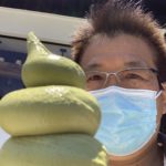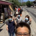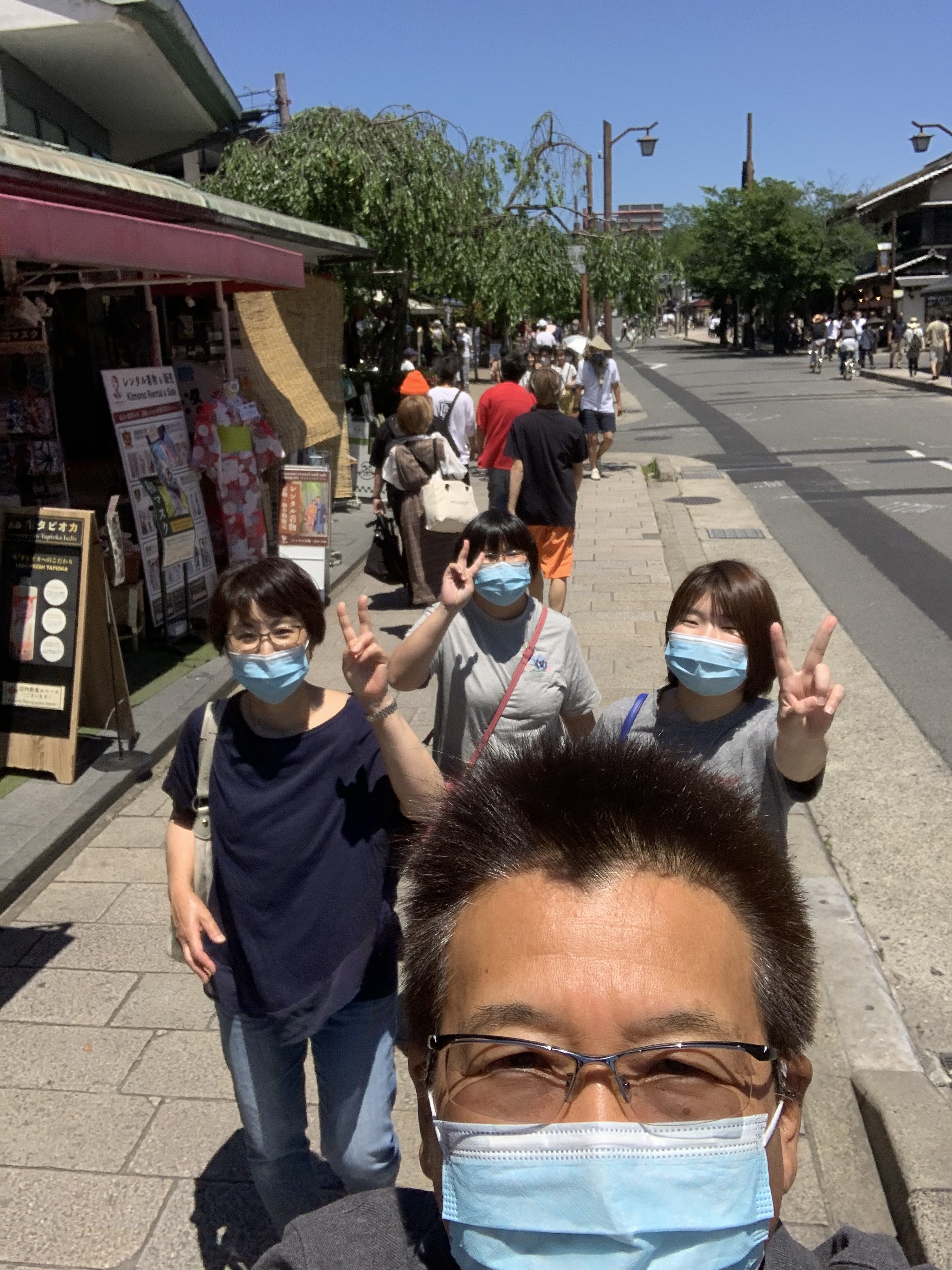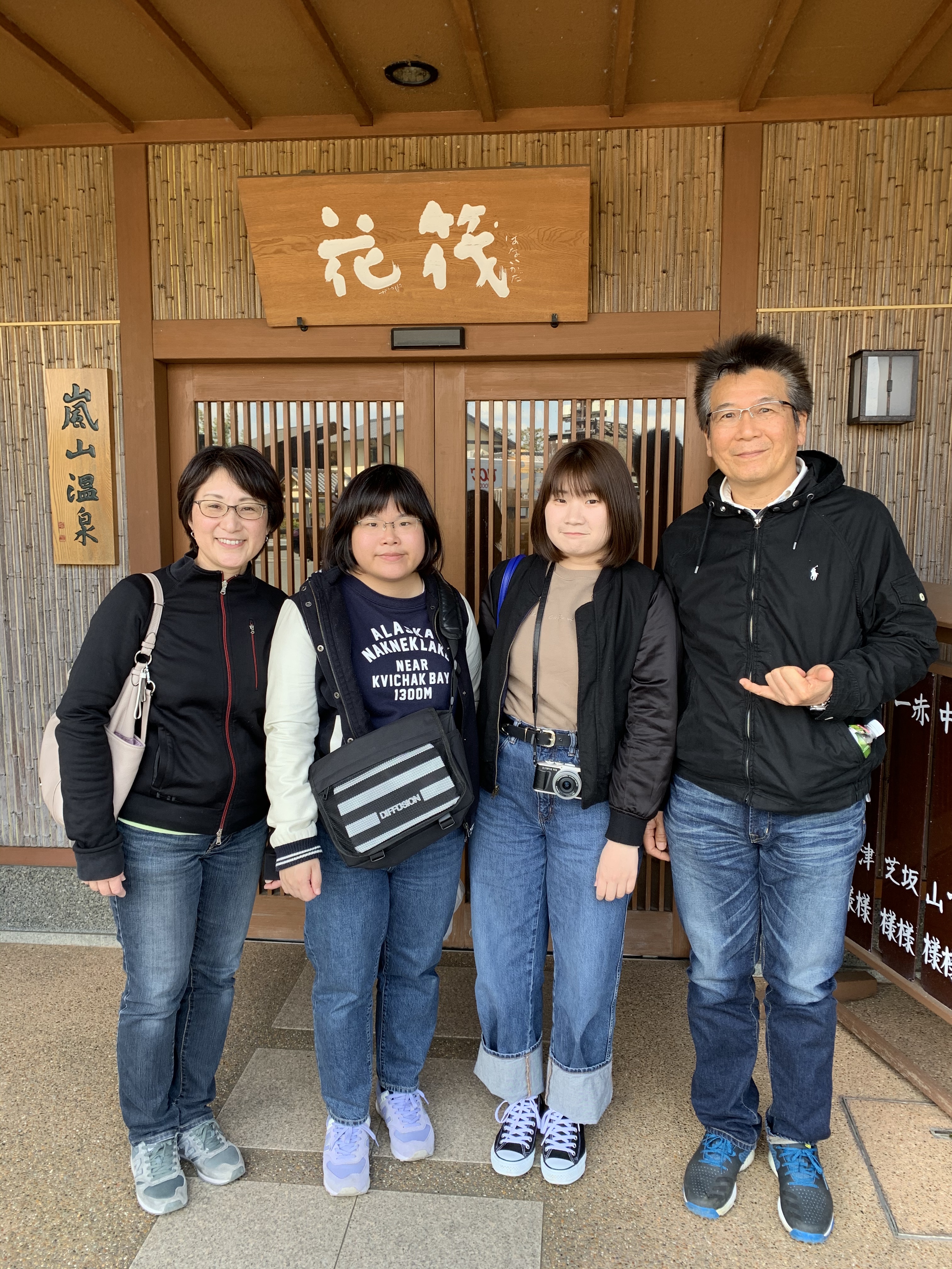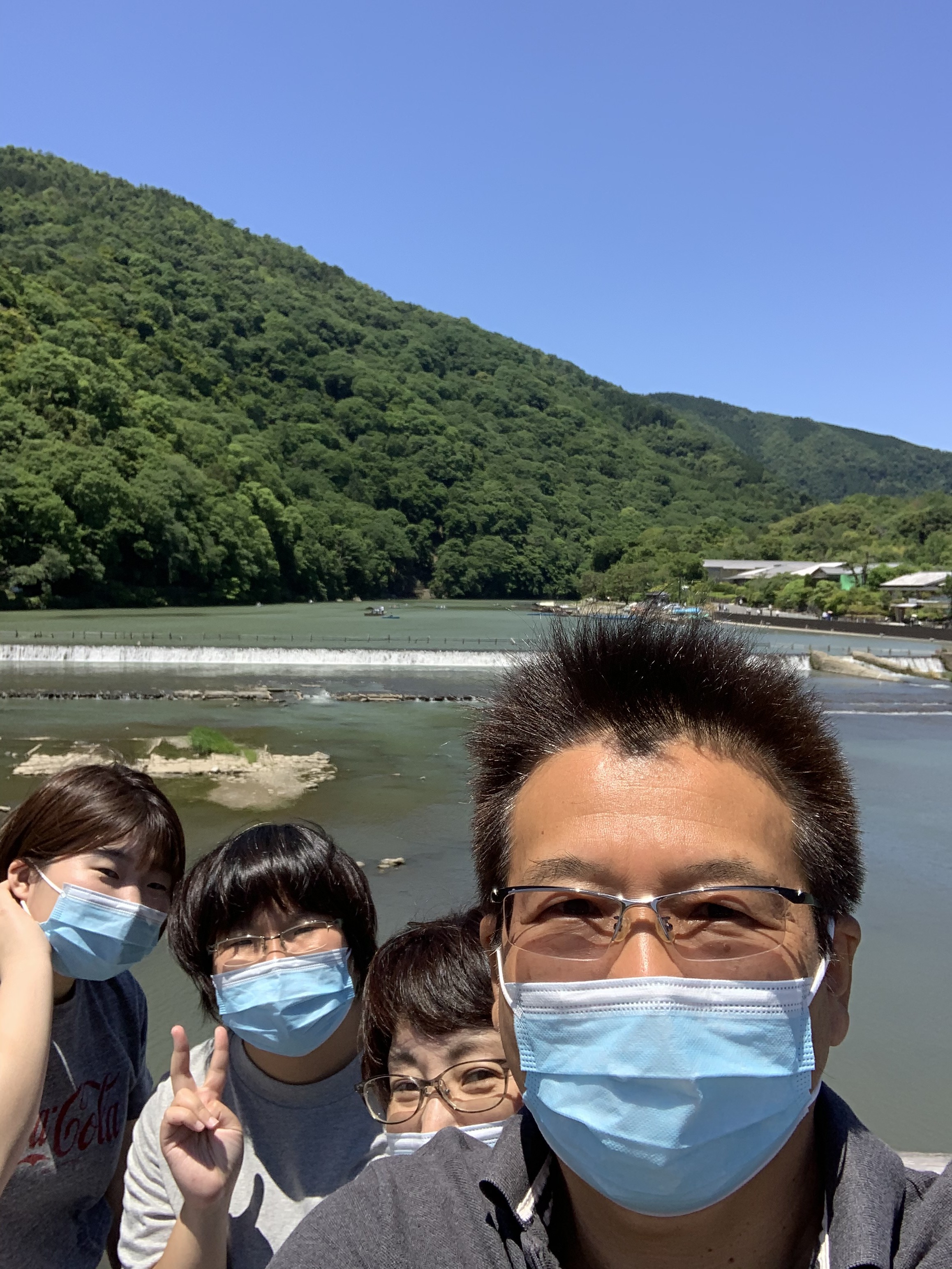 新型コロナウイルス感染症拡大非常事態宣言も解除され、久しぶりに京都嵐山に行きました。第一の目的は以前に行った事のある、嵐山渡月橋を渡った所にある『花筏』旅館で食べた湯葉懐石が美味しかったので、もう一度食べに行こうと計画しました。そして、女将さんが美人女将として有名なのです。2013年9月台風18号による大雨で桂川が氾濫し渡月橋周辺は洪水で『花筏』も浸水しました。朝のワイドショーで取材された女将さんを見た時、大変な事態になっている状況で気丈に振る舞う女将さんに一度会いたいという衝動に当時駆られました。今年初旬に湯葉懐石を食べに行きました。初湯葉料理体験だったので全てが新鮮でした。大きな鍋に沢山入れられた豆乳を沸騰させ、火を止め、豆乳表面にできた膜が湯葉です。それを菜箸で集めて食べます。なかなか上手く集められませんでしたが慣れてくると、沢山湯葉が獲得する事ができます。親娘4人で時計回りに順番に湯葉を作って食べました。流石榮家、もちろん盛り上がります。コンロの火を止めるタイミングが遅かった時、その時です、女将さん登場です。「もうそろそろ火を止めるください。」あまりにも突然の登場に、あれほど会いたかった女将さんなのに、一言も話せませんでした。家族団欒の時間を過ごし、会計🧮を済ませる時、コッソリと嫁さんに「女将さんと写真が撮りたいと言って下さい。」と頼んだら「そんなん、自分で言いなさいよ。」と言われ、そんなこんなで店を出て『花筏』の店の前で若い店員さんにお願いして家族写真を撮りました。「ここの女将さんは、美人女将で有名なんですよね。」「そうですよ。」それ以上は言えませんでした。嫁、「いつもは、診療室やどこでも平気になんでも喋れるのに、なんで言えなかったの?」「中学生の頃、本当に好きな子の前に出ると喋れなくなるだろ、そんな様なもんかな。」「ところで旦那さん、何歳になったの?」「60歳、還暦。何歳になっても少年の様な純粋な心を持ちたいよね。」「・・・・。」今日は湯葉懐石を楽しむ事と、美人女将との記念写真を撮る事がミッションです。嵐山の駅前は、まだ自粛明け間もない為か人通りは少ないです。渡月橋を渡り目的地『花筏』に着きました。am11:30ランチタイムにベストの時間です。旅館の前、少し雰囲気が違います。玄関の扉は半開き🚪なのですが人の気配がしません。不吉な予感がします。その場から電話📞すると、時節柄、平日のランチはしておらず、土日のみの営業しているのですが今日は特別休業日にしたとの事でした。ガッカリ。「旦那さん、ガッカリだね。」とニャツと笑いながら嫁さんが言いました。また来るぞの決意を心に決め、渡月橋近くの『チャバティー』で濃厚な抹茶ソフトクリームを食べました。そのソフトクリームの形に少しビックリしました。味は格別に美味しかったです。